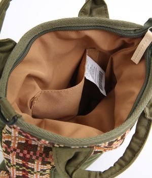 クラフト感のあるジャカード生地とタフな印象のポリエステル、それぞれ特性の異なった異素材を組み合わせました。チャームなどポイントにレザーを配して大人顔に。
