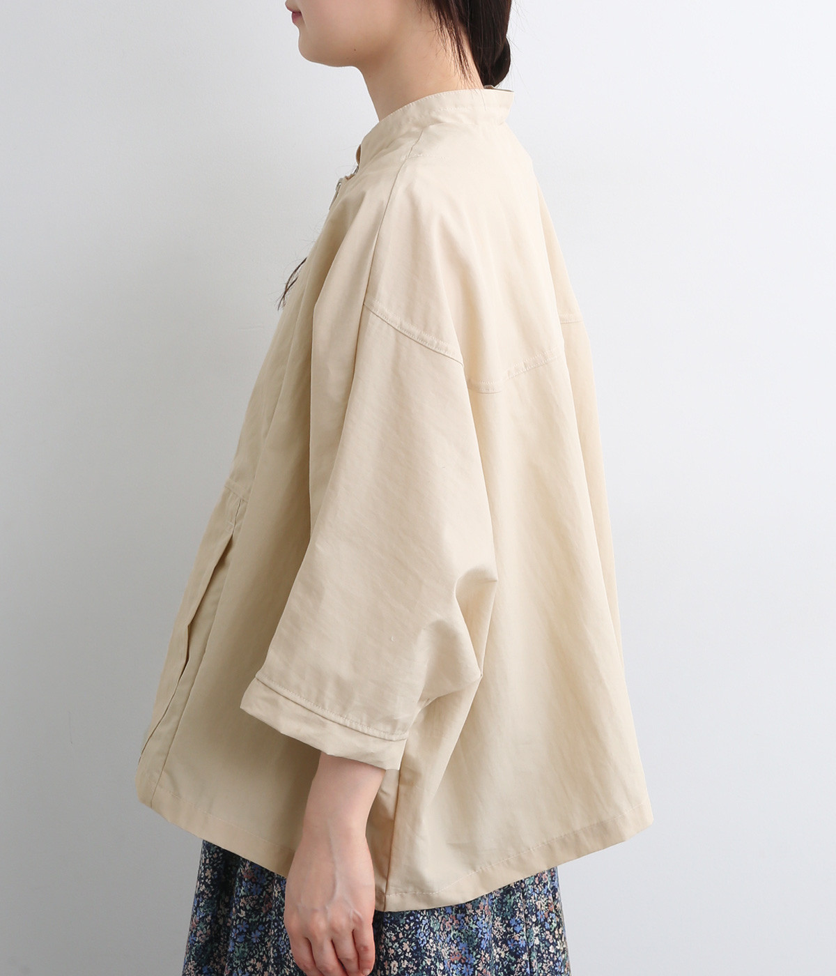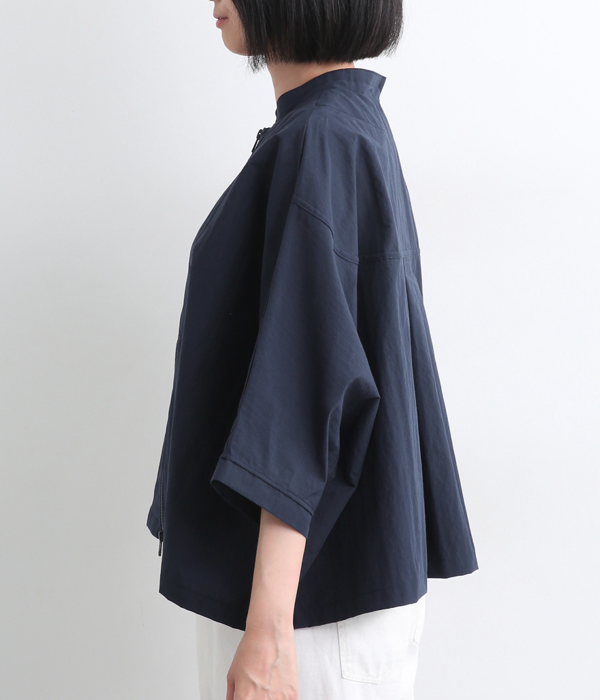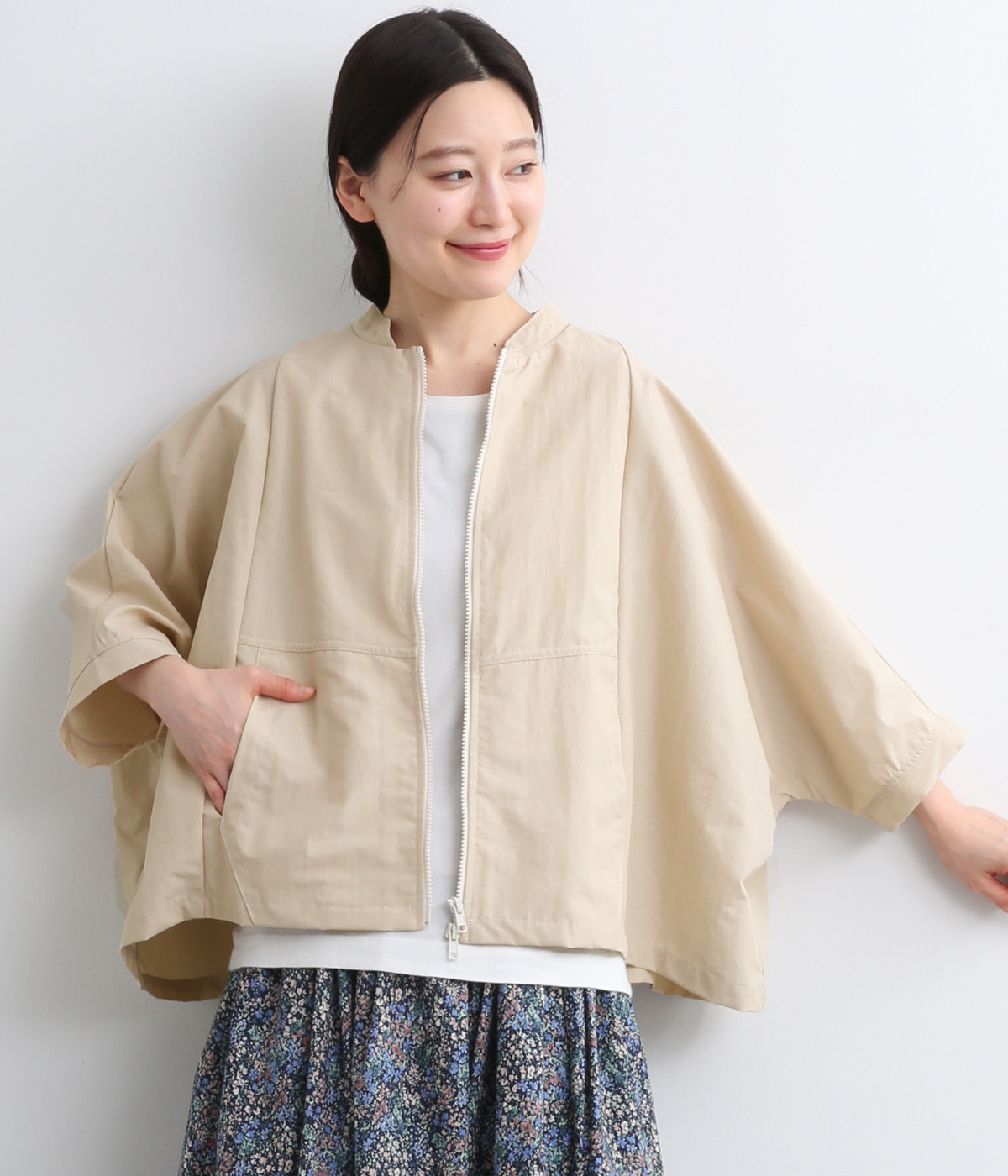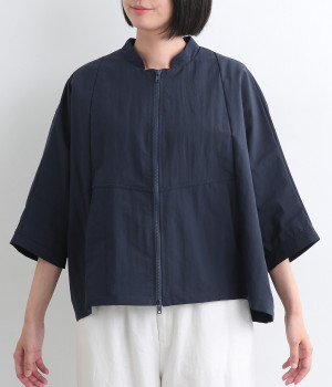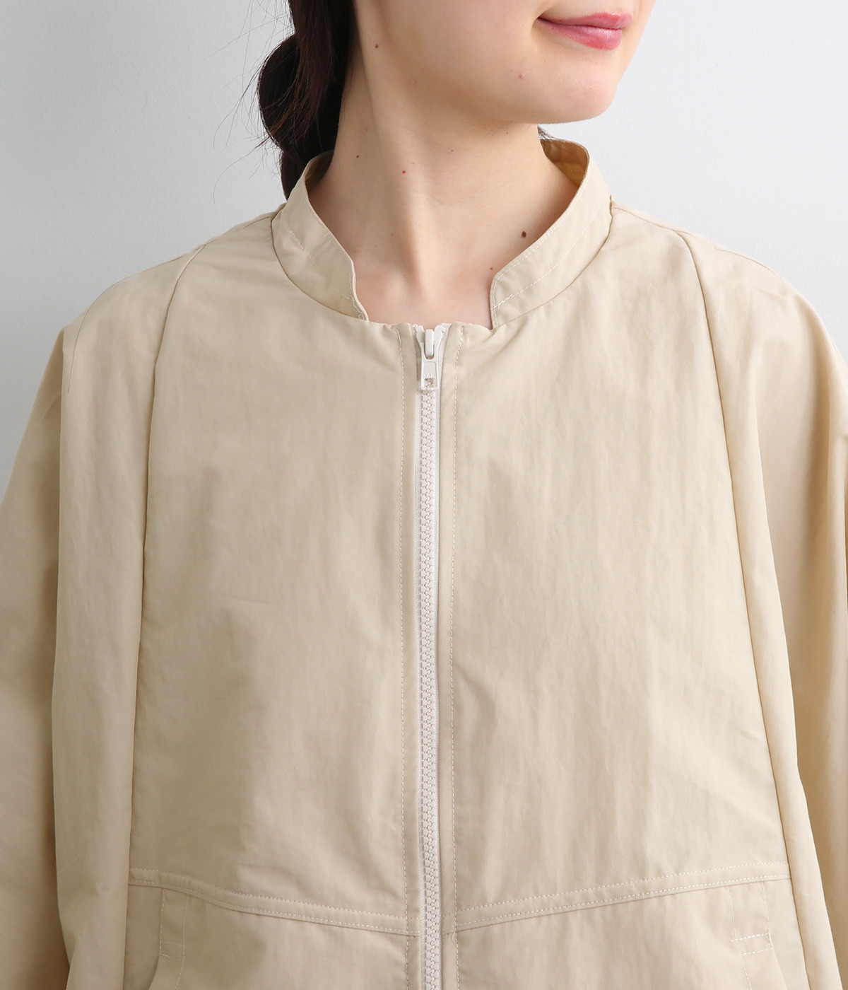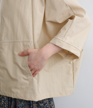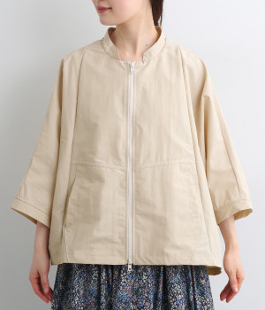 たっぷりと身幅をとった構築的なドルマンシルエットが魅力のアウター。上下両方向から開閉できるダブルジップ仕様で、着こなしの幅が広がります。ステッチをきかせた低めのスタンドカラーが、さりげないこなれ感を演出します。