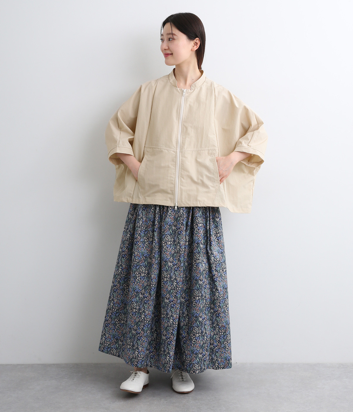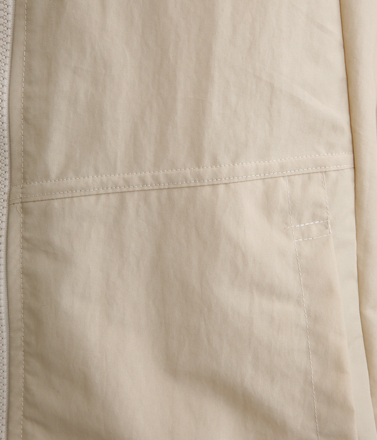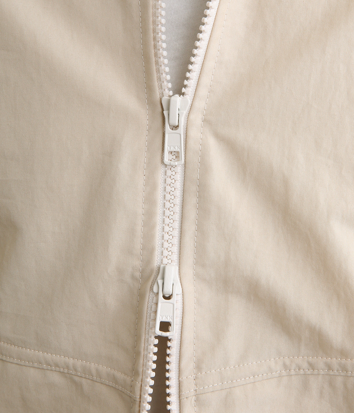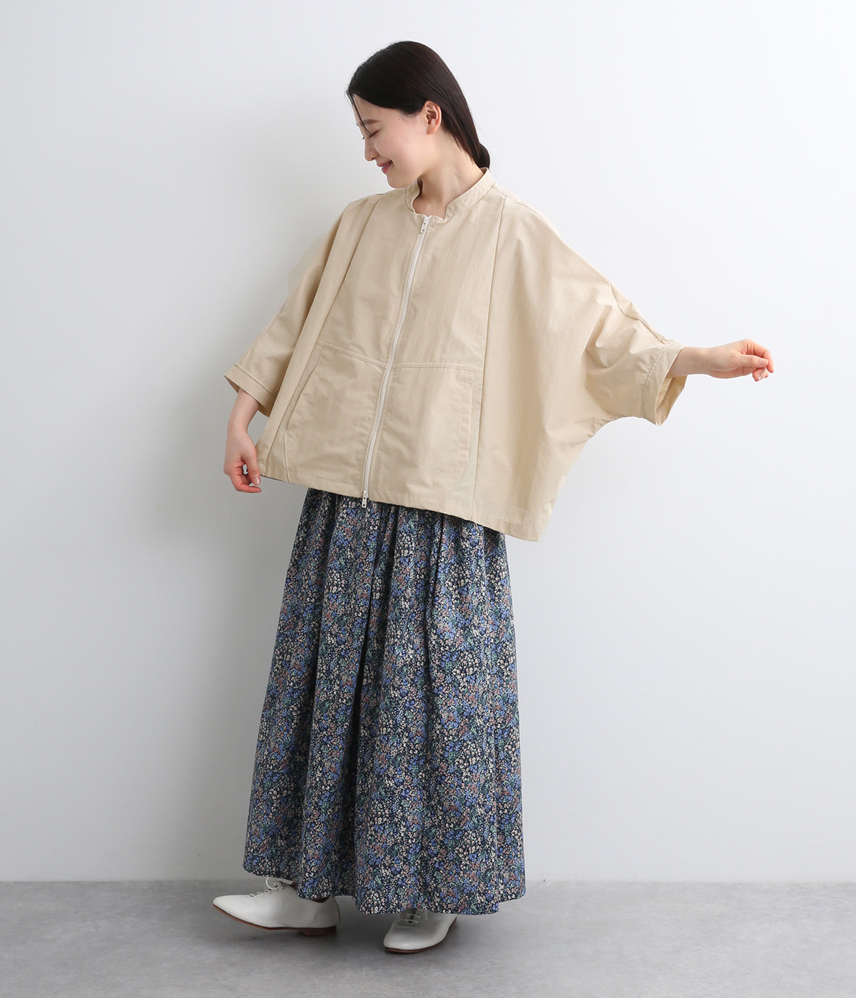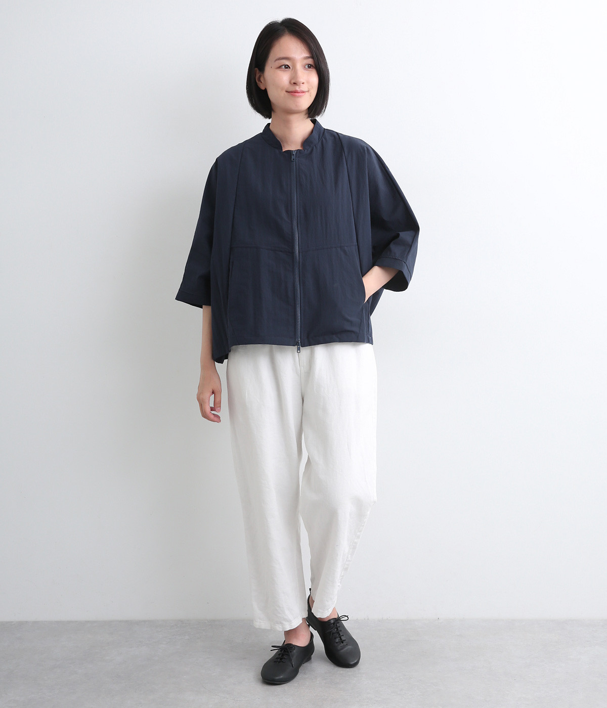 たっぷりと身幅をとった構築的なドルマンシルエットが魅力のアウター。上下両方向から開閉できるダブルジップ仕様で、着こなしの幅が広がります。ステッチをきかせた低めのスタンドカラーが、さりげないこなれ感を演出します。