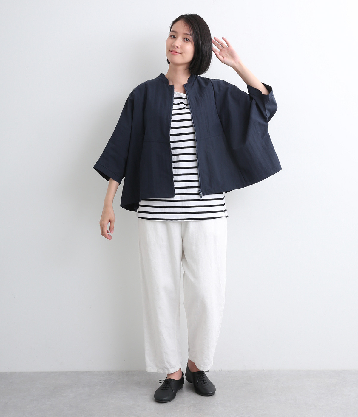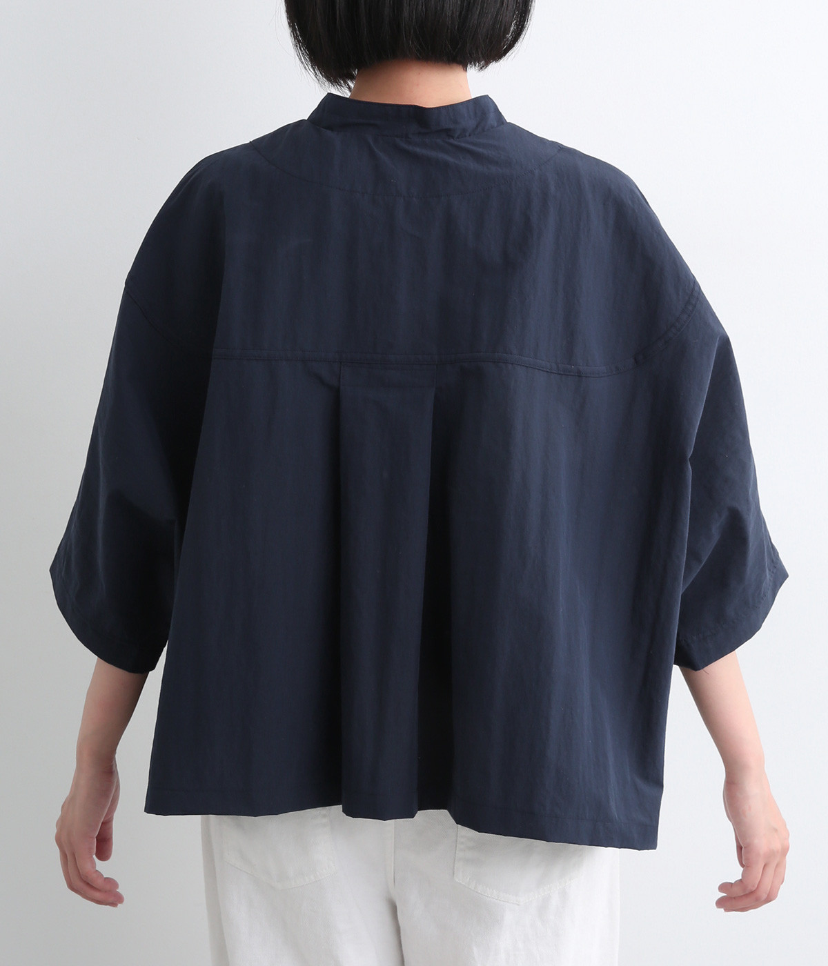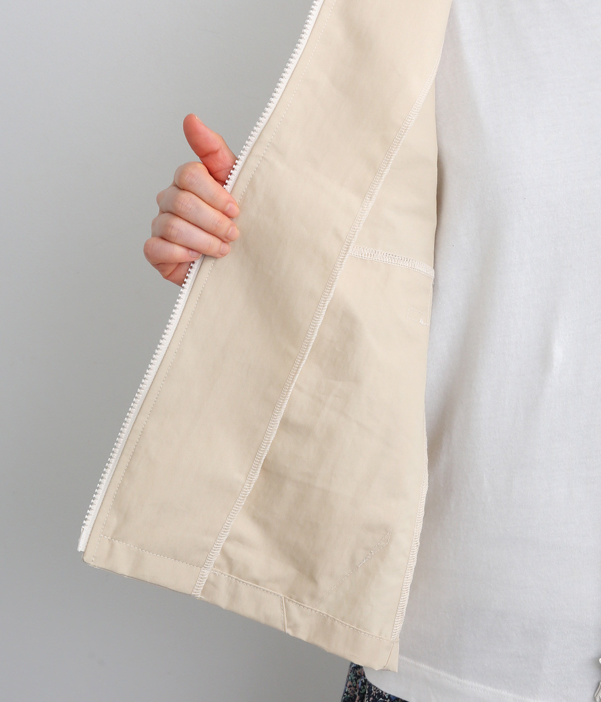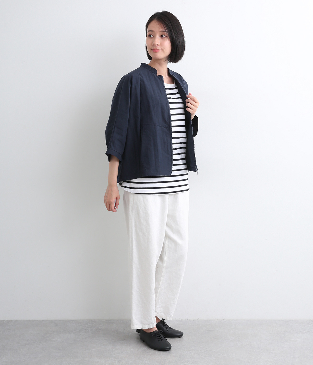 たっぷりと身幅をとった構築的なドルマンシルエットが魅力のアウター。上下両方向から開閉できるダブルジップ仕様で、着こなしの幅が広がります。ステッチをきかせた低めのスタンドカラーが、さりげないこなれ感を演出します。