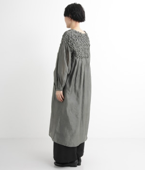 maahとナチュランのコラボレーションです。民族衣装のサリーにも使われるコットンとシルクを混紡した生地で仕立てたワンピースです。襟元全体にはハンドスモッキングで、時間とともに変わる日差しの重なりを表現。手仕事ならではのやわらかく、やさしい仕上がりです。生地は空気を含んだような軽やかな風合いで、共布の裏地をつけることでストレスのない着心地にも配慮。袖のエアリーな膨らみが女性らしく、フォーマルシーンなどの特別な日の装いにもぴったり。華やかな気持ちを後押しするような、存在感のある一枚です。