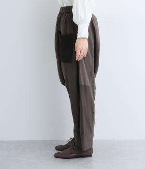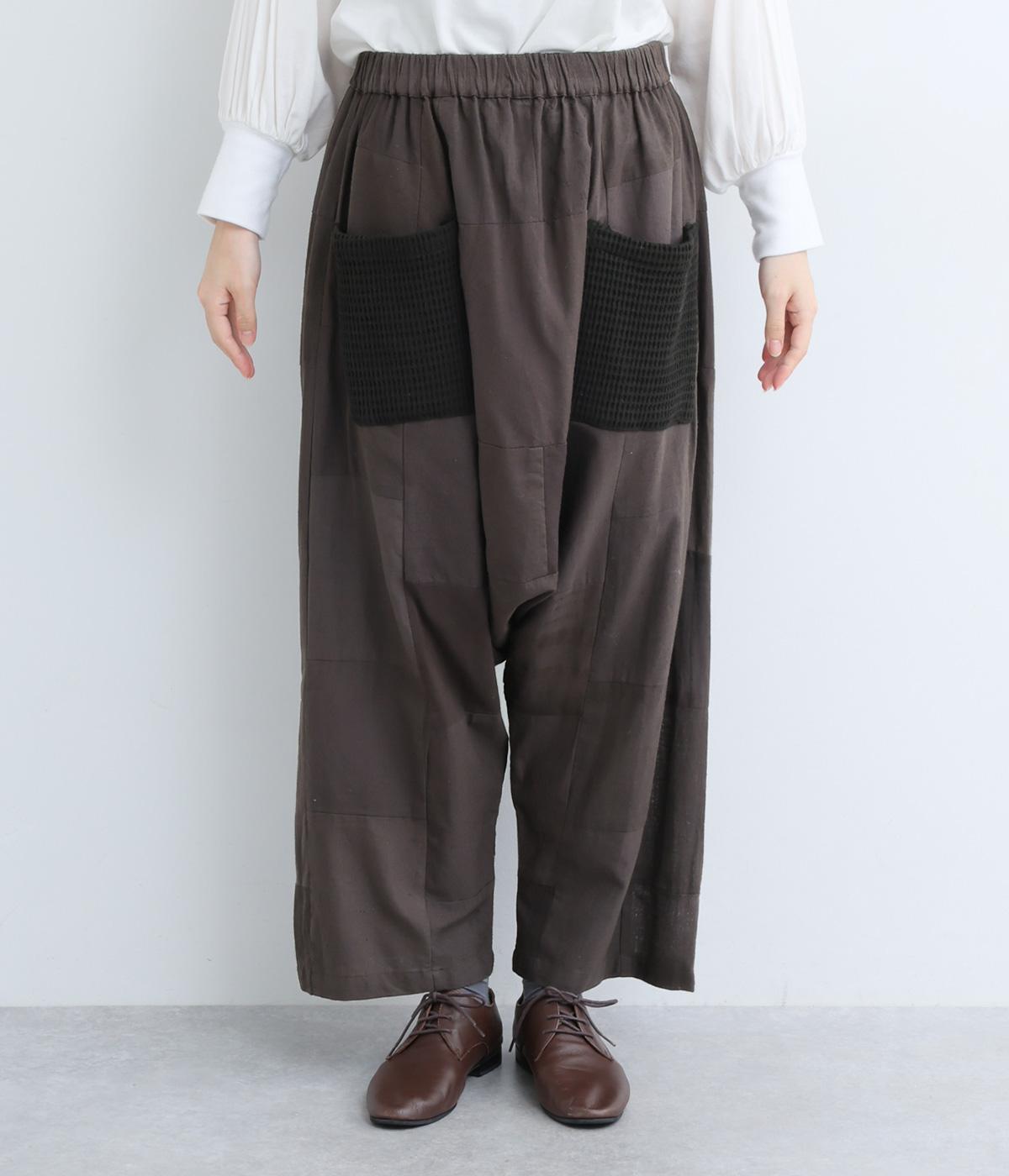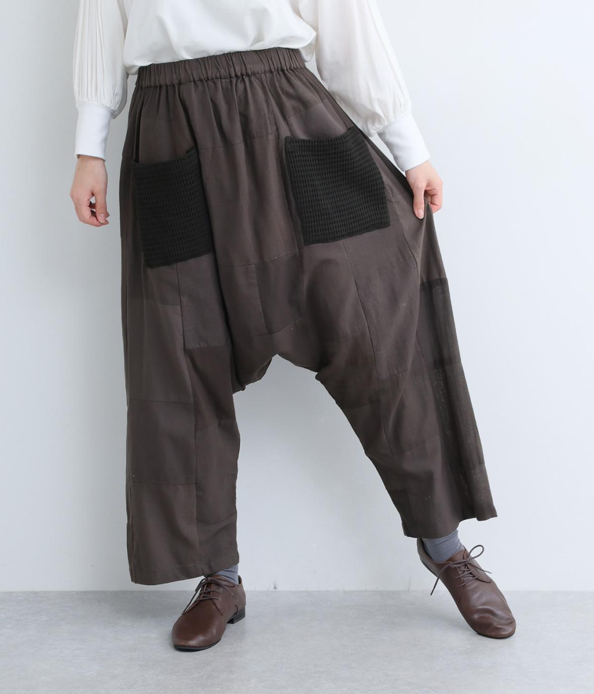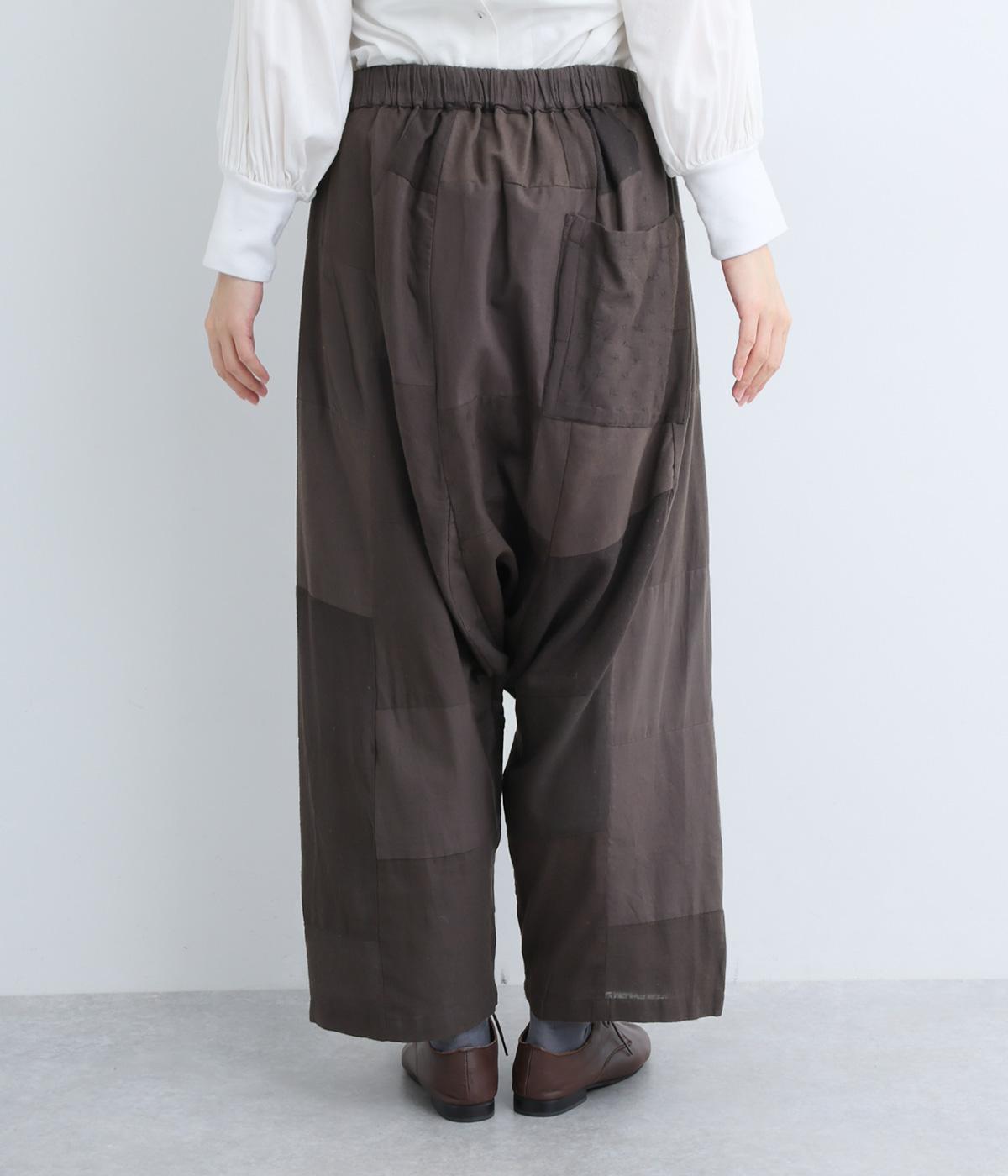 パッチワークがアクセントの、ゆったりとしたサイジングを堪能できるパンツです。腰まわりのギャザーとストレートのシルエットが美しい落ち感を表現。ウエストラインは総ゴムで安心感も◎。パッチワークの独特な立体感で、体型を選ばず着用できます。