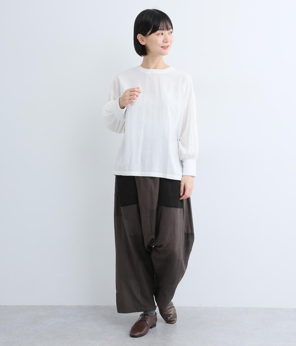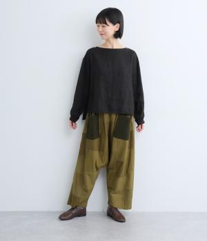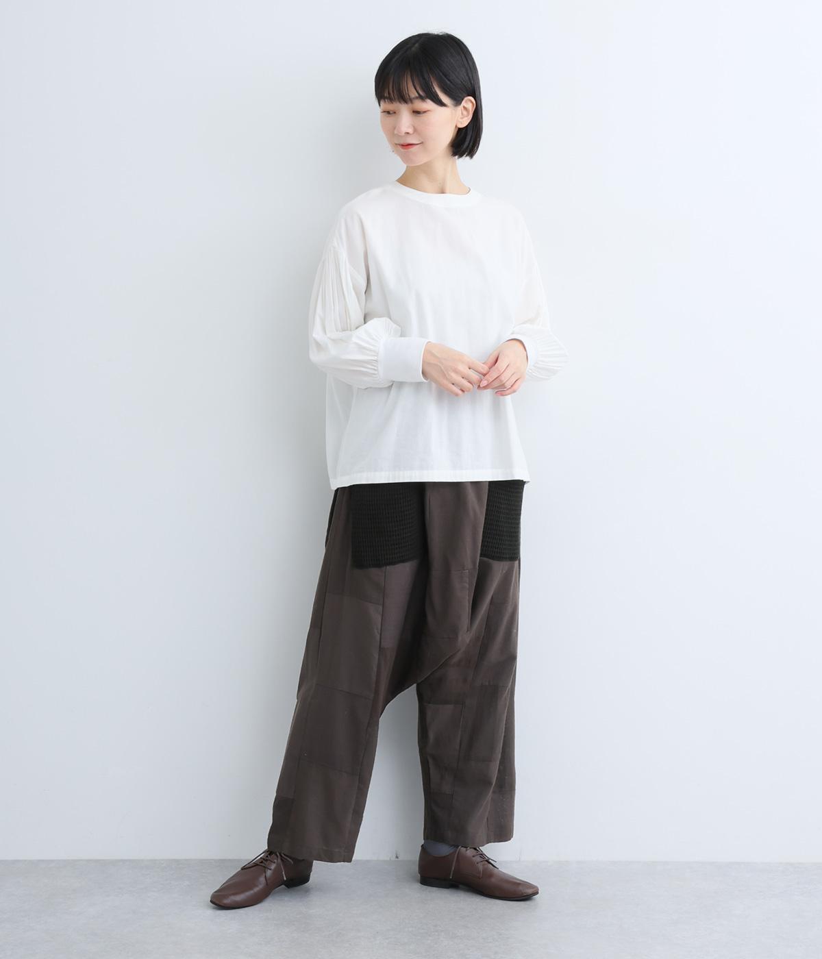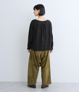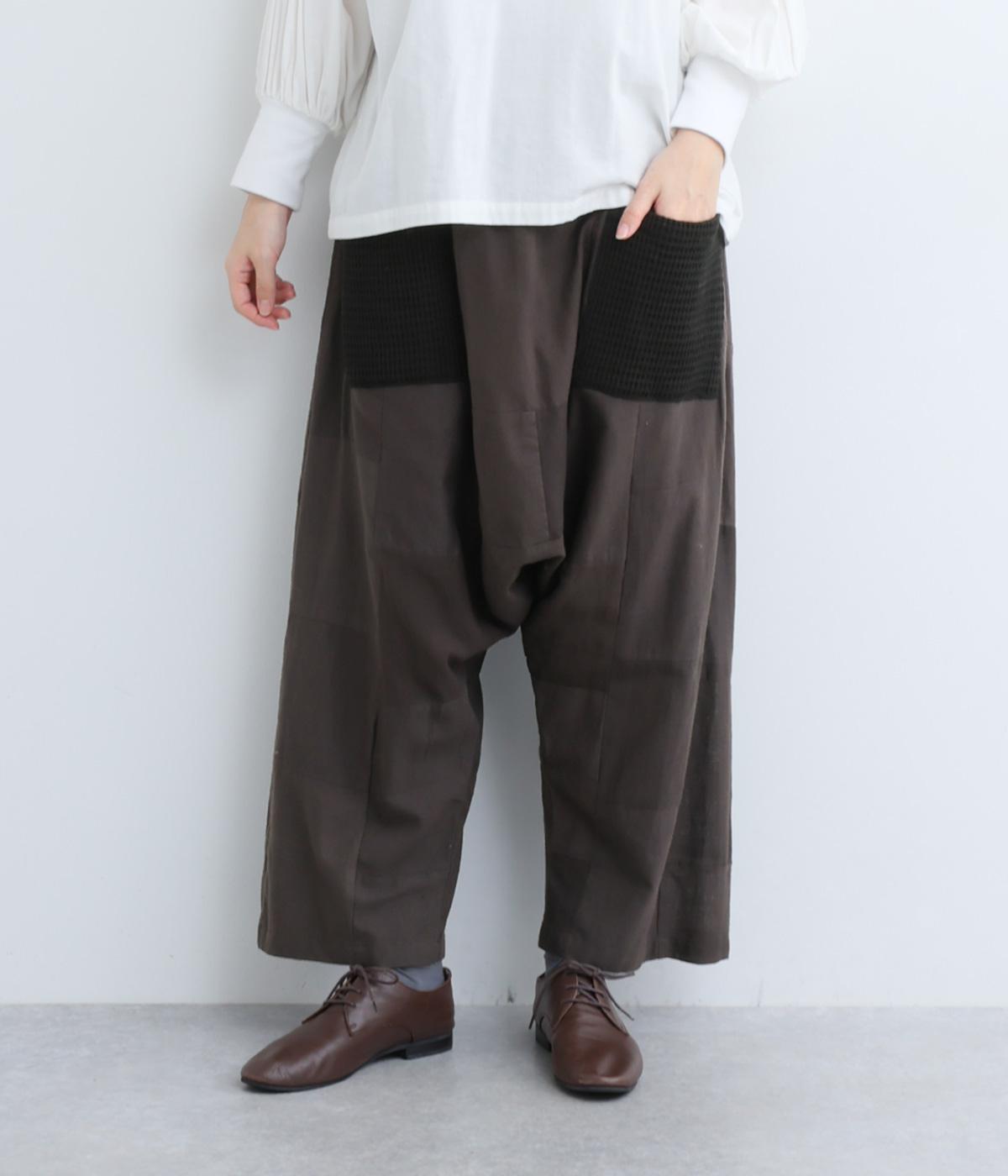 パッチワークがアクセントの、ゆったりとしたサイジングを堪能できるパンツです。腰まわりのギャザーとストレートのシルエットが美しい落ち感を表現。ウエストラインは総ゴムで安心感も◎。パッチワークの独特な立体感で、体型を選ばず着用できます。
