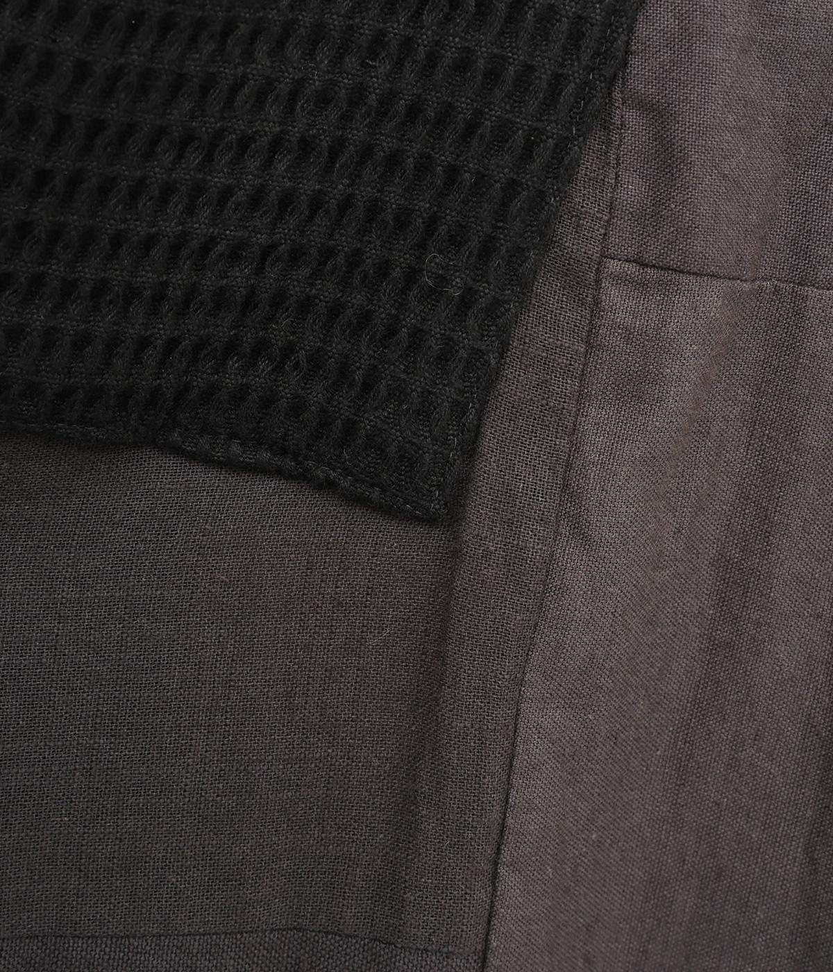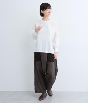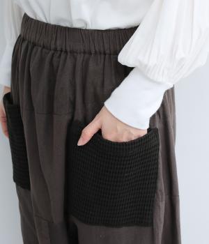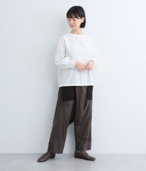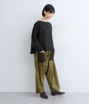 やわらかなコットン素材を使用。通気性があり、サラリと快適に着こなせます。ポケットは大きめの編み方がユニークな素材。ほっとした気持ちにさせてくれる、そんな心地よさが特徴の素材感です。