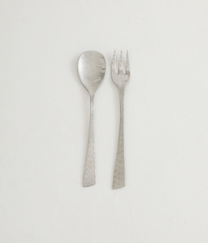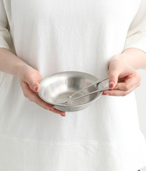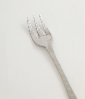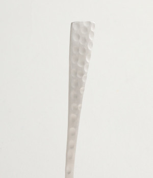 シンプルでいるのにどこか印象的な槌目(つちめ)模様のフルーツフォークです。槌目とは型を作った後に、ひとつひとつ金づちでたたきこんで作られるデザイン。叩いて凹凸を付けることによって強度があがり、無機質なステンレスに独特な表情が生まれます。シンプルでありながらニュアンスのあるスプーンは飽きがこず長くお使いただけます。