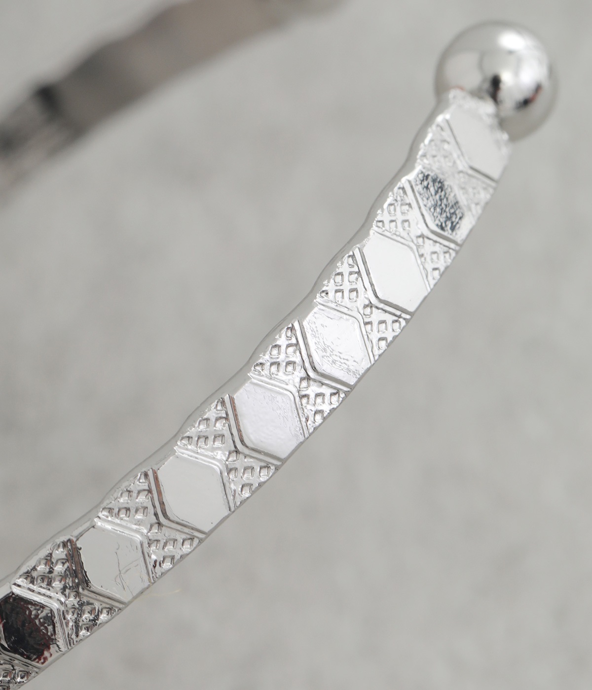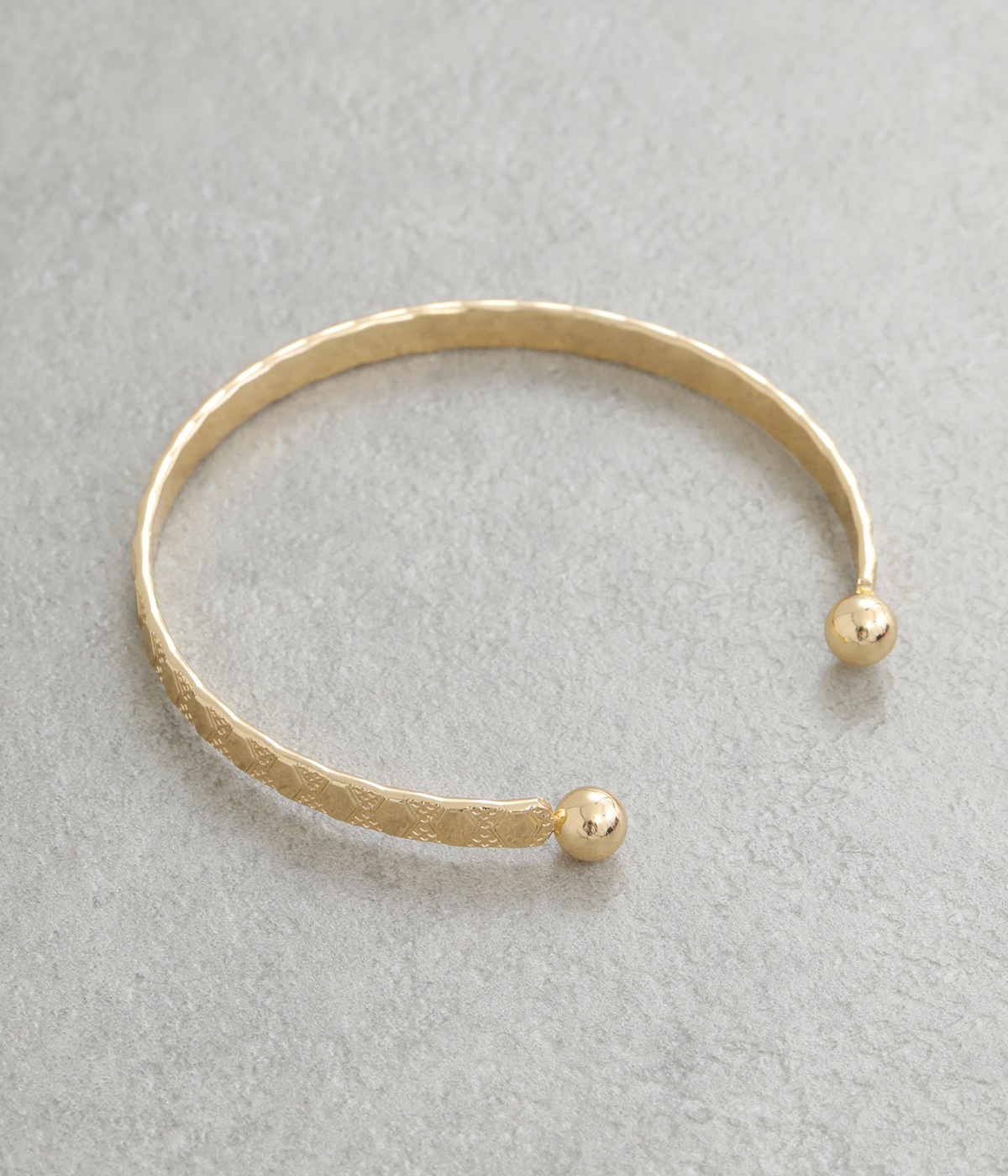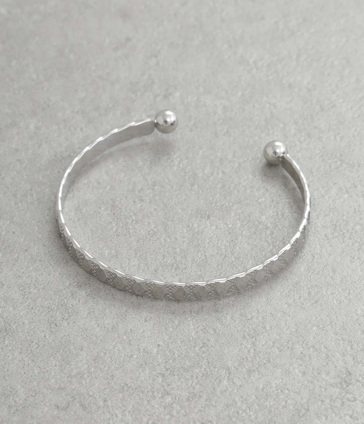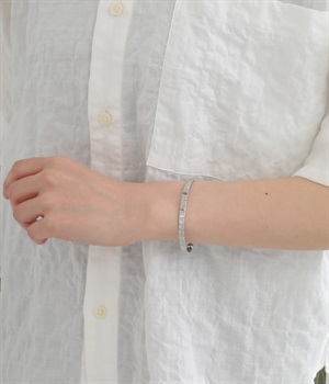 細身に作られているので手首を華奢に演出し、他のバングルやブレスレットとの重ねづけにもおすすめ。両端にボールのようなディテールをあしらっているのがポイントです。デザイン性を上げるこだわりのテクスチャーに注目を。