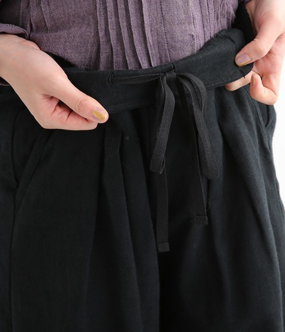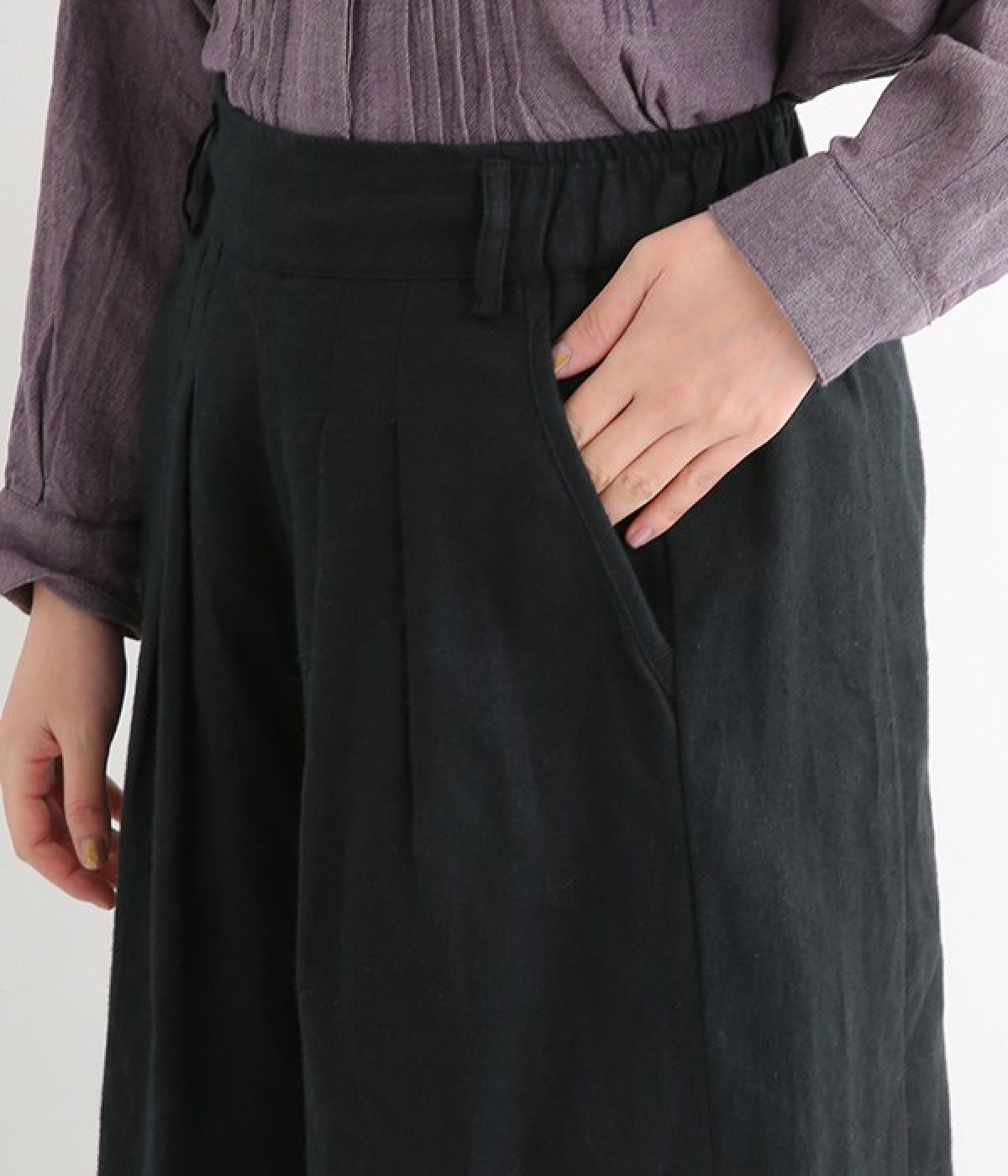 リネンの起毛素材を使用した、あたたかな風合いのワイドパンツです。ウエストにタックを施し、ワタリ幅も余裕を持たせたゆったりとした作り。リラックスした雰囲気が大人のナチュラルスタイルに寄り添います。ウエストは後ろゴム仕様ではきやすく、前はすっきりとしているのでトップスを軽くインしても好バランス。両サイドポケット付きで、デイリー使いにぴったりです。