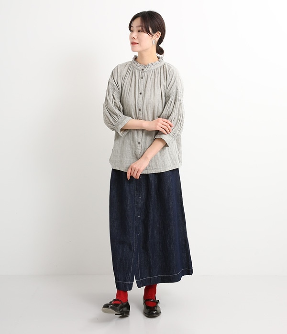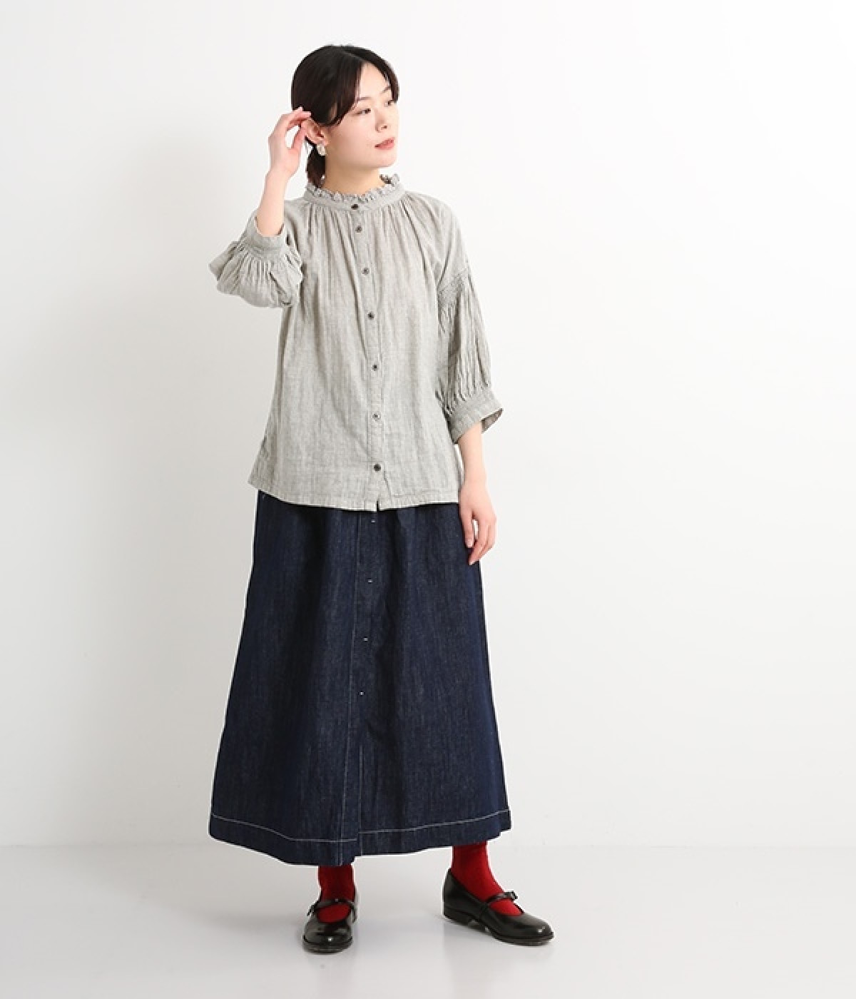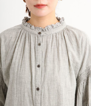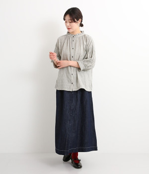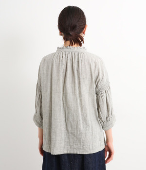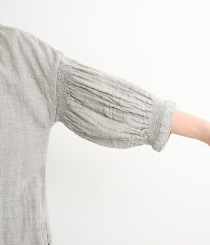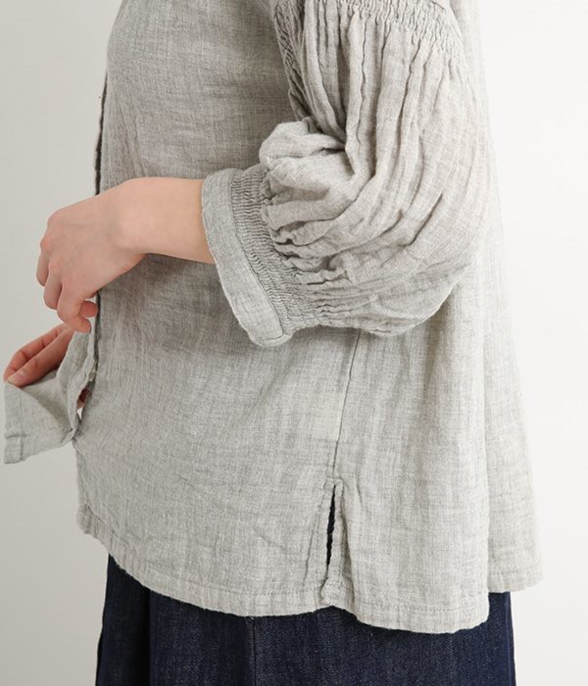 やわらかな肌触りが気持ちいい、リネンコットンの先染めダブルガーゼ生地を使用した7分袖のブラウスです。落ち着きのある杢調カラーで甘すぎないデザインに仕上げました。黒貝調ボタンが上品な印象。ボトムスにはスカートをあわせてきれいめに、デニムパンツをあわせてカジュアルにと幅広いコーディネートに活躍してくれます。