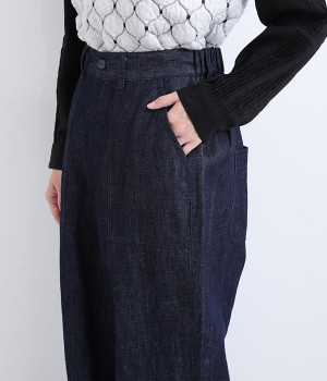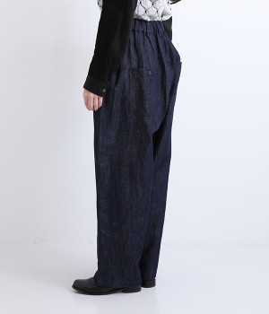 しっかりと丈夫なコットンリネンのデニム素材で仕立てたパンツです。ゆったりとしたシルエットがラフな雰囲気を醸し出し、大人のデイリーカジュアルに重宝する一本。フロントボタンと大きなポケットがポイントです。ウエストは後ろがゴム仕様のイージータイプで締めつけにくく、心地良く穿きこなせます。