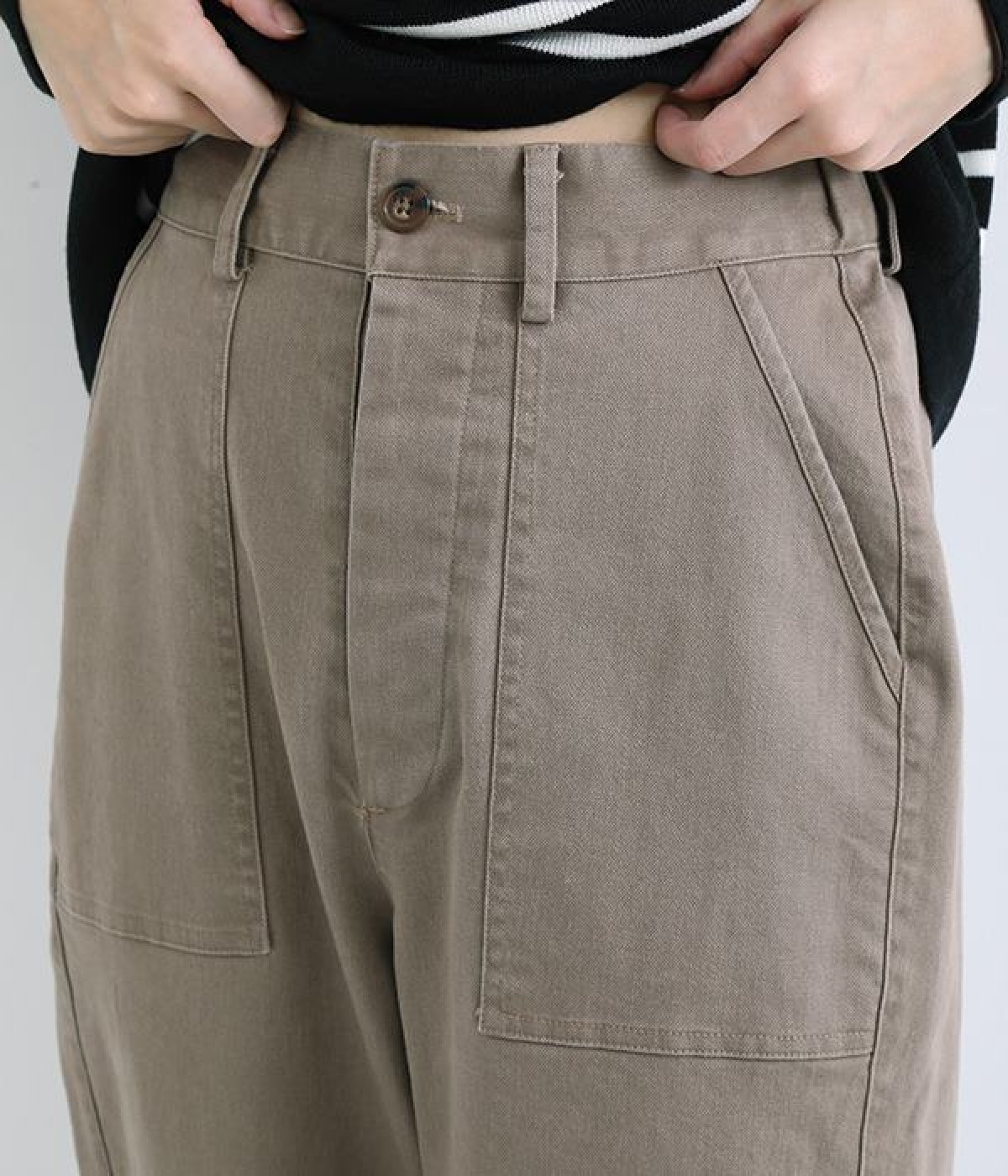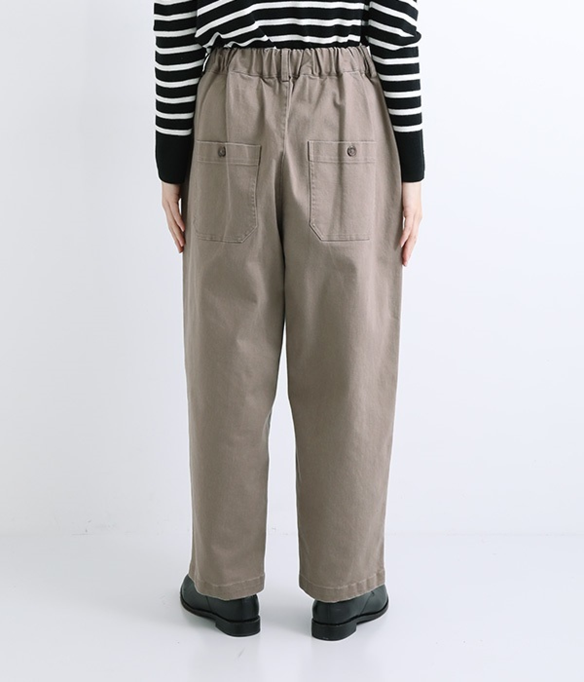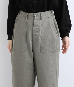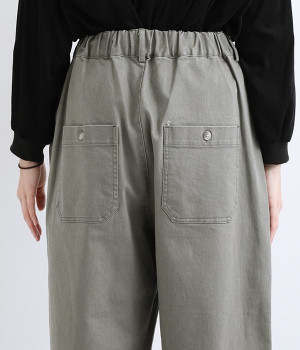 きれいめな染料顔料を施し、製品洗い加工をすることでナチュラルなフェイドアウト感を表現した生地使いのパンツです。大きなフロントポケットがポイント。ゆったりとしたシルエットでラフな雰囲気を醸し出します。ウエストは後ろのみゴム仕様で心地よく着用でき、ゆるさのあるカジュアルスタイルに重宝する一着です。