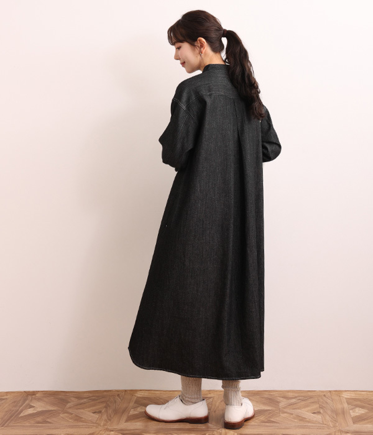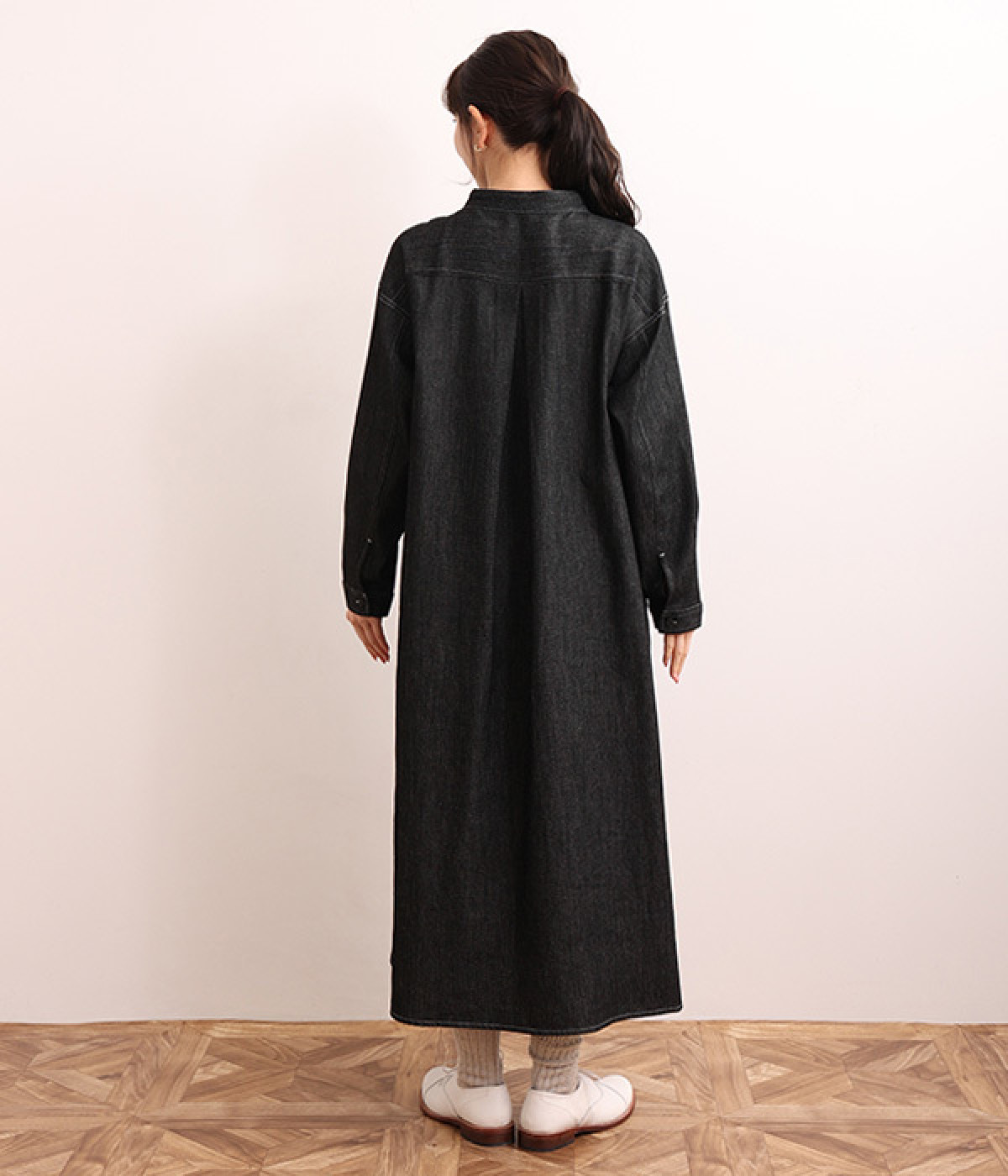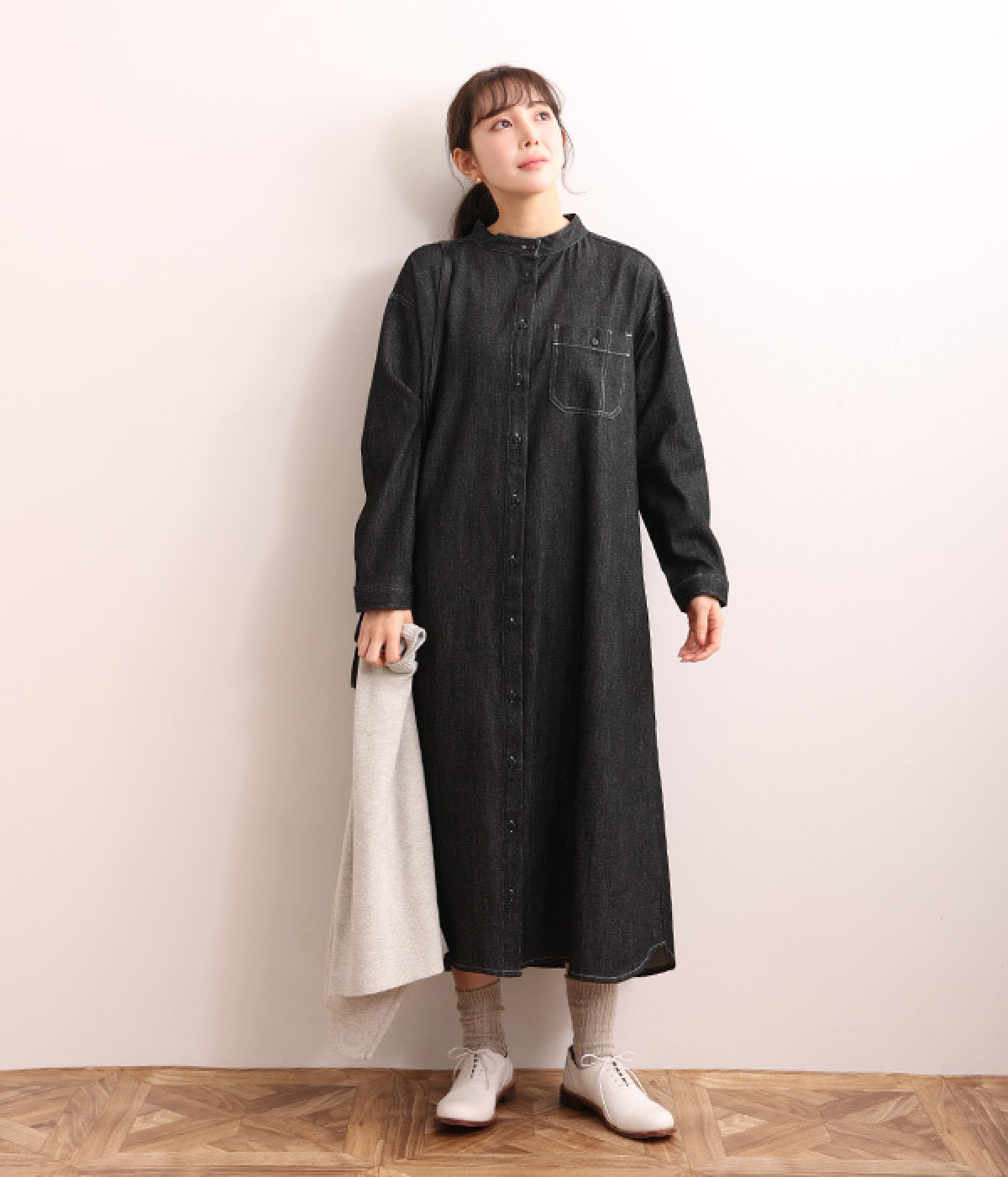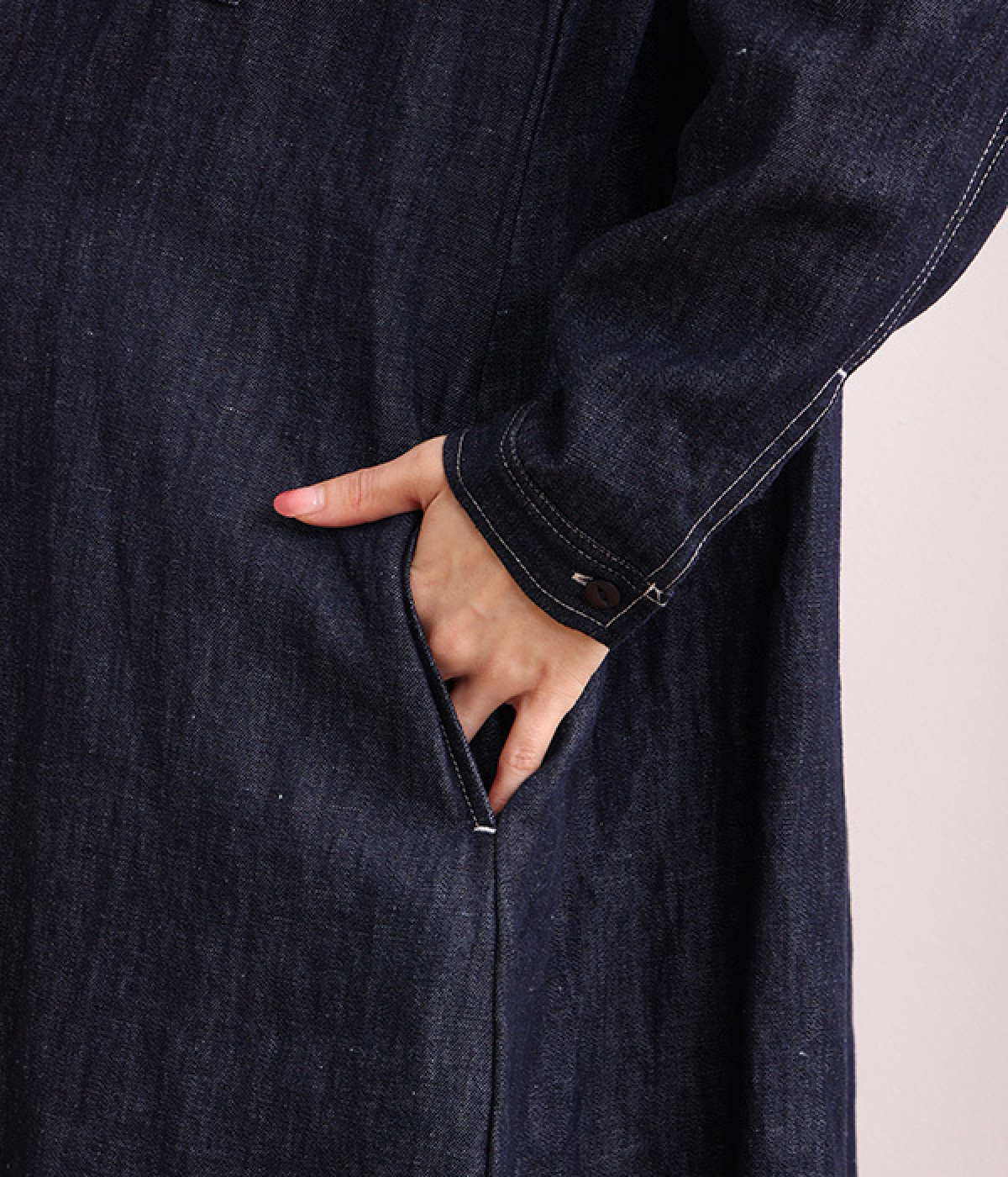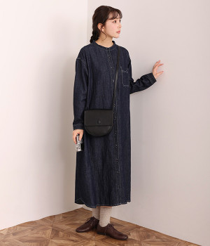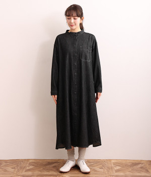 洗いざらしのリネンコットン生地で織り上げた、着こなすほどに肌になじんでいくシャツワンピース。深い色合いのデニム地のため、配色ステッチやネップ、織りの糸がよく見えるナチュラルな顔つきの一枚です。ゆとりのあるサイズに仕上げているので、単体での着用だけでなく重ね着がマストになる季節にも活躍。フロントと袖口には身生地と色を合わせた猫目ボタンをあしらってかわいらしいポイントに。きちんとした印象のバンドカラーは、ラフな羽織りスタイルでも品の良さを保ってくれます。