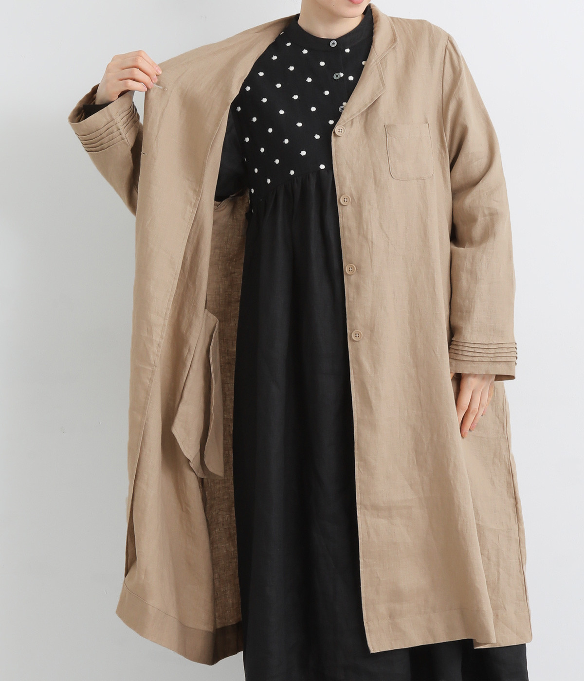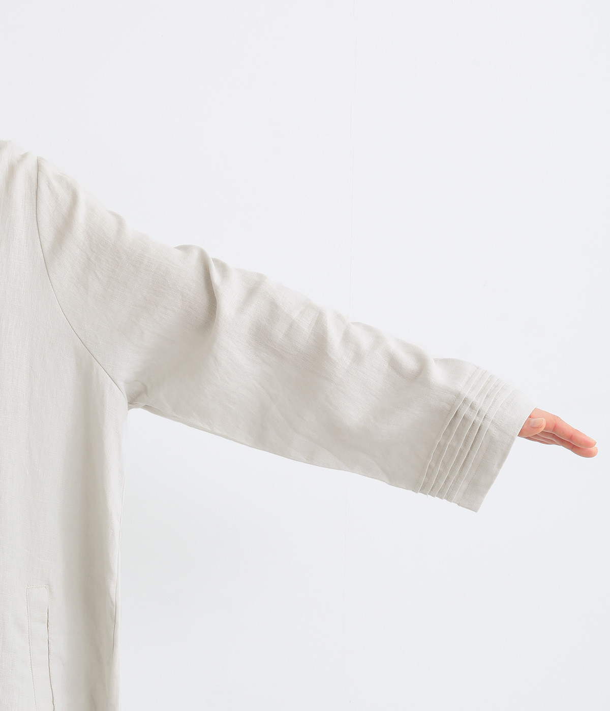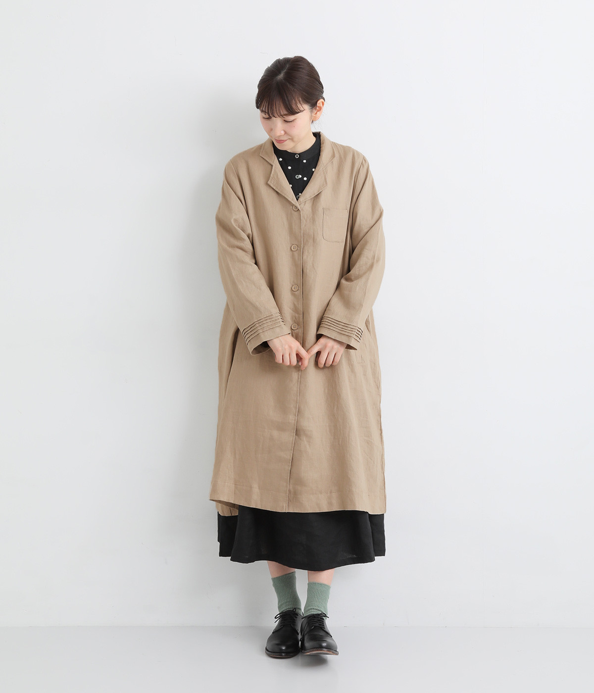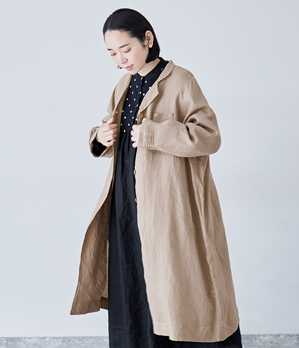 大人っぽく着られるロング丈のゆったりとしたコート。小さめの襟から裾にかけて広がる、きれいなAラインシルエットです。袖にはピンタックを施し、さりげないアクセントを添えています。後ろ裾には深めのスリット入りで、足さばきも軽快。
