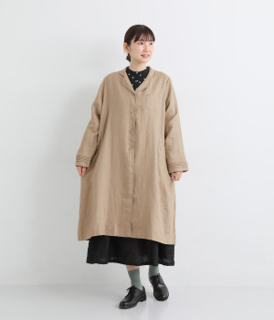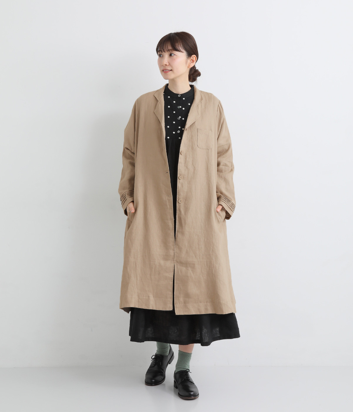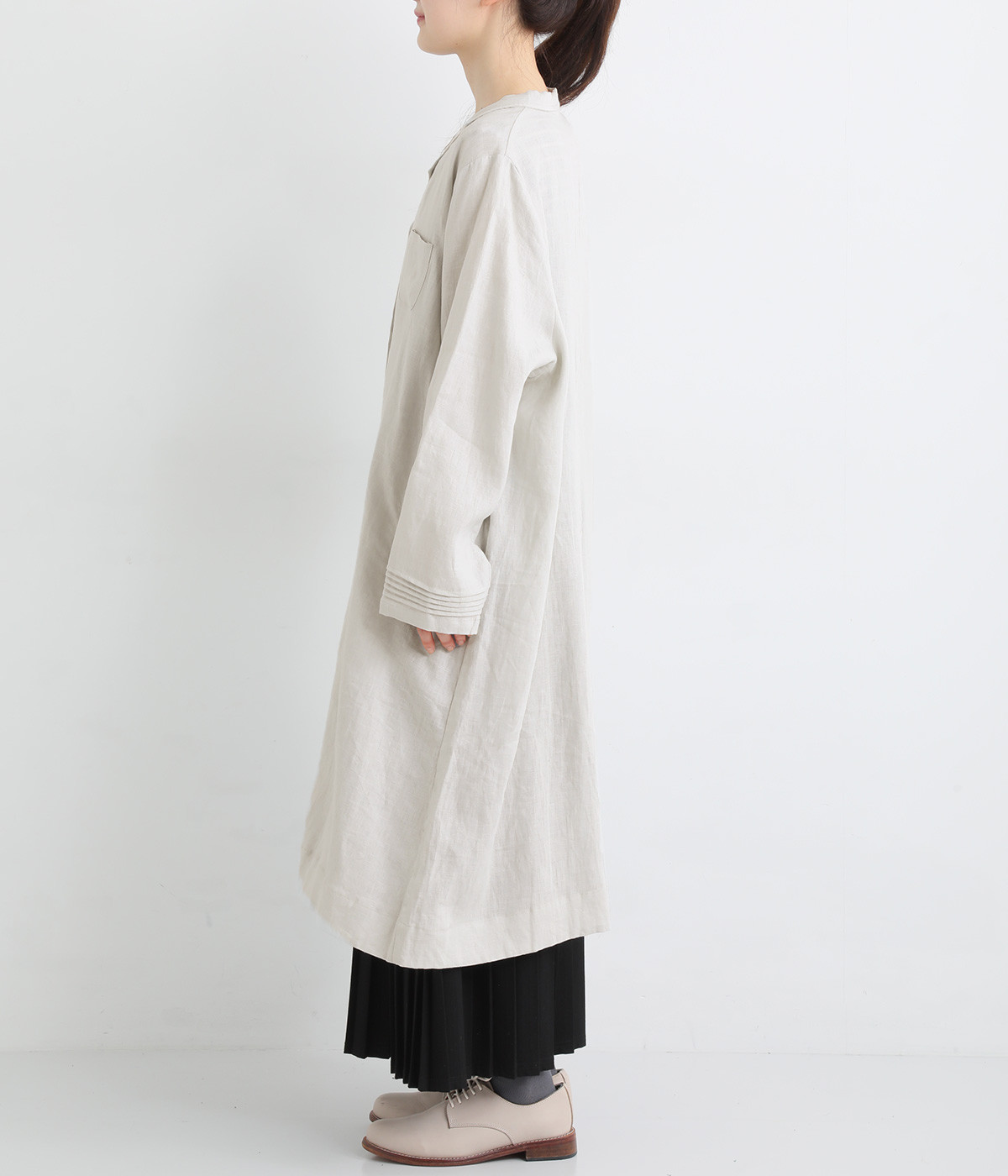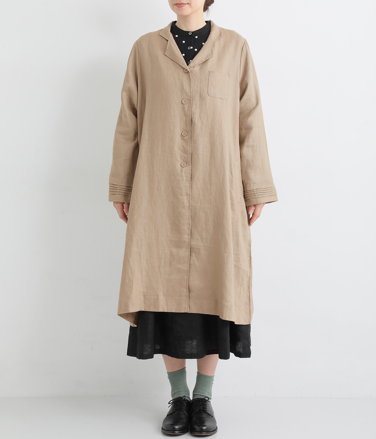 大人っぽく着られるロング丈のゆったりとしたコート。小さめの襟から裾にかけて広がる、きれいなAラインシルエットです。袖にはピンタックを施し、さりげないアクセントを添えています。後ろ裾には深めのスリット入りで、足さばきも軽快。