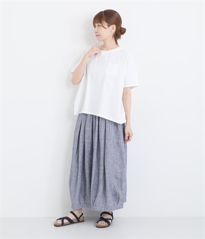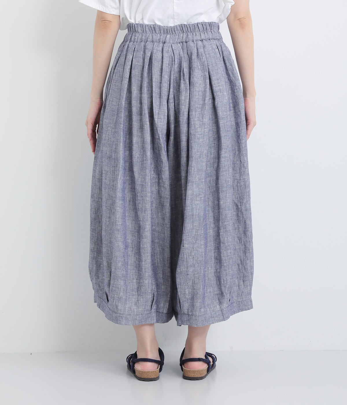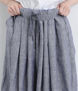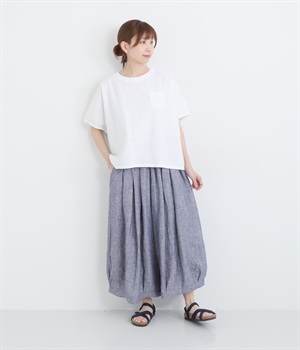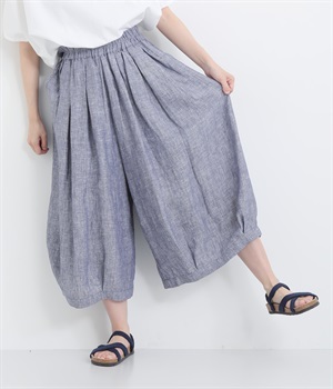 ウエストにふんだんにギャザーをほどこし ボリュームシルエットに裾タックで立体感のあるパンツです。ウエストは安定感のある太めの平ゴムで、トップスインしてもきれいに決まります。両サイドポケットつきで実用性も◎。
