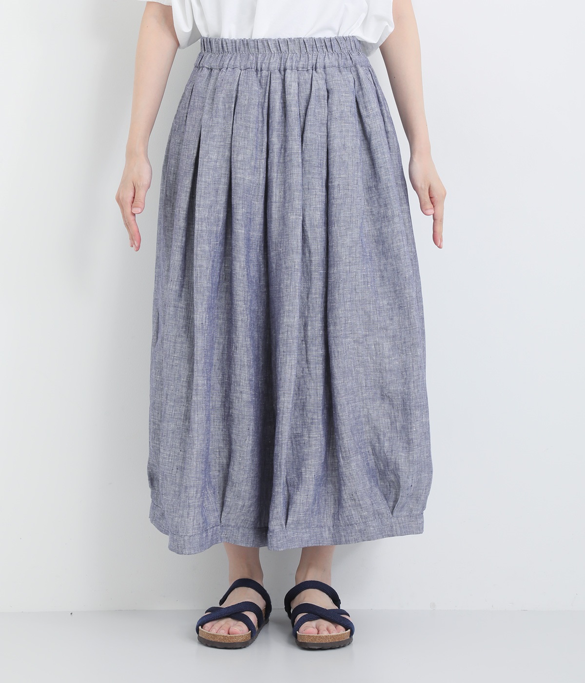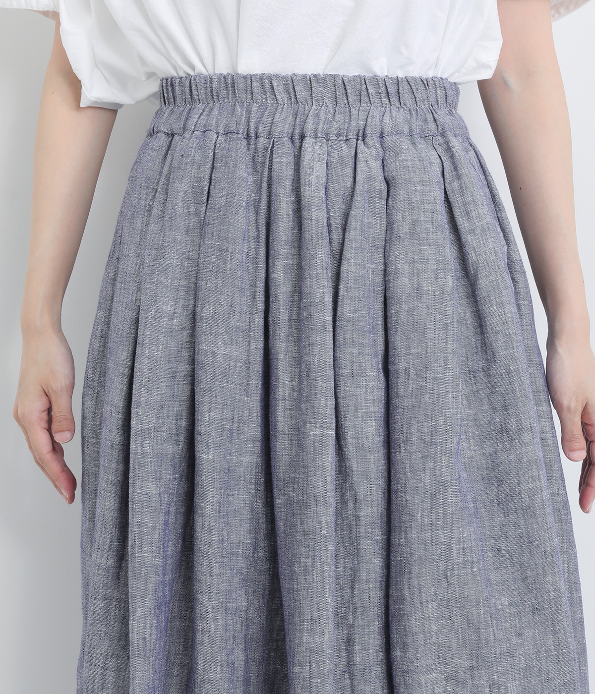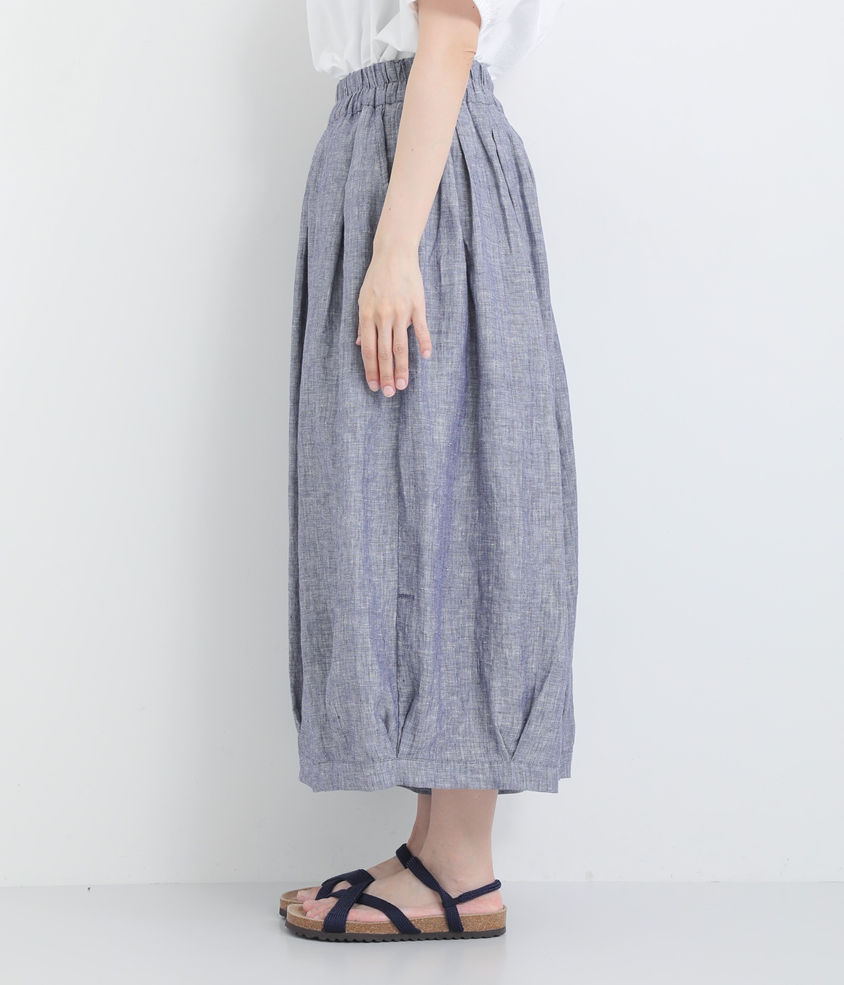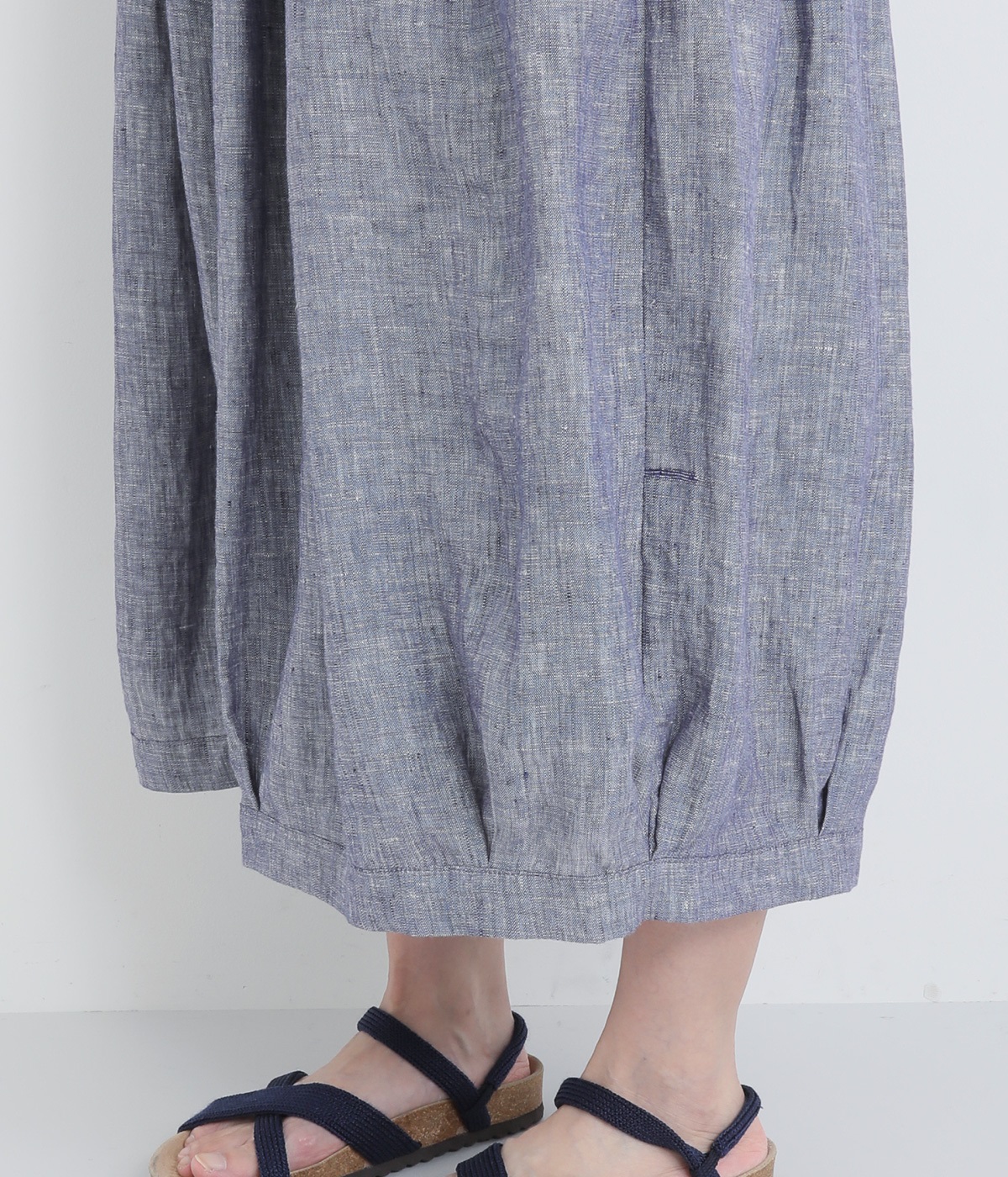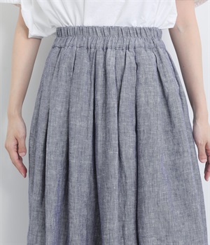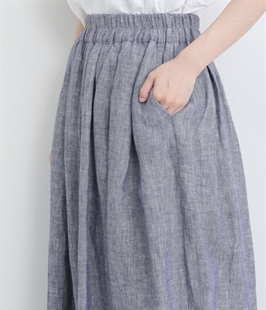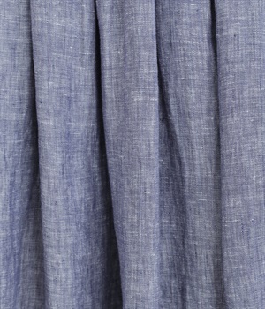 ナチュラルな風合いとさわやかな表情が魅力的なリネンシャンブレー生地を使用しました。リネン特有の質感を残しつつも着用初期からやわらかで、裏地をつけて透け感をおさえています。