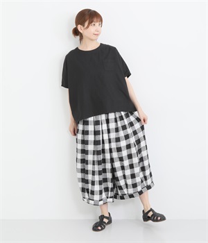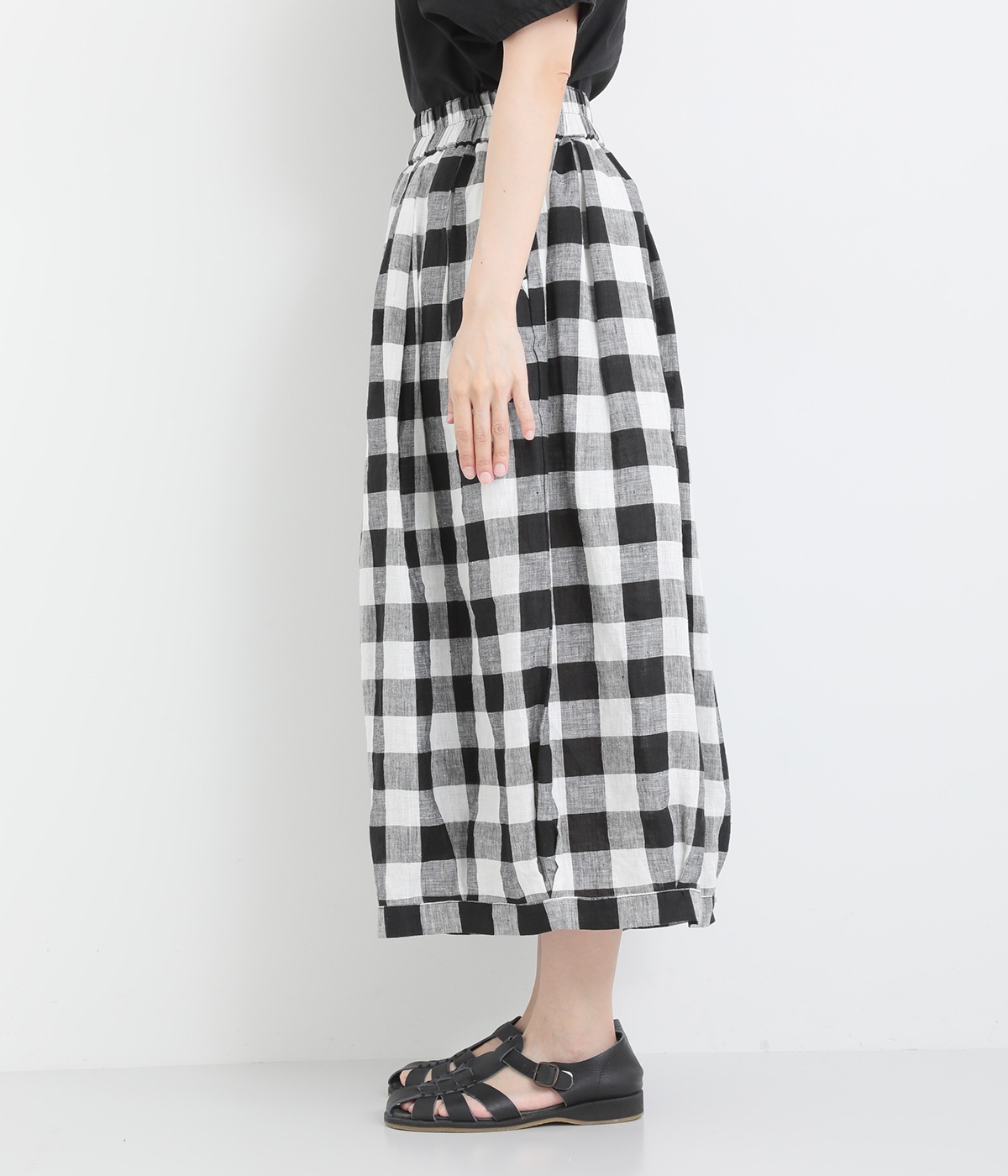 ナチュラルな風合いが魅力的なブロックチェックリネン生地を使用しています。さらりとした質感が着心地が良く、軽やかな薄手素材で見た目にもさわやか。裏地をつけて透け感を若干おさえました。