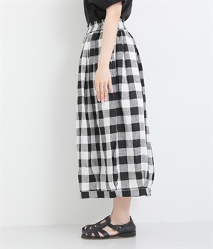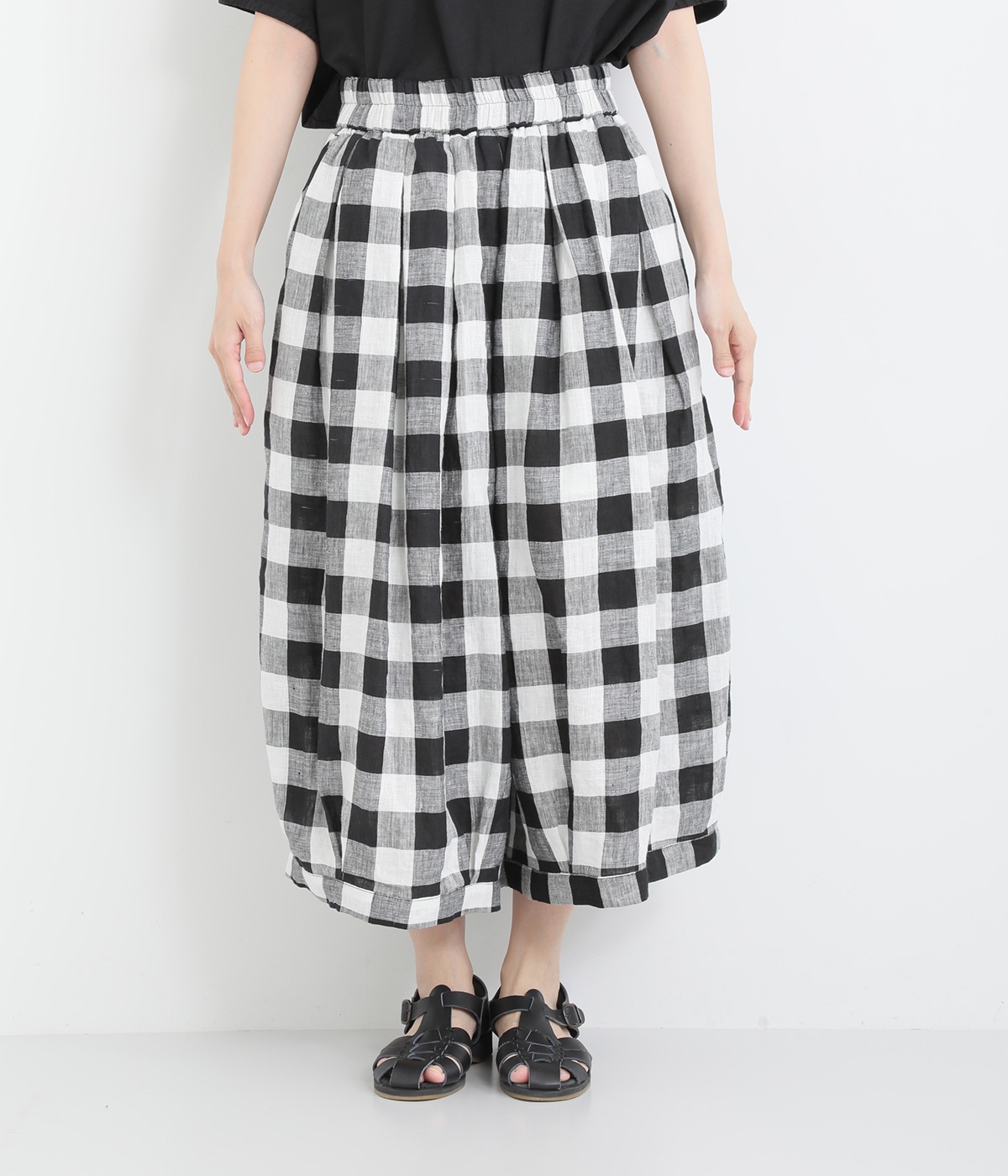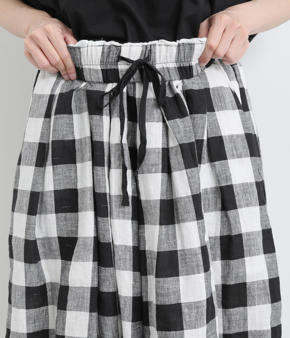 先染めのブロックチェック柄が着こなしになじみやすくもポイント使いになるパンツです。ウエストにギャザーを入れてボリュームを出し、裾タックで立体感をプラス。ウエストはトップスインもきれいに決まる太めの平ゴム仕様です。