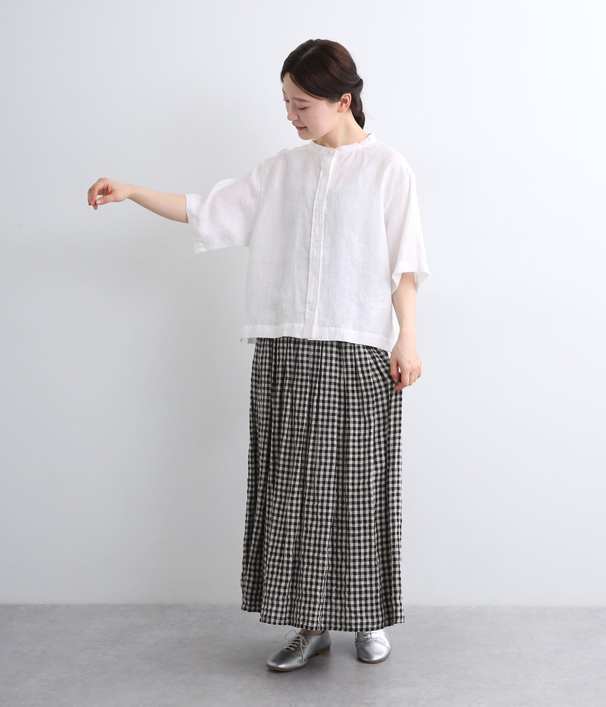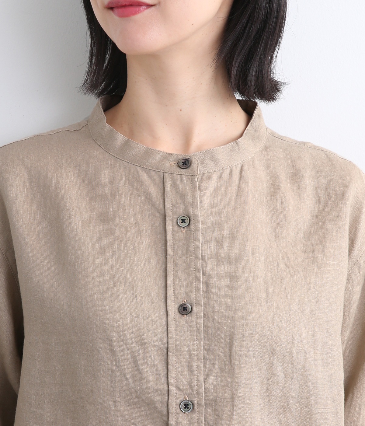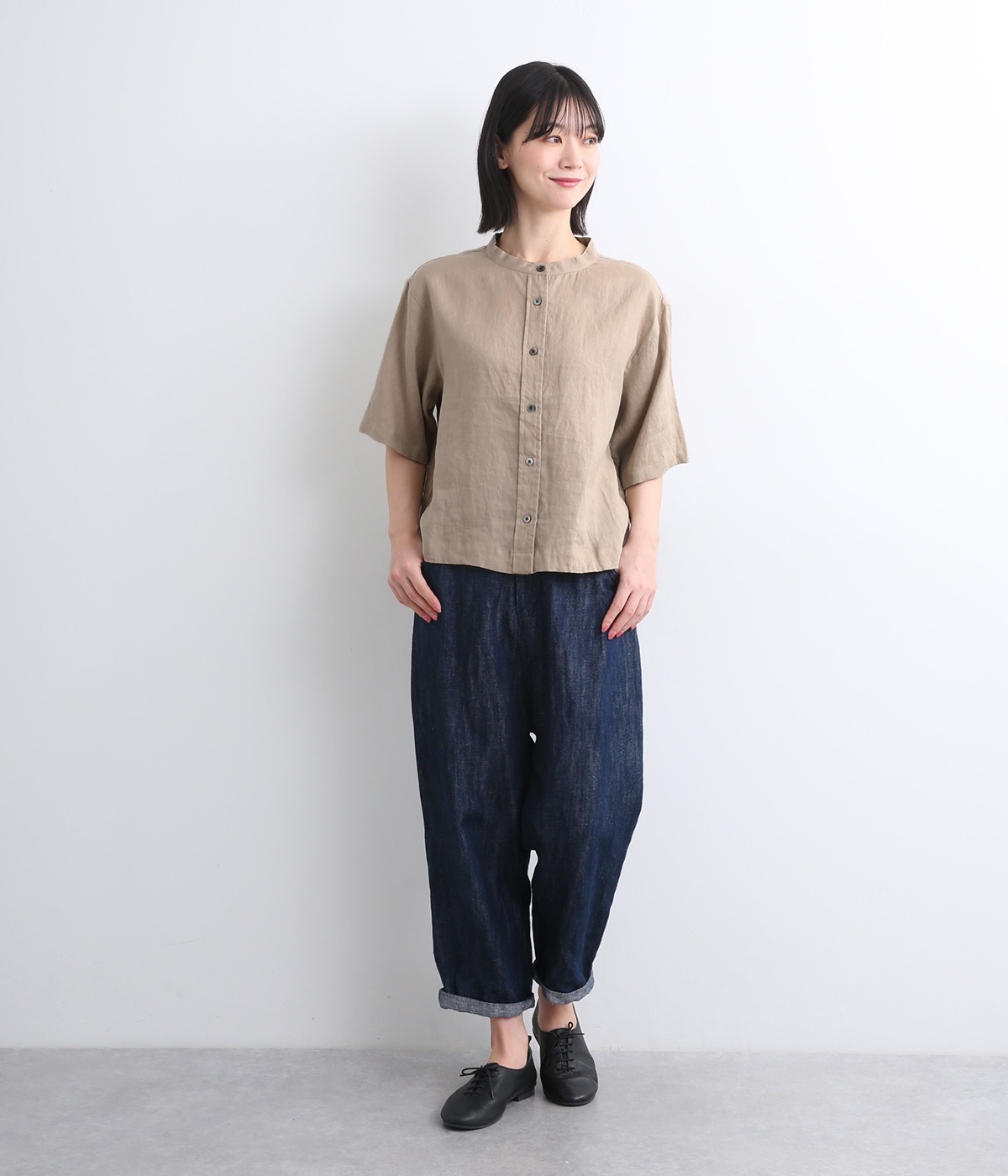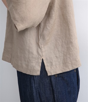 リネン素材ならではの、ふっくらとしたハリ感とナチュラルな風合いが魅力の生地。吸湿性・速乾性に優れ、汗をかいてもさらっと快適な着心地が続きます。