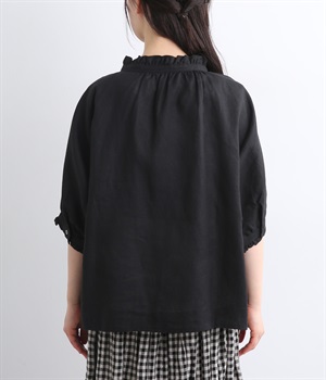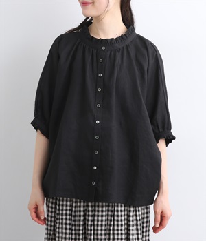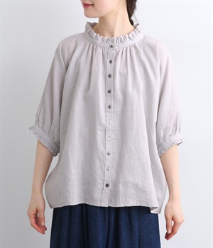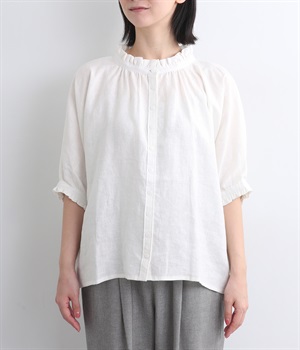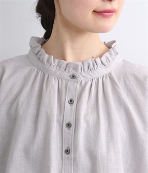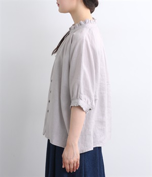 手元や顔まわりに華やかさをプラスするフリル仕立てのブラウス。体がゆったりと泳ぐドルマンシルエットで、リラックス感あふれるやわらかなフォルムに。前立てにはシェルボタンをあしらい、上品なアクセントを添えました。