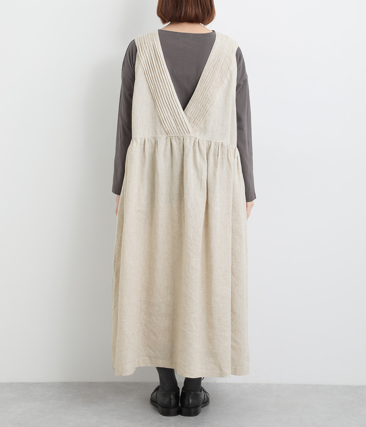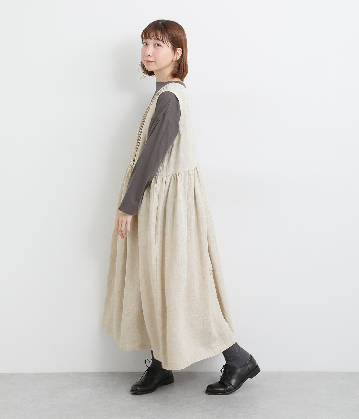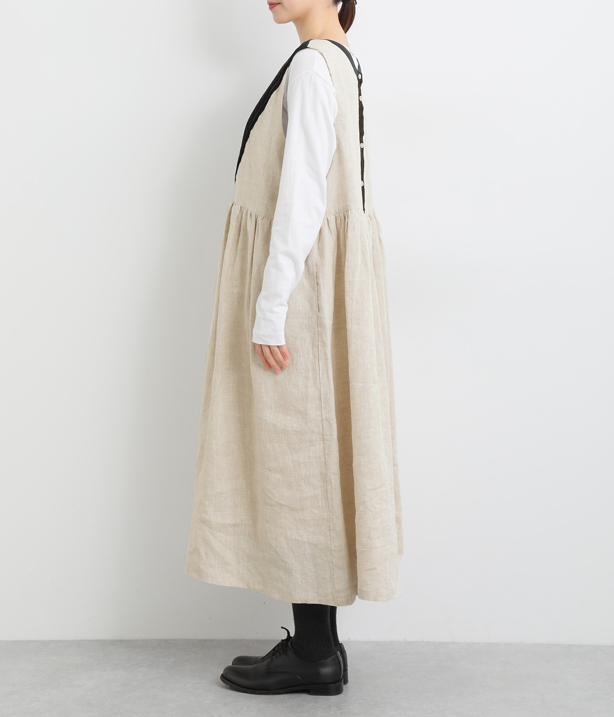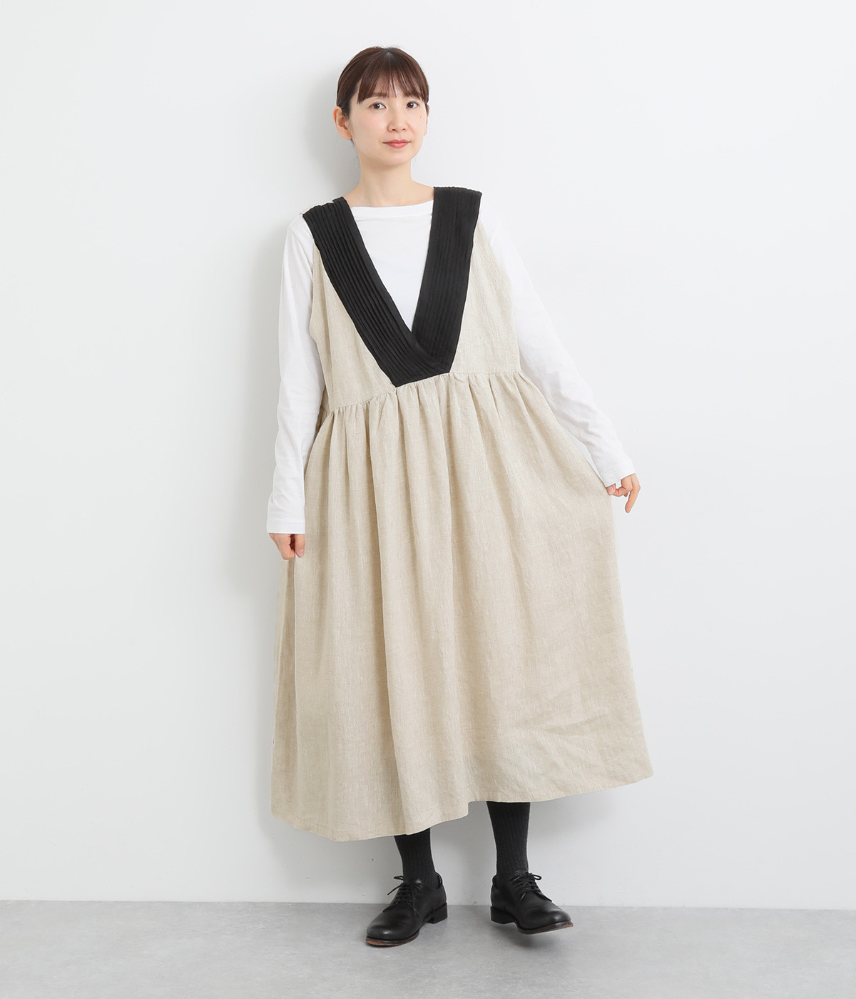 切り替えにギャザーを入れたゆとりのあるシルエット