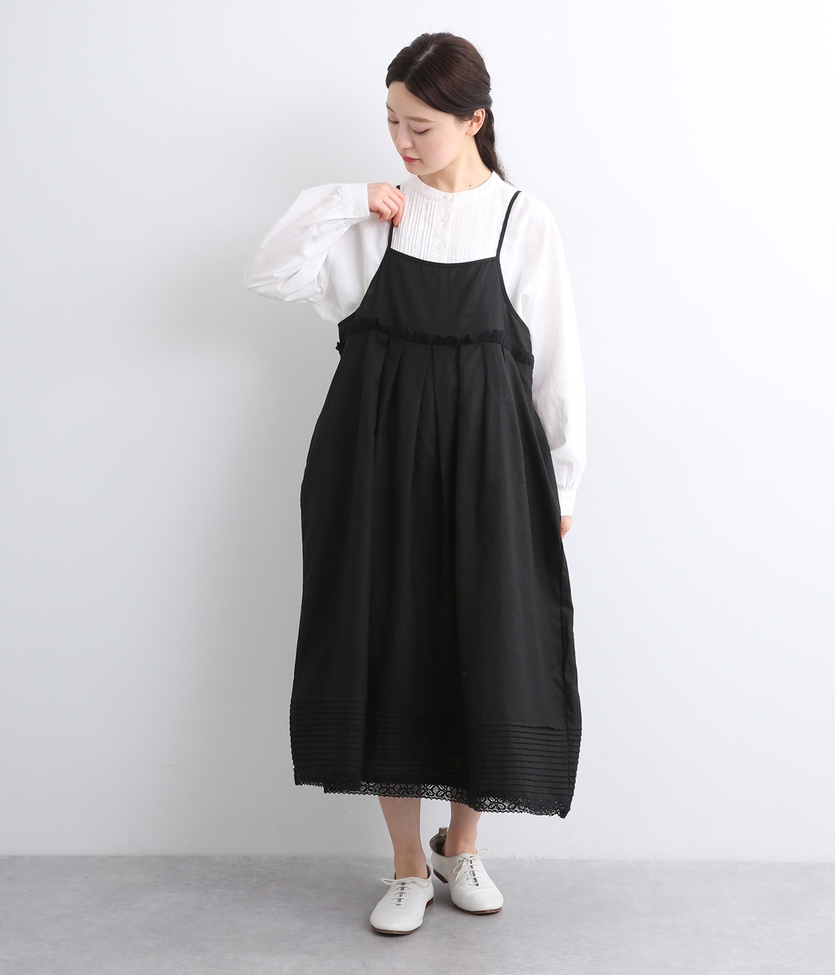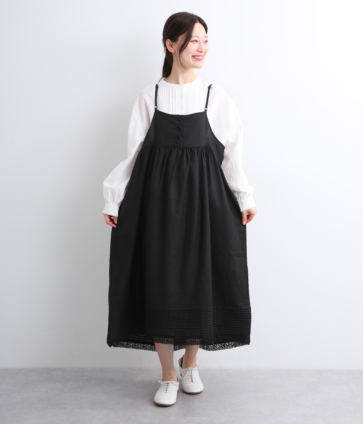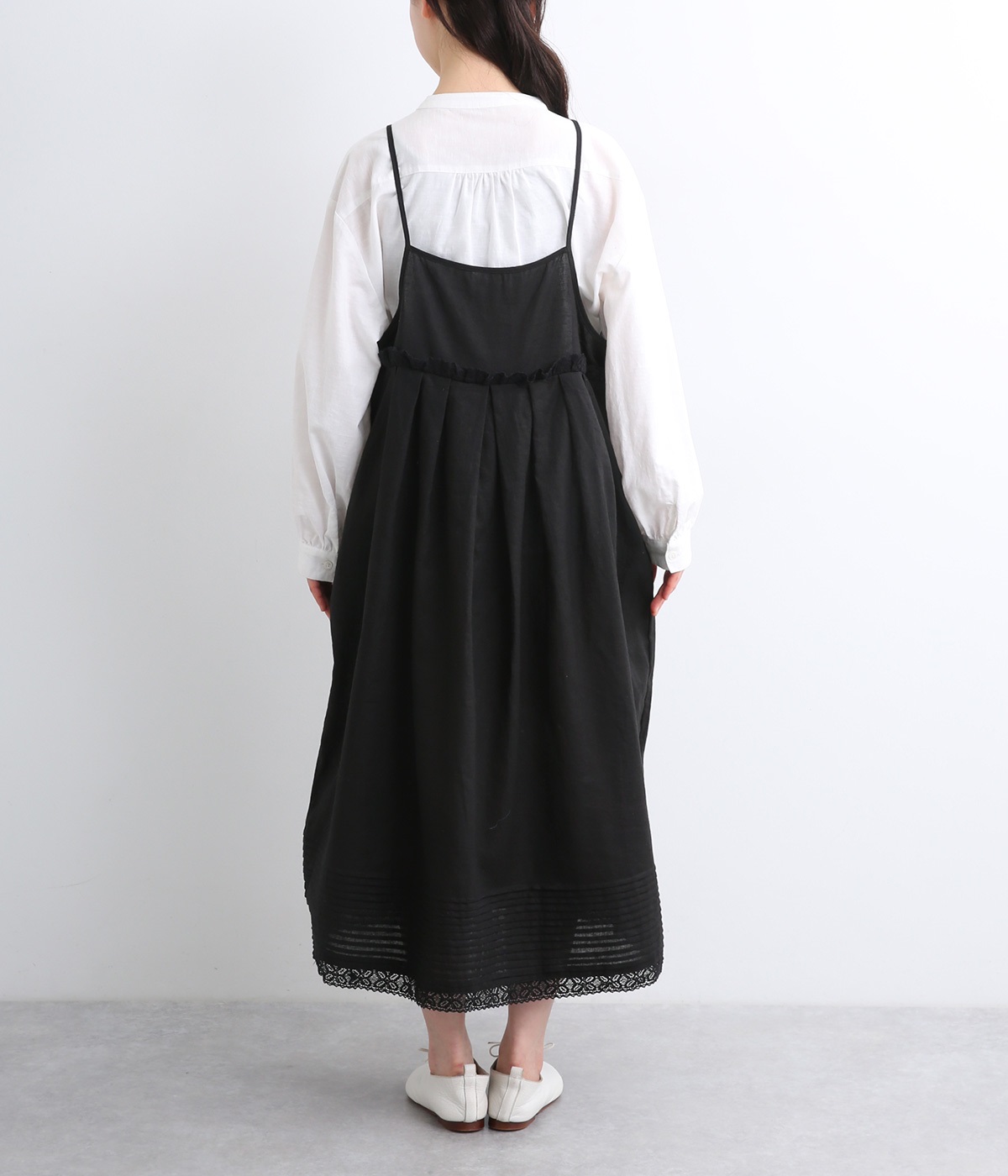 リネン裾ボーダーピンタック&胸・裾レースフリルギャザー2wayキャミワンピース(ブラック-ONESIZE)