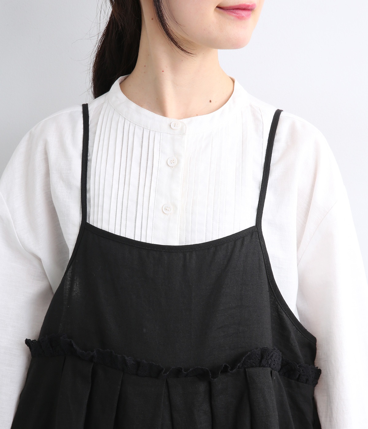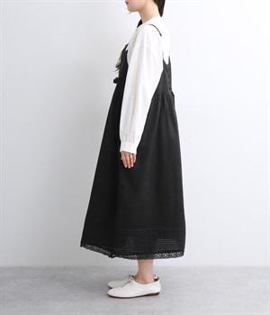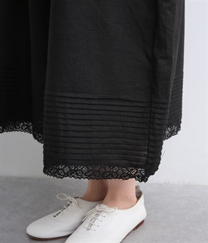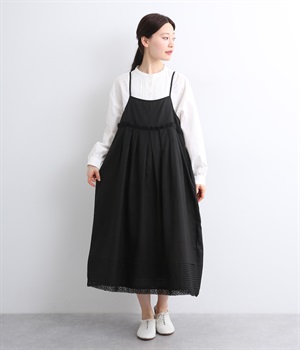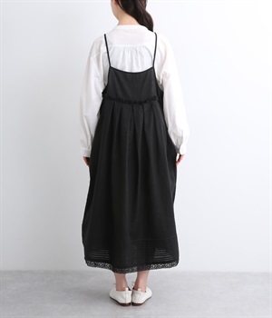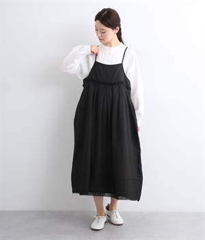 リネン裾ボーダーピンタック&胸・裾レースフリルギャザー2wayキャミワンピース