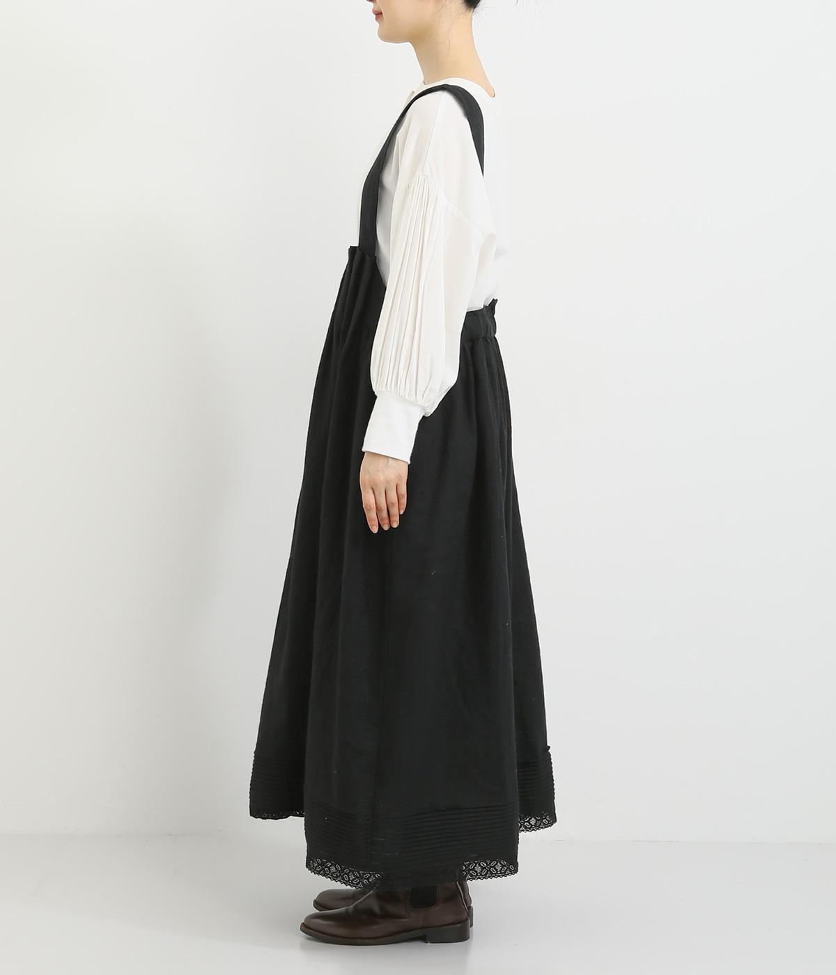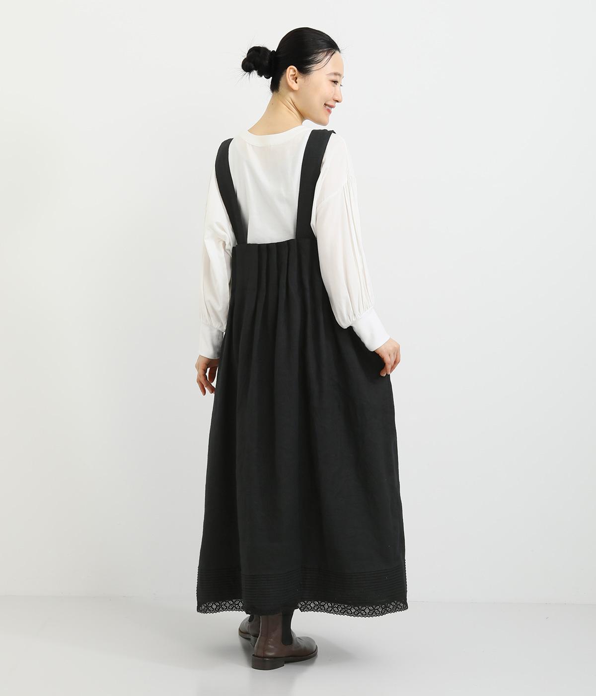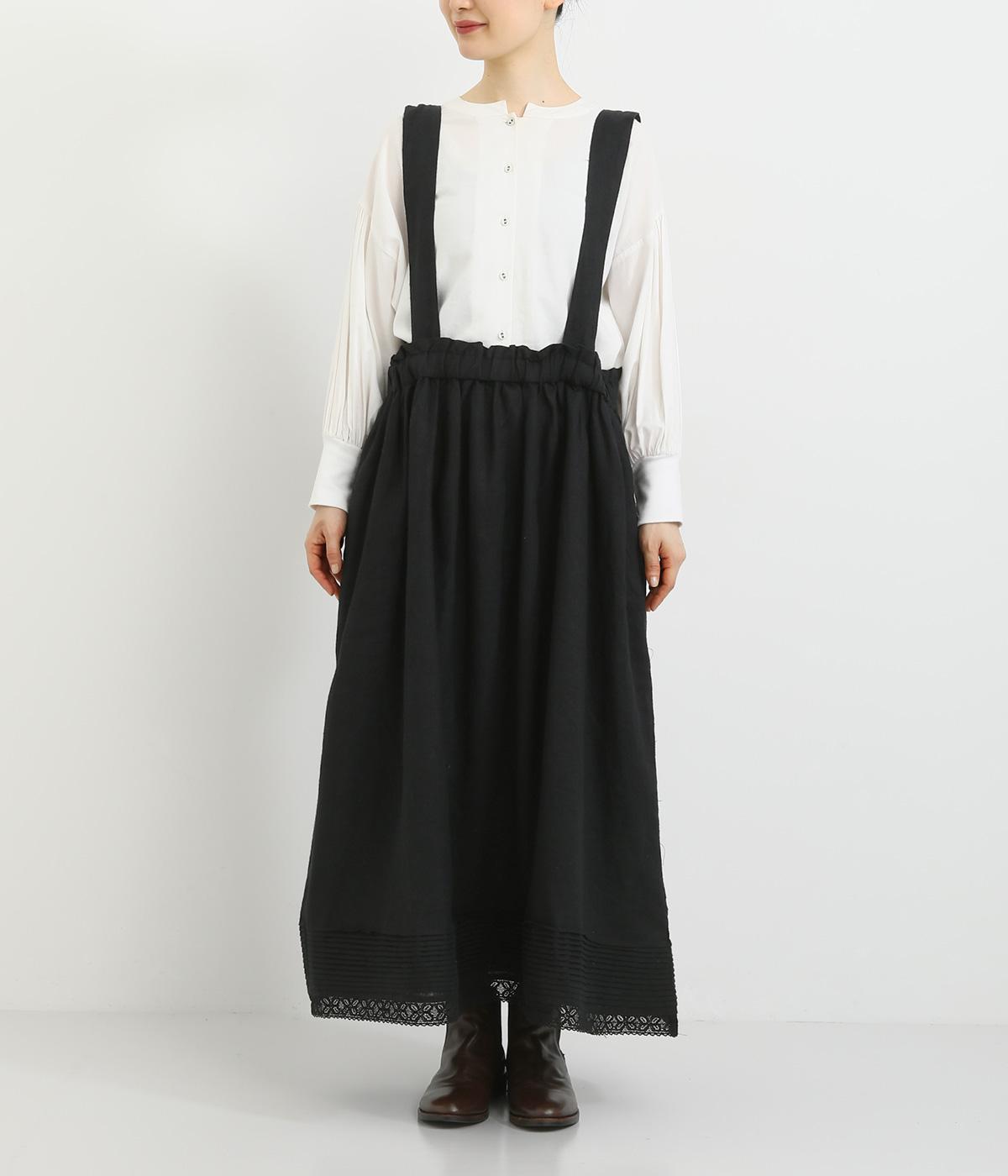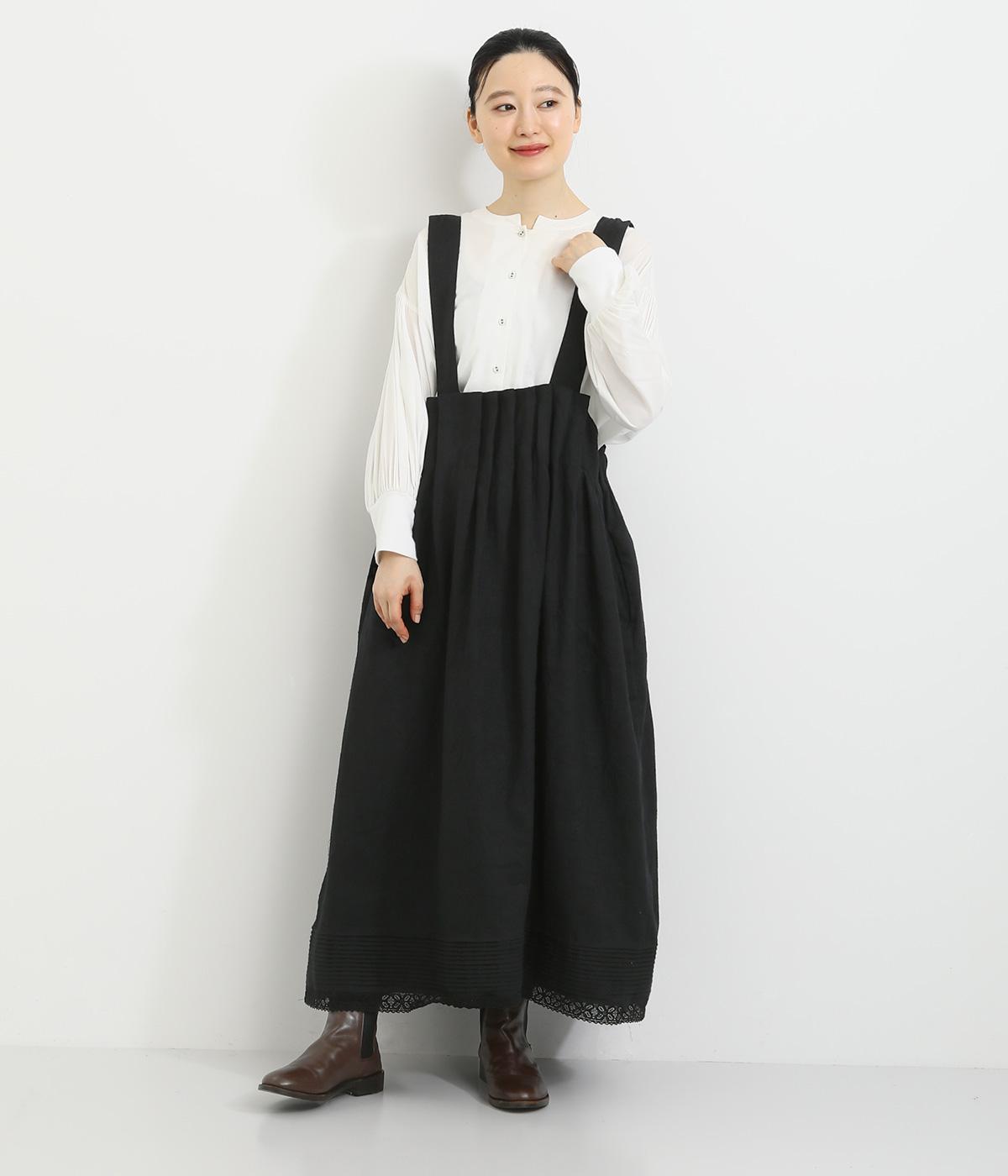 ウエストにたっぷりと贅沢にギャザーをほどこしたデザイン性の高いジャンパースカート。前後で着用できる2wayで仕立てました。裾にはピンタックとレースをあしらい、上品なムードを高めます。細部までこだわりの詰まった一枚です。