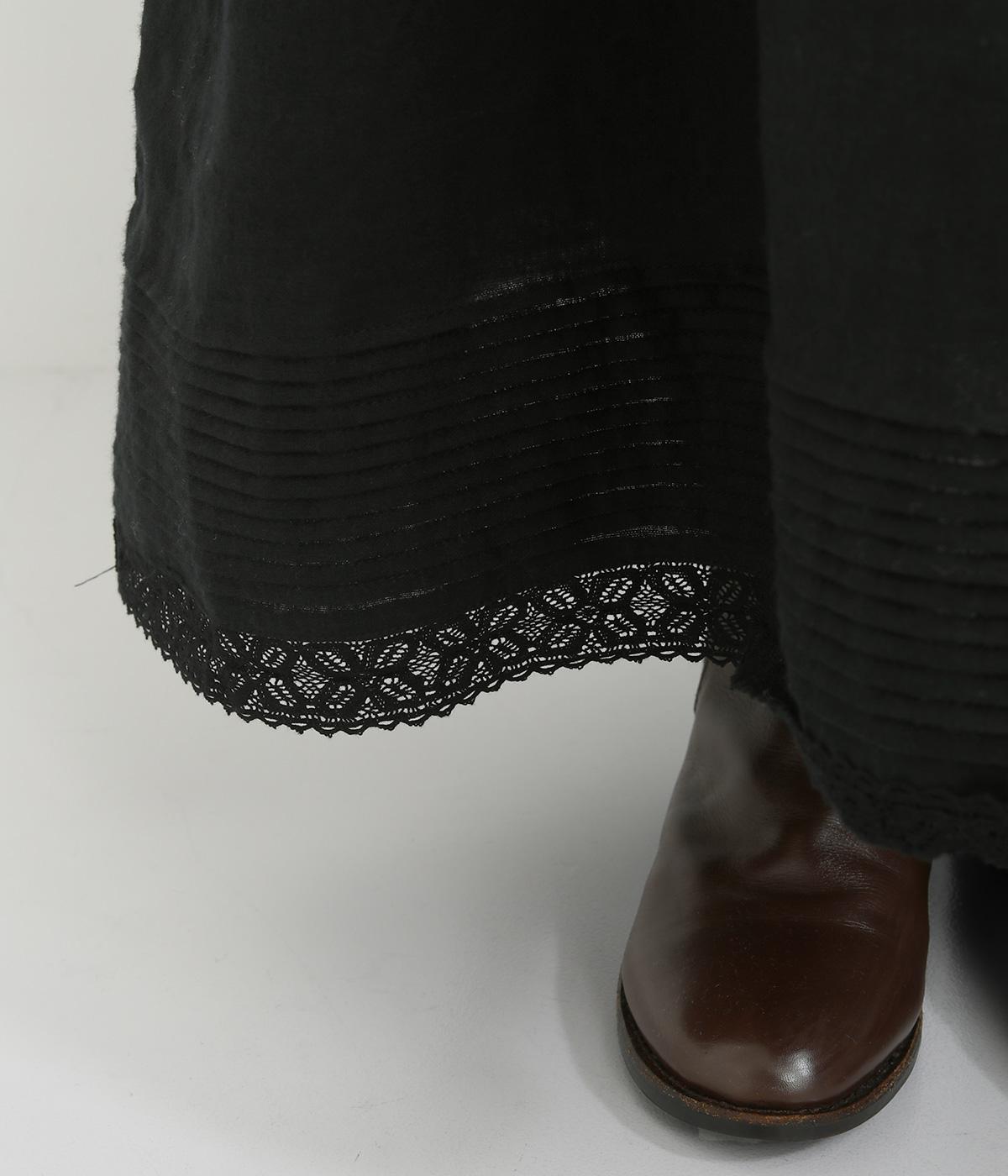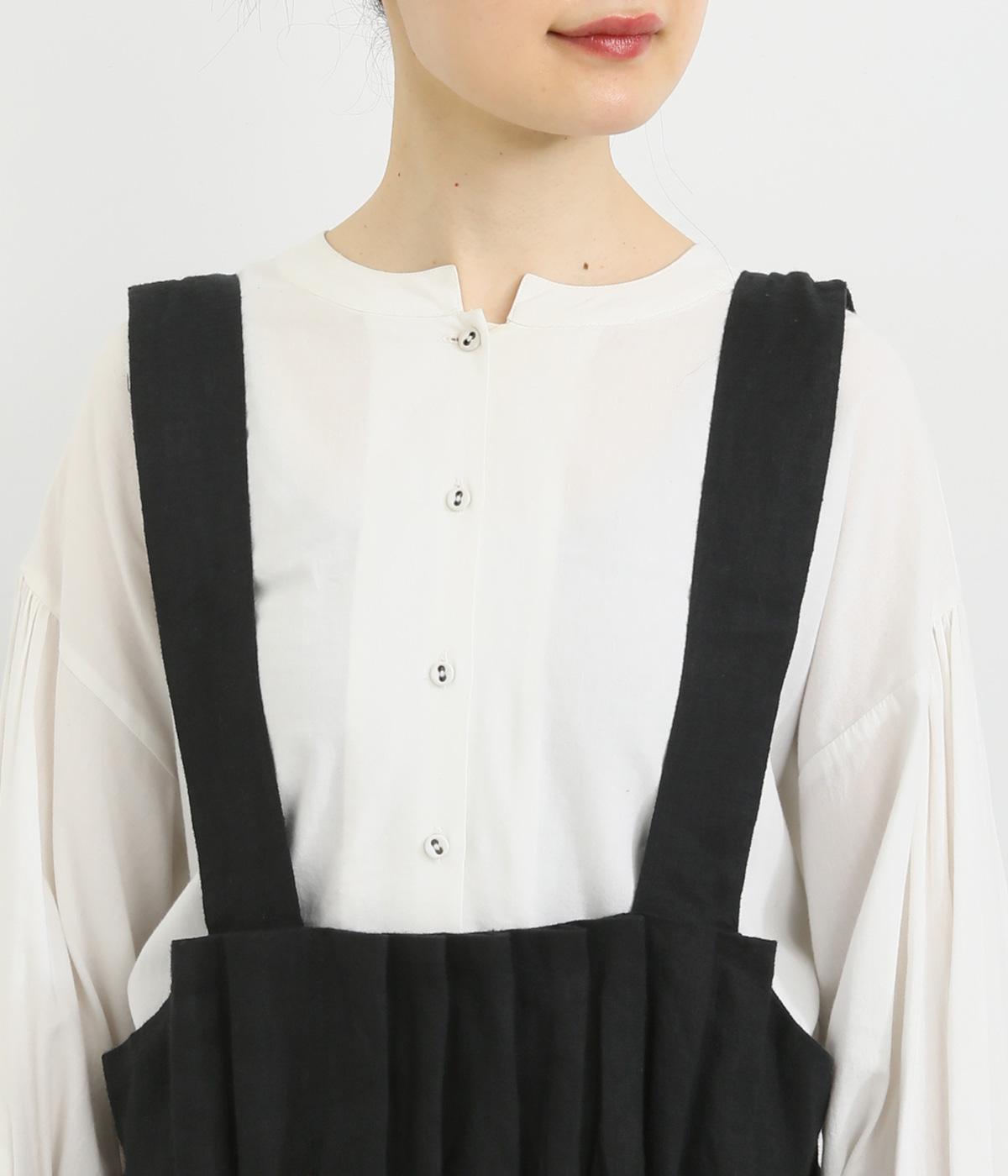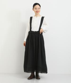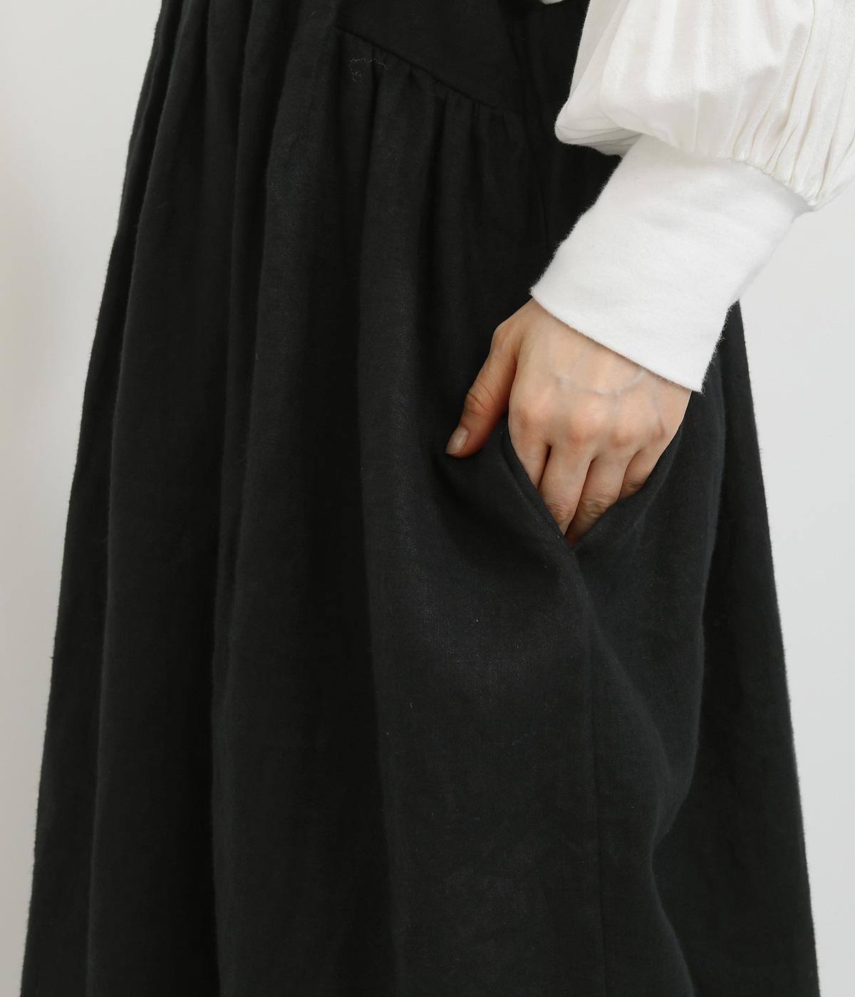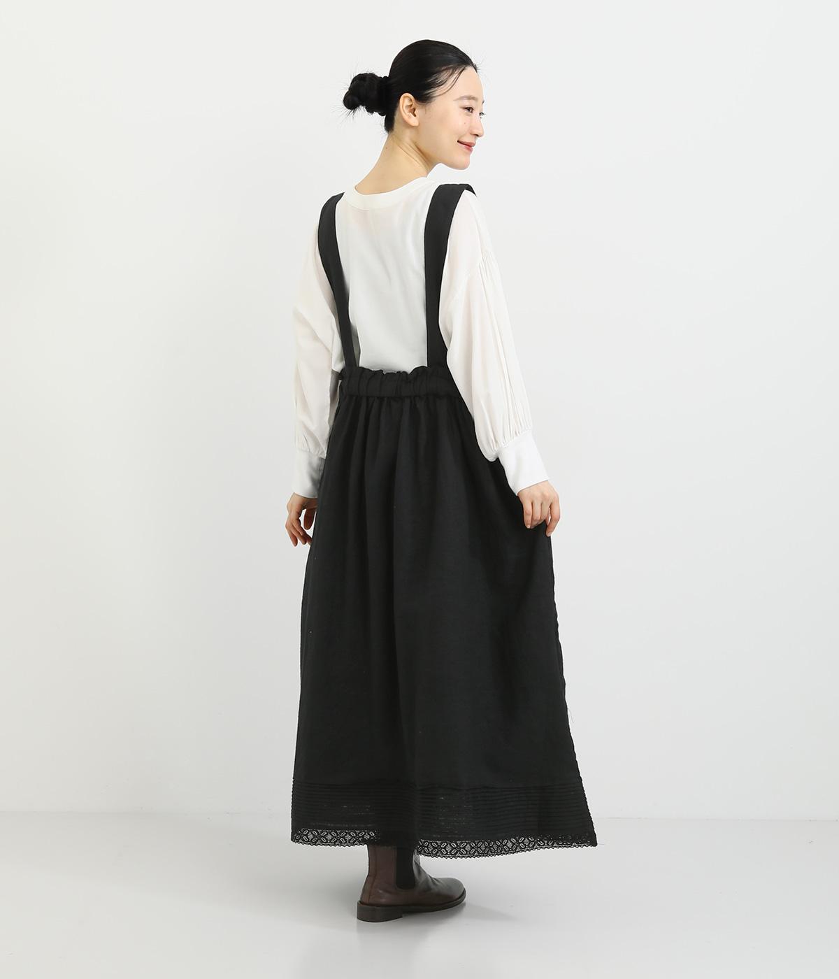 ウエストにたっぷりと贅沢にギャザーをほどこしたデザイン性の高いジャンパースカート。前後で着用できる2wayで仕立てました。裾にはピンタックとレースをあしらい、上品なムードを高めます。細部までこだわりの詰まった一枚です。