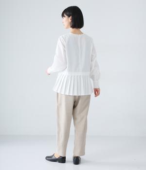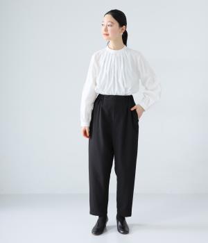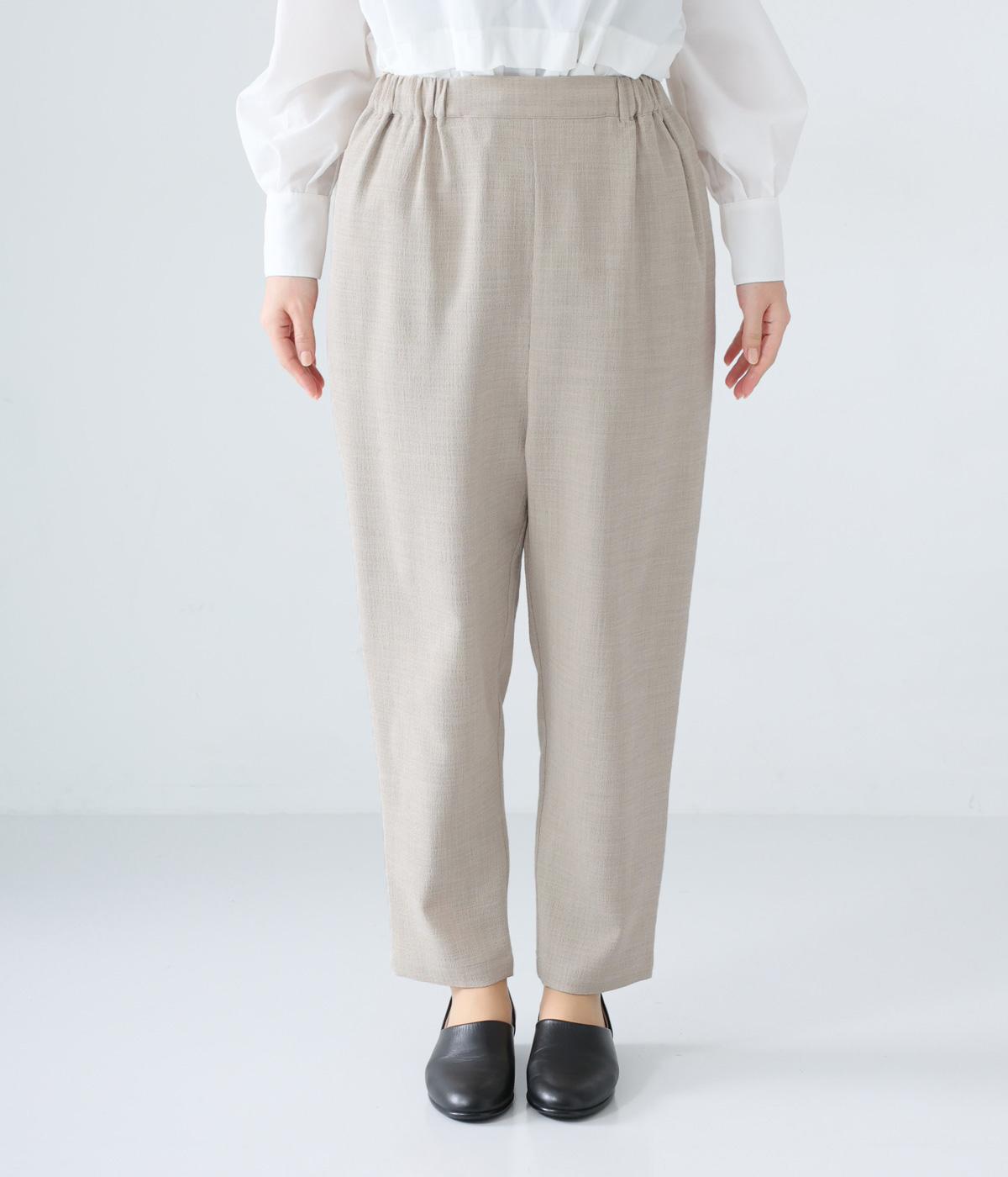 裾に向かってすっきりと細くしたテーパードシルエットのパンツです。腰から太ももにかけてゆとりを持たせ、気になる体のラインをカバー。ウエストはサイドから後ろにかけてゴムを、内側に紐を通してイージーなはき心地にこだわりました。
