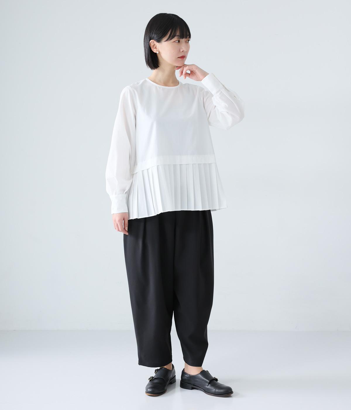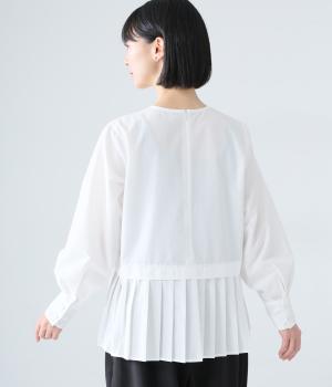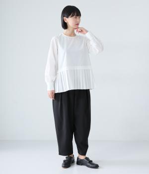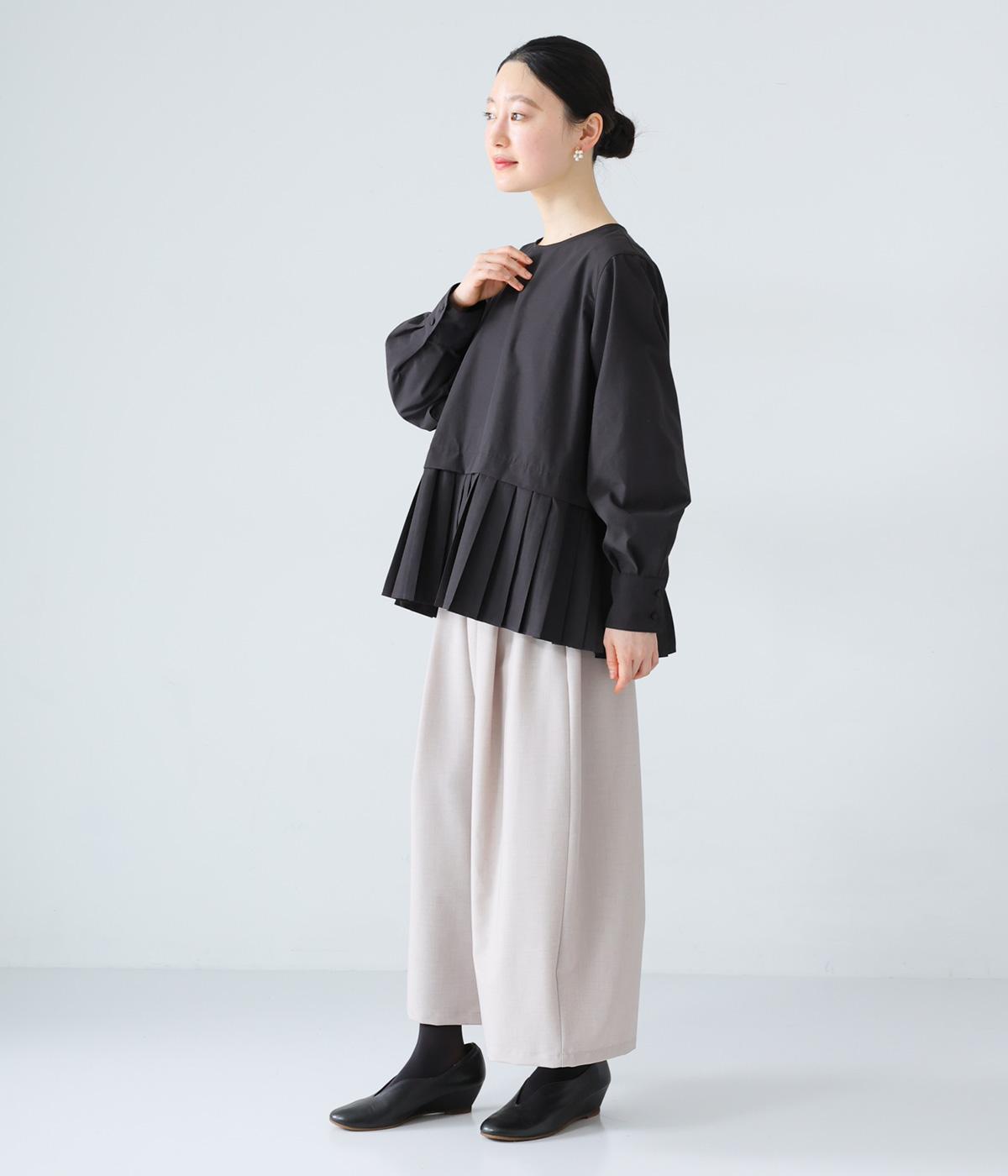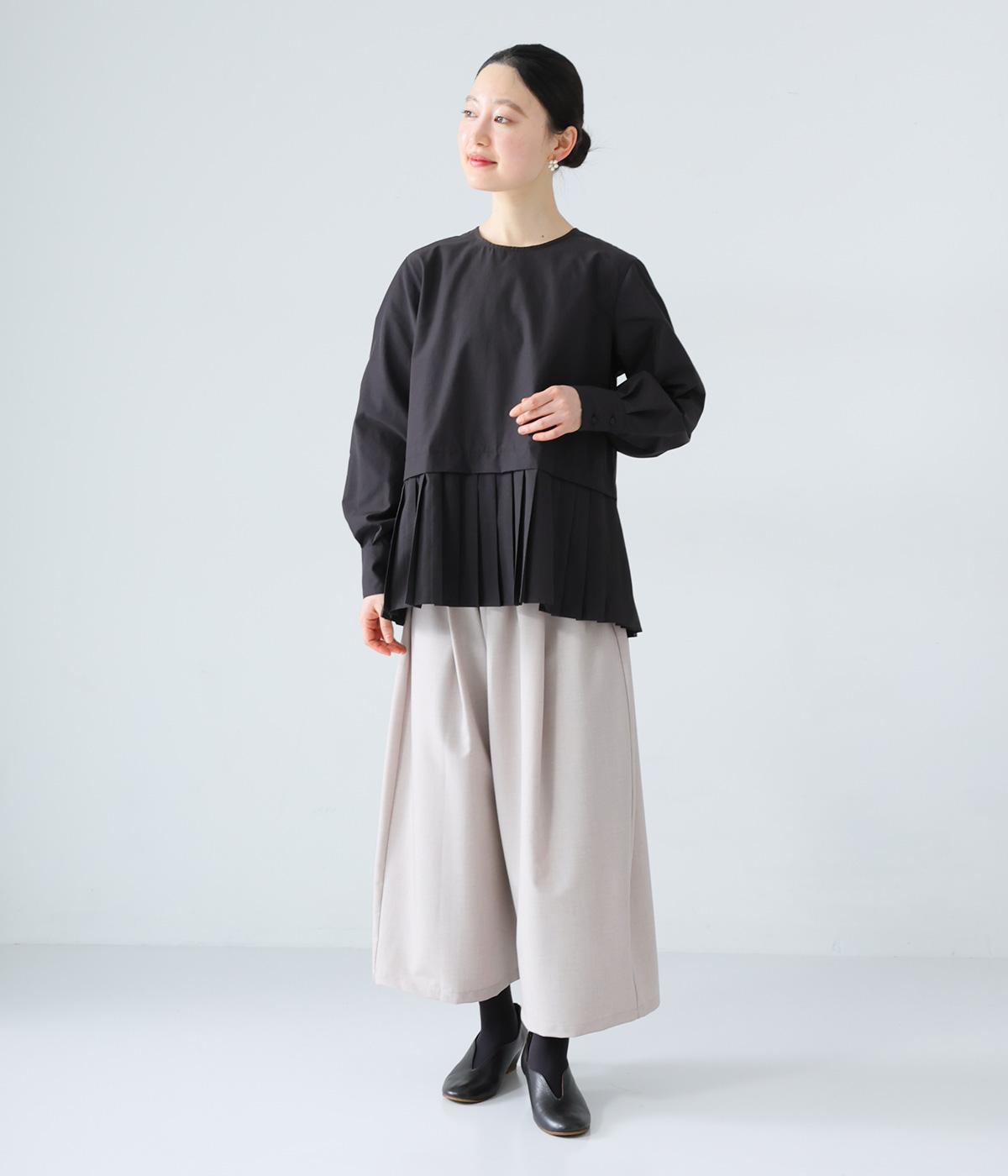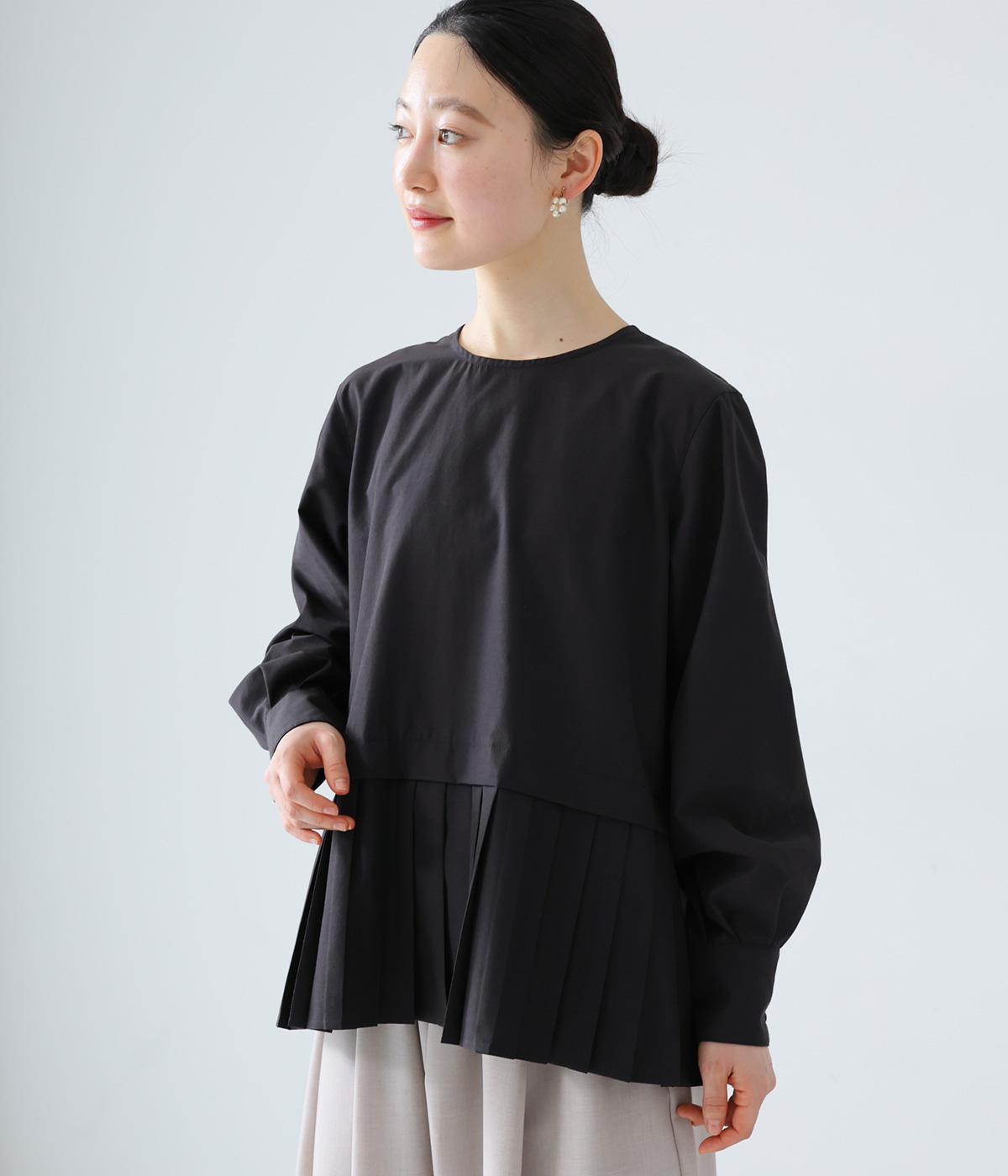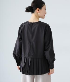 裾のプリーツが着こなしに立体感をうみ、気になるお腹まわりをカバーするプルオーバー。長めのカフスとボリューム袖が大人女性の魅力を引き立てます。大きく開くバックファスナーが着脱をアシスト。オンオフ問わず活躍し、おしゃれの幅が広がる一着です。