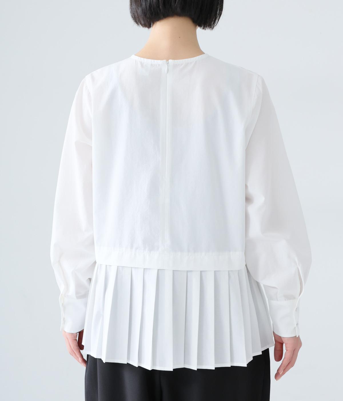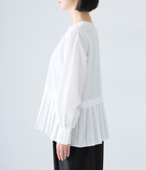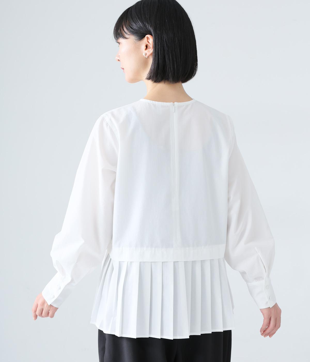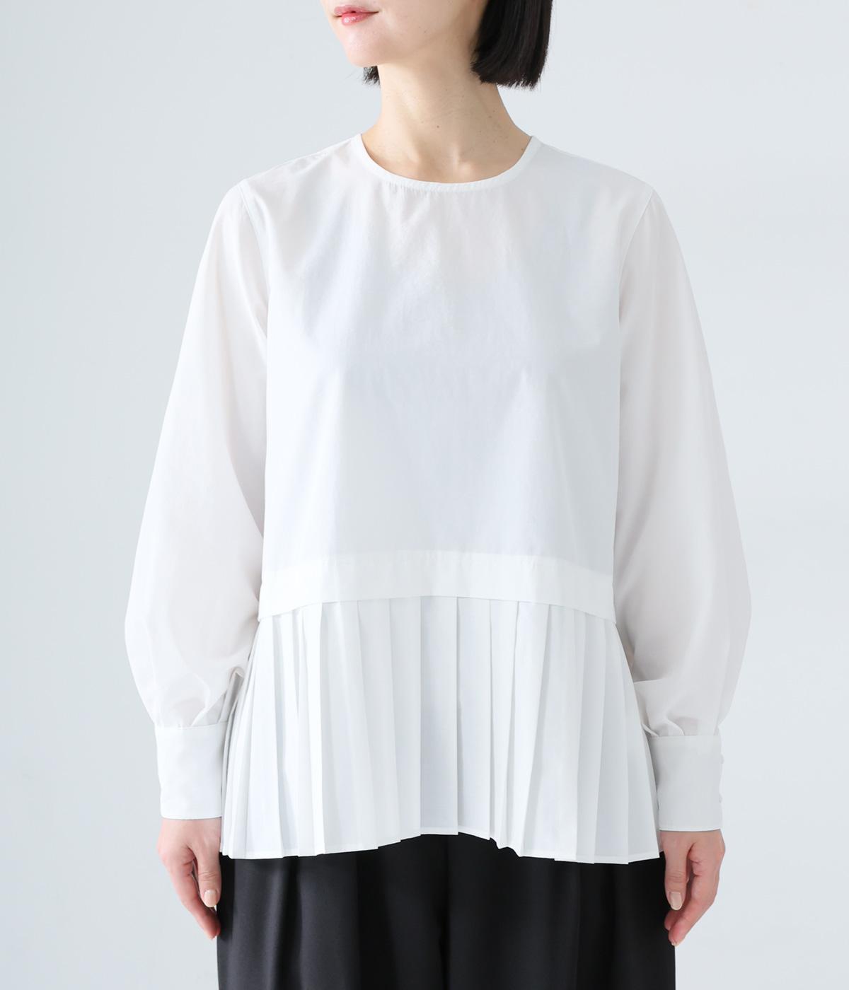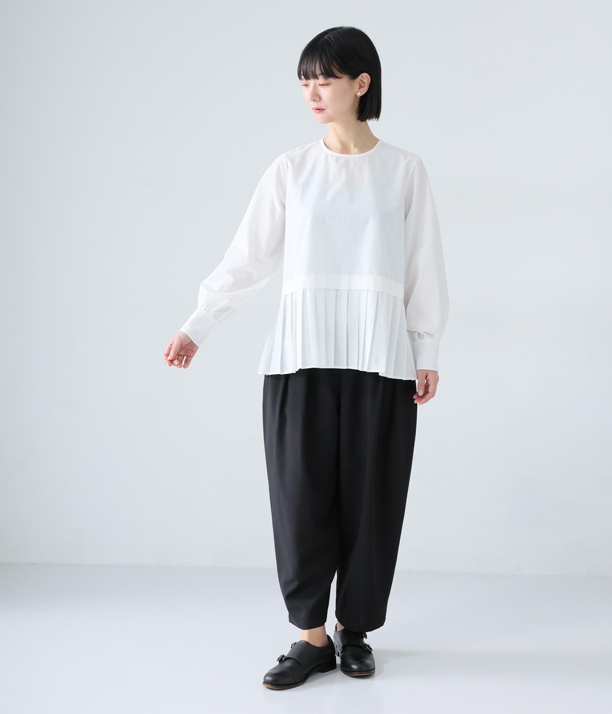 裾のプリーツが着こなしに立体感をうみ、気になるお腹まわりをカバーするプルオーバー。長めのカフスとボリューム袖が大人女性の魅力を引き立てます。大きく開くバックファスナーが着脱をアシスト。オンオフ問わず活躍し、おしゃれの幅が広がる一着です。