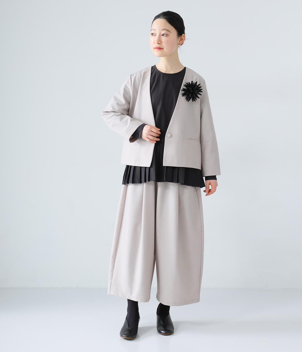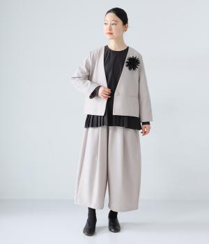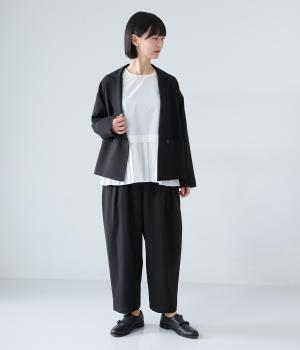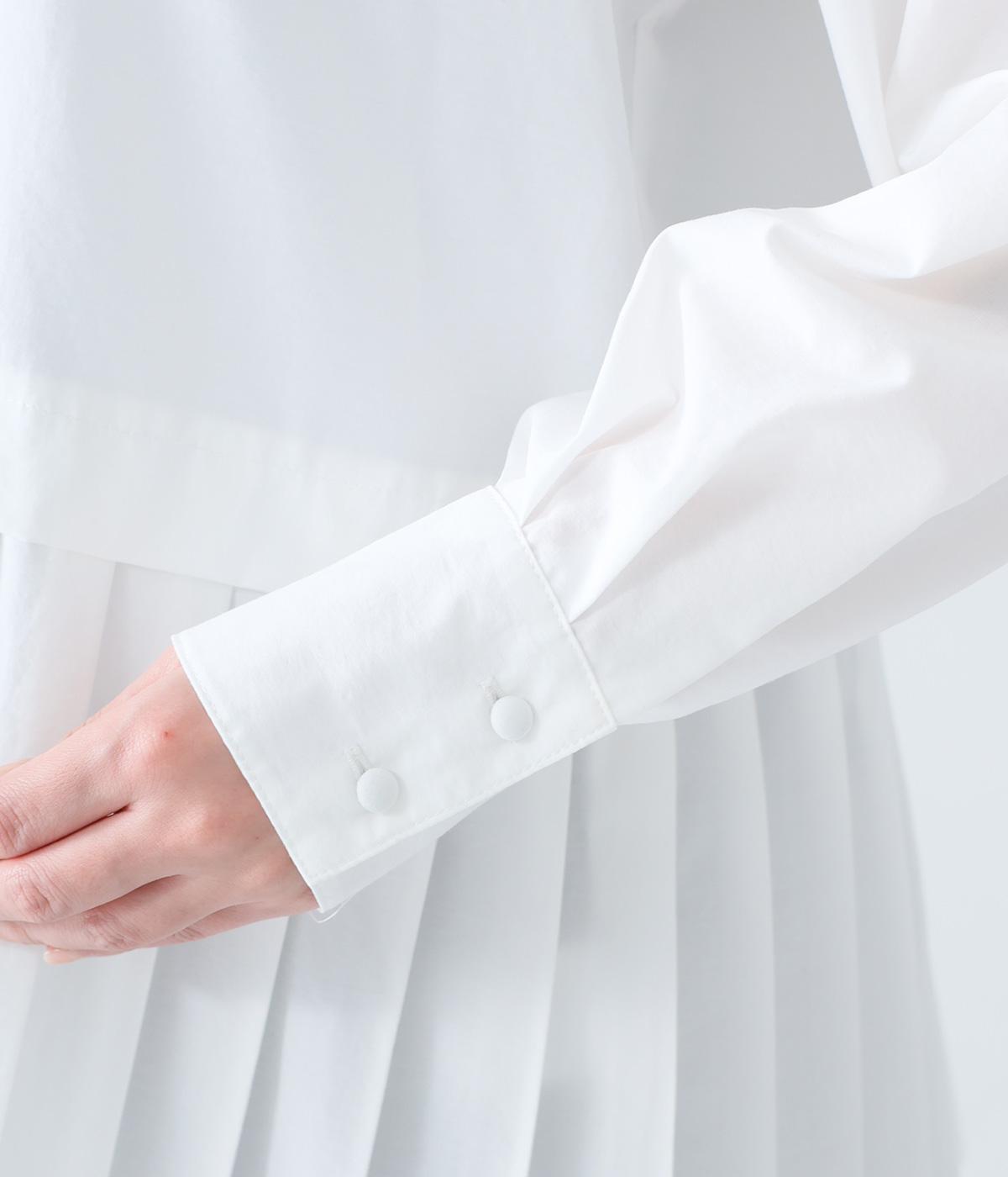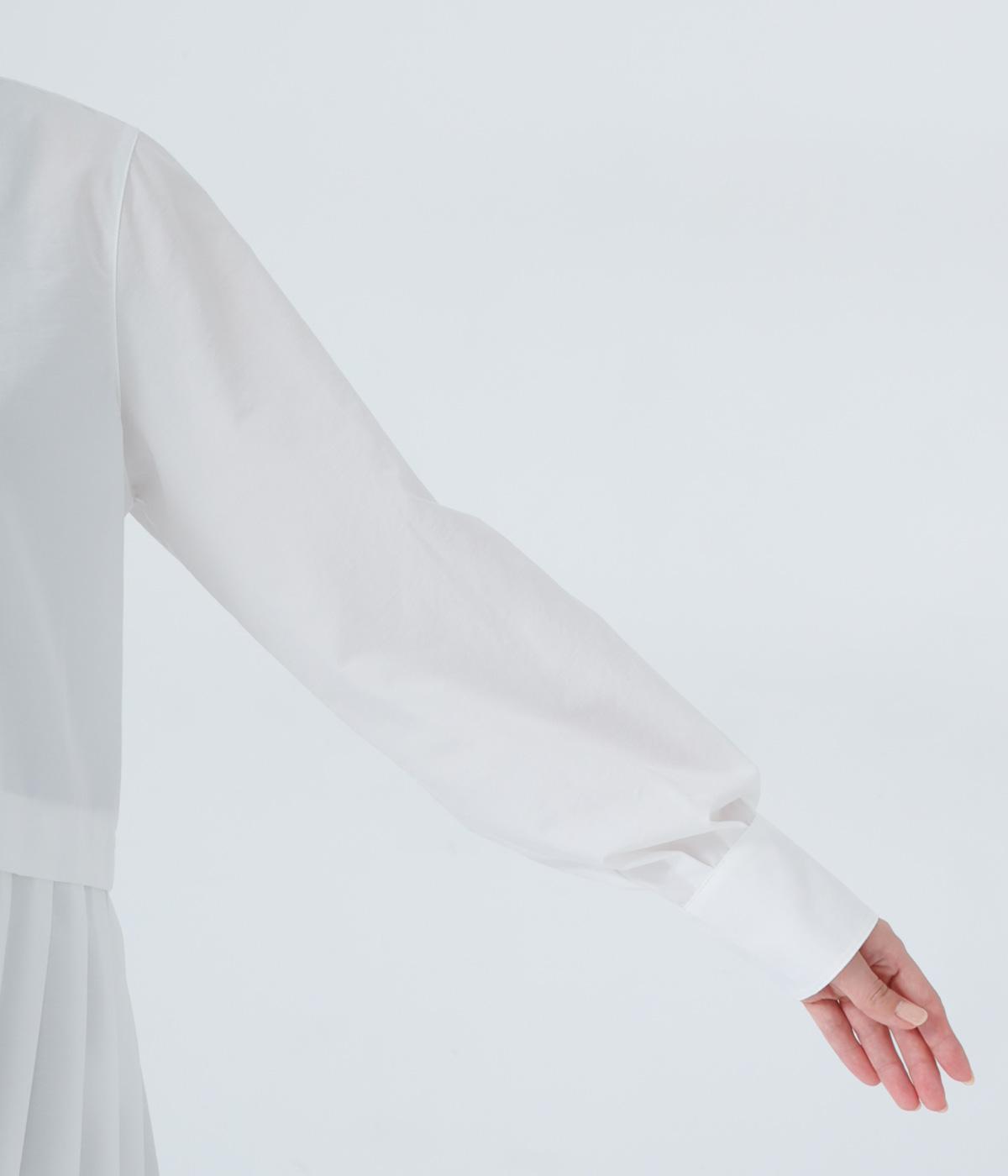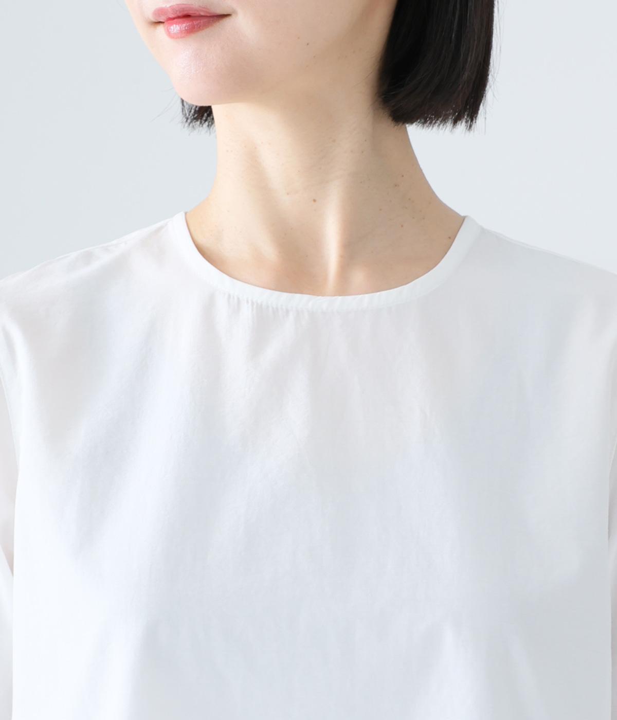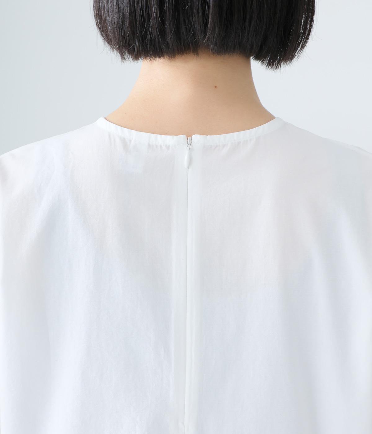 適度なハリとコシがシルエットをきれいに表現する、軽やかな質感のコットン混タイプライター生地。高密度に織り上げたなめらかな表面が、装いをクリーンな印象に仕上げてくれます。