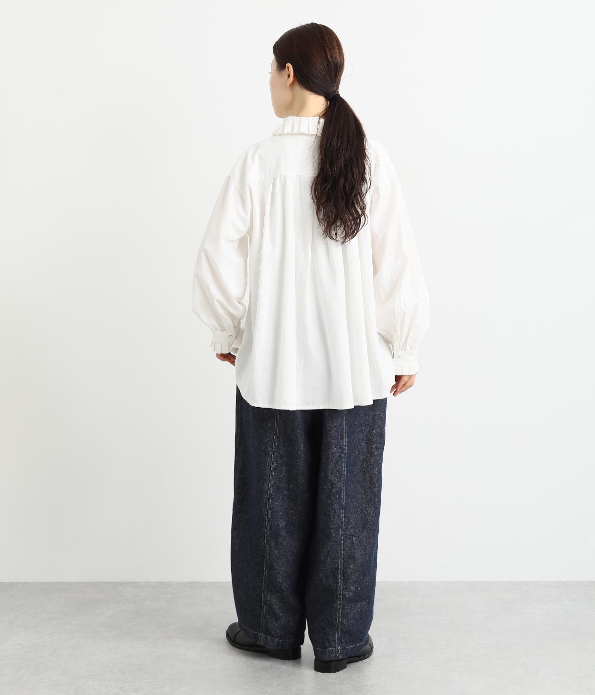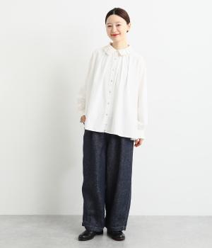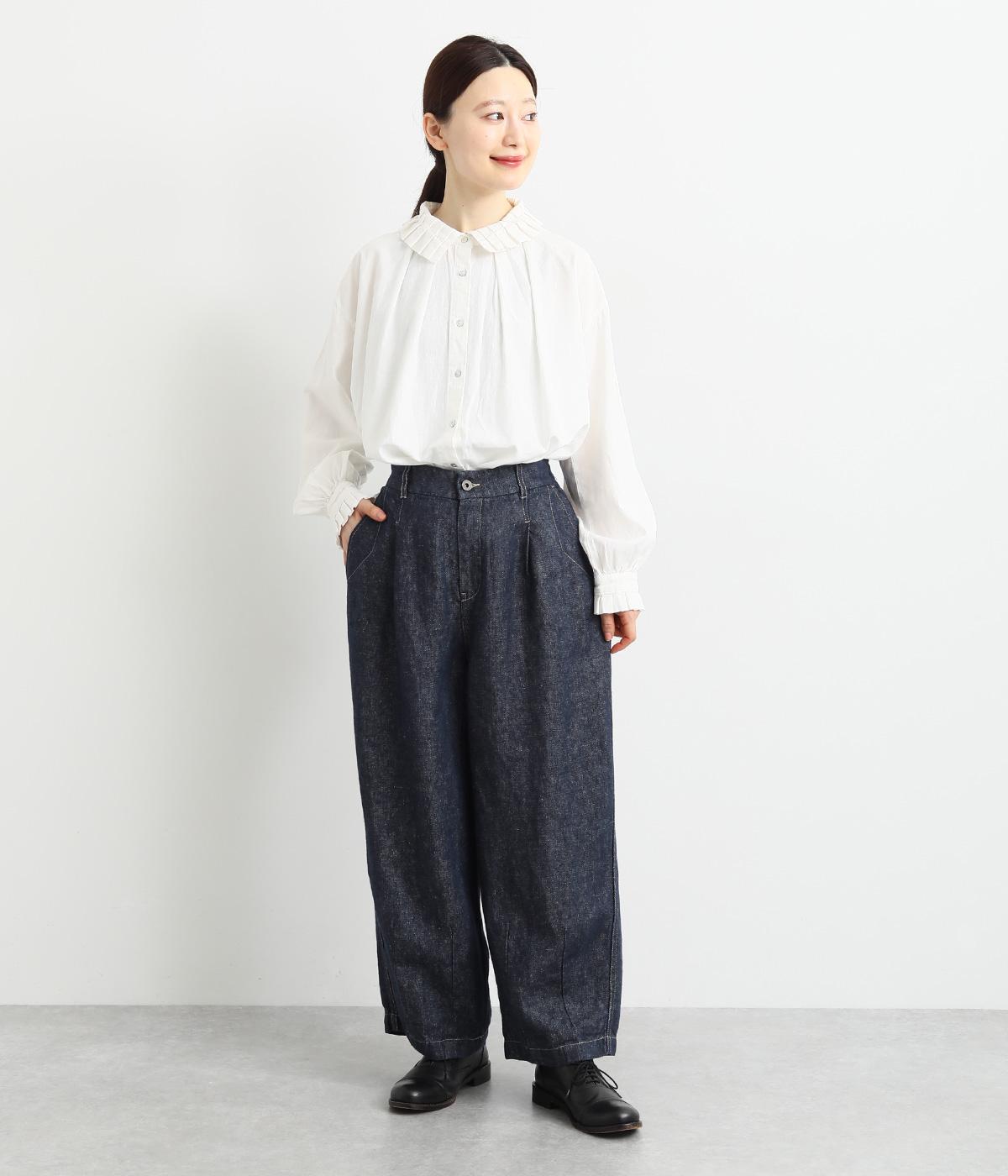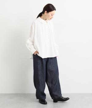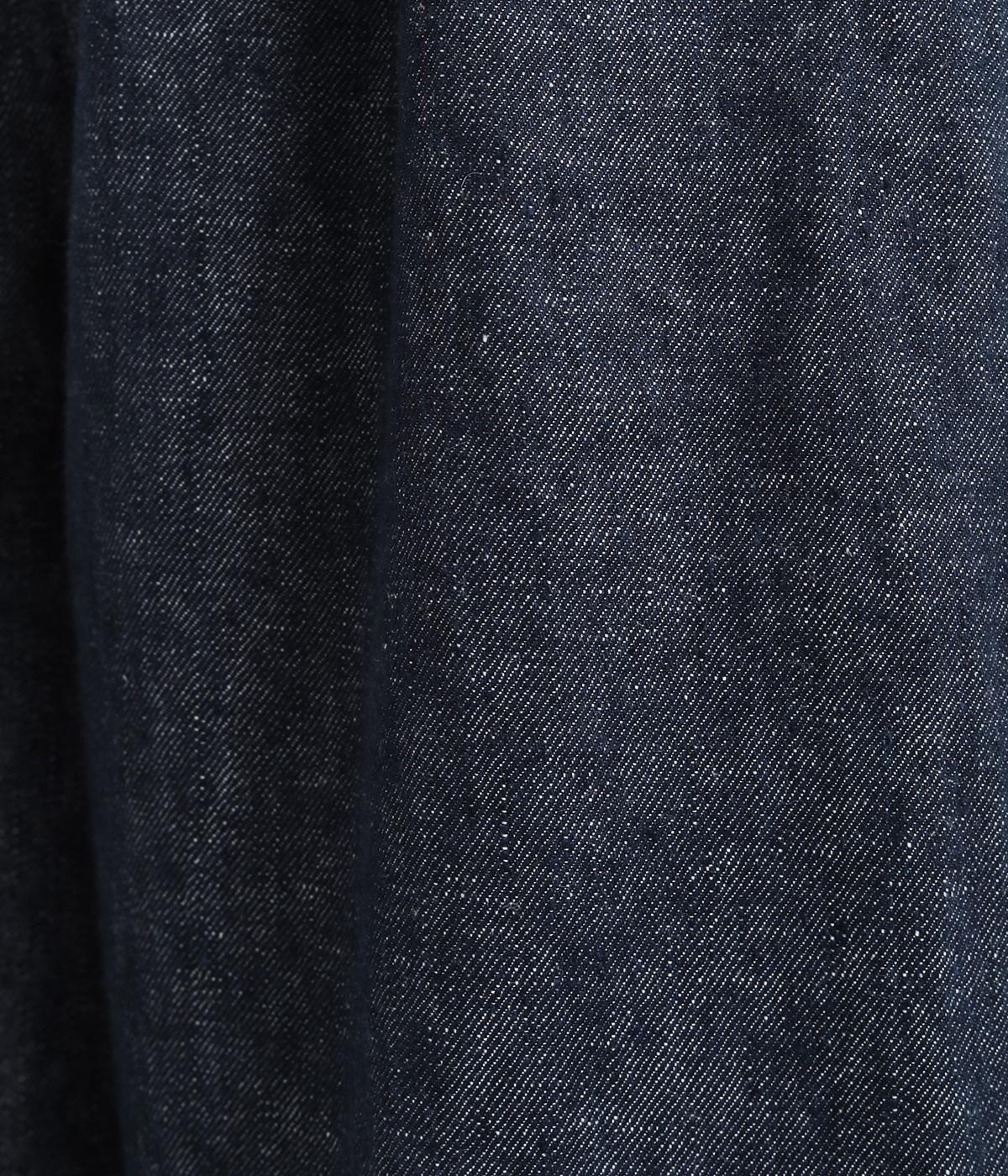 ソフトで心地よい風合いの上質なリネンデニムを使用しました。ゴワつかずしなやかで肌にそっとなじみます。着込むほどに柔らかさが増し、ナチュラルで味わい深い表情を楽しめます。
