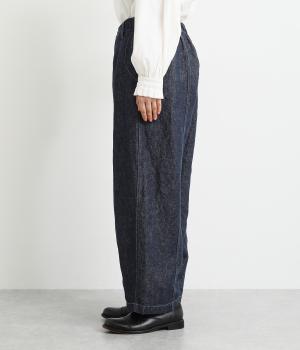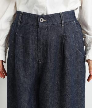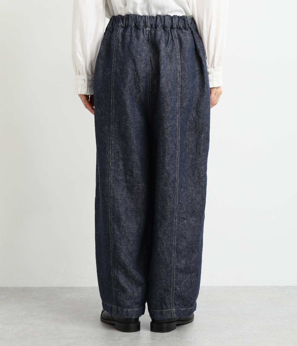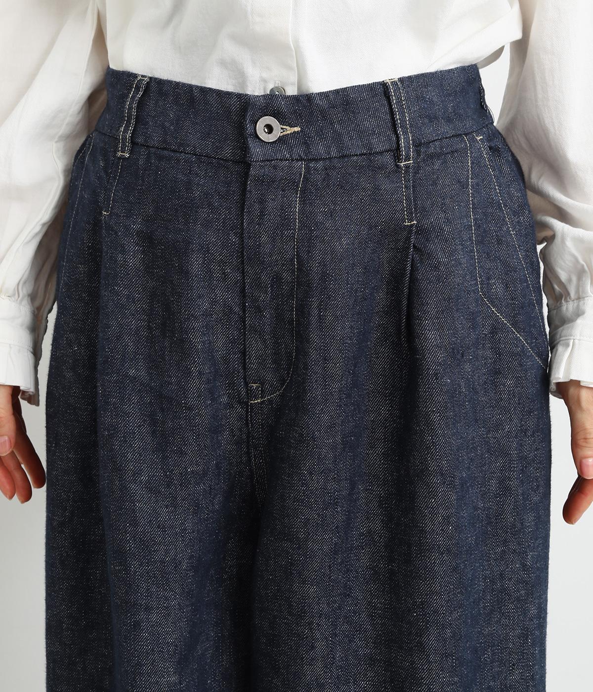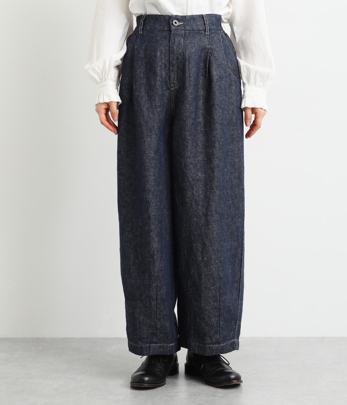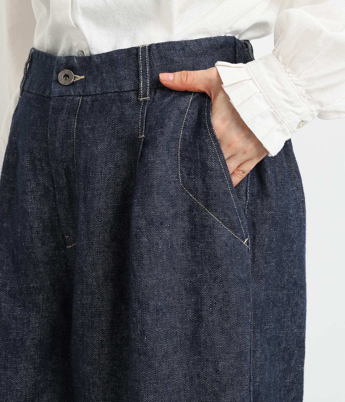 裾ダーツとうしろの切り替えで立体的なテーパードシルエットになっています。全体的に太番手ステッチを入れて無骨さのある印象ながらもリネン特有のクラシカルで上質感があるデニムパンツです。