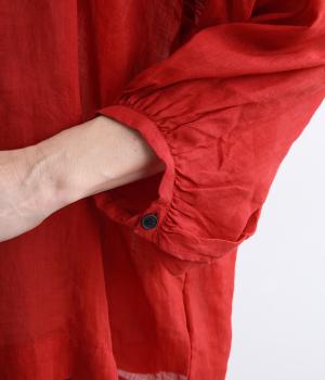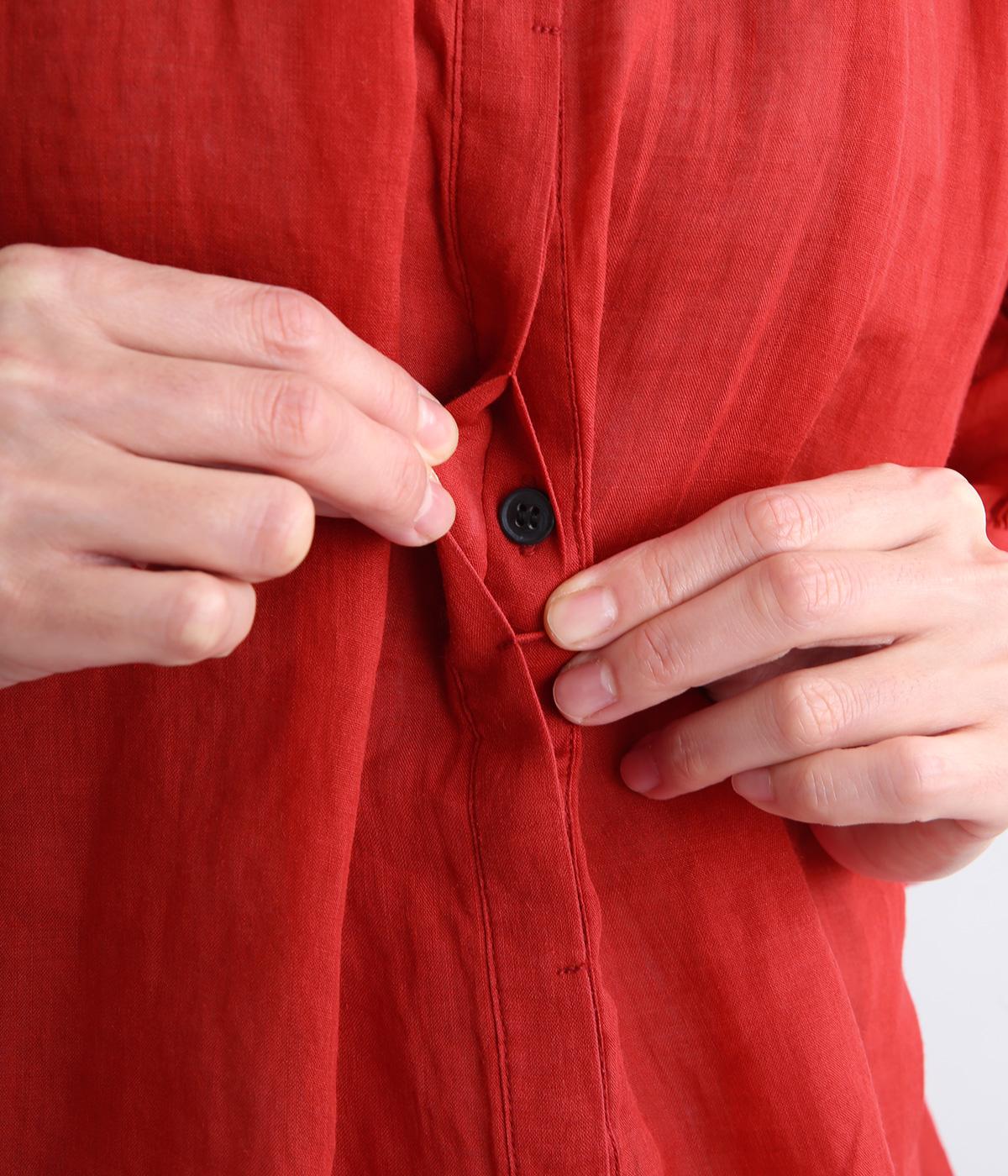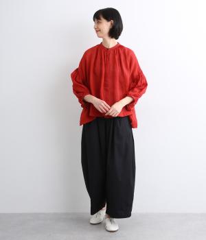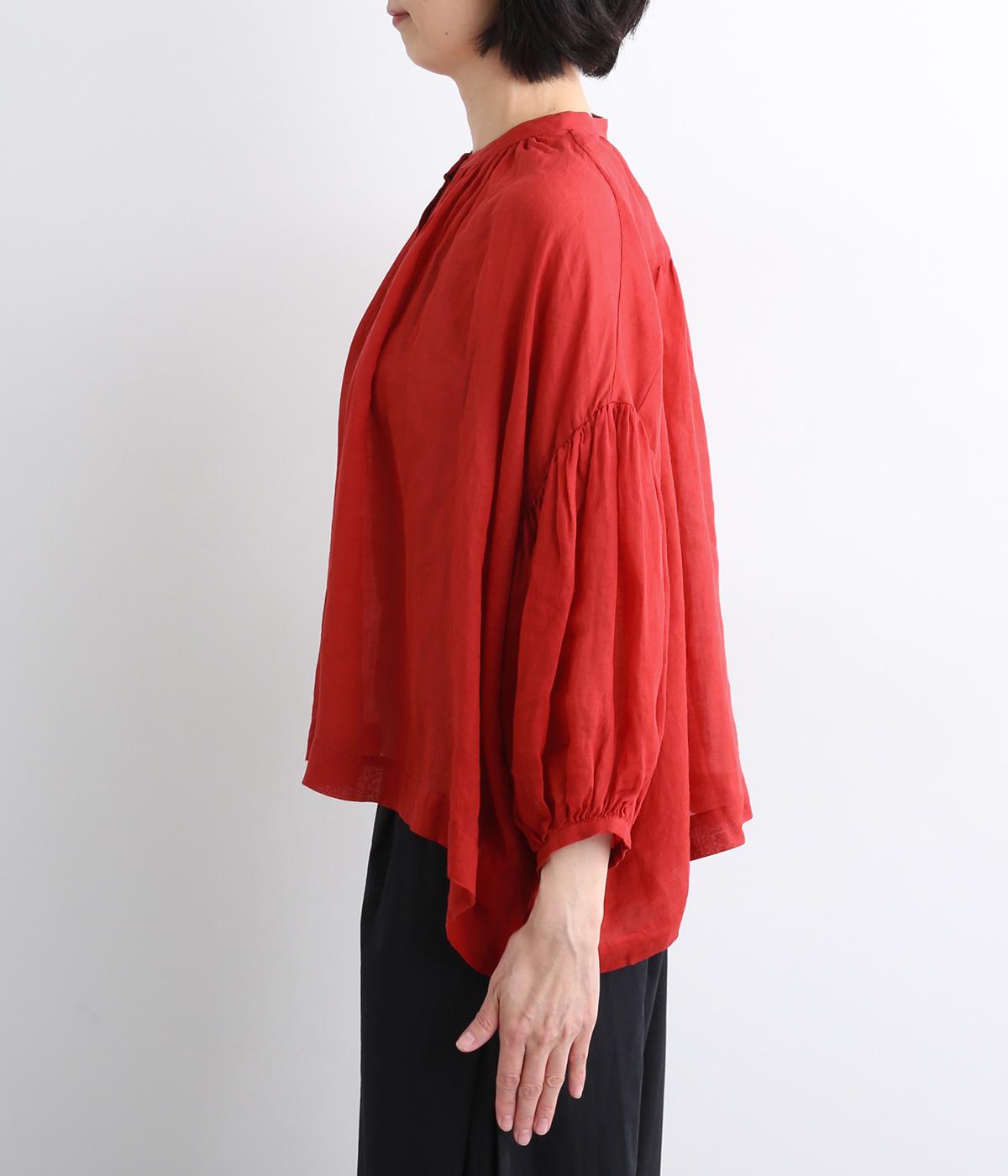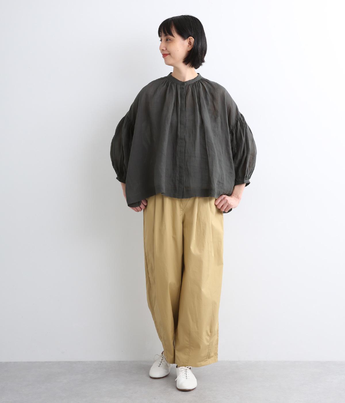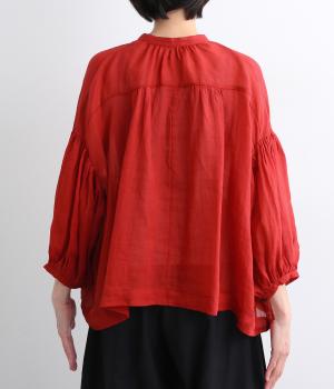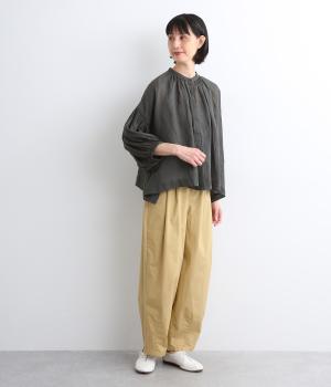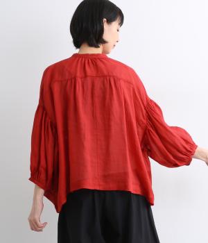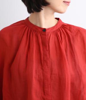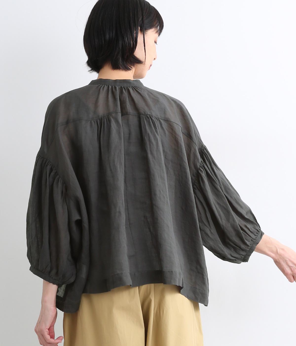 ネック、袖、背ヨークにギャザーをたっぷりと入れ、エアリー感のあるシルエットに仕上げました。汗ばむ季節にも活躍する前開きブラウスで、季節の変わり目の羽織りとしても重宝します。比翼仕立てでデザインはすっきりとミニマムにまとめ素材の魅力を惹きたてます。
