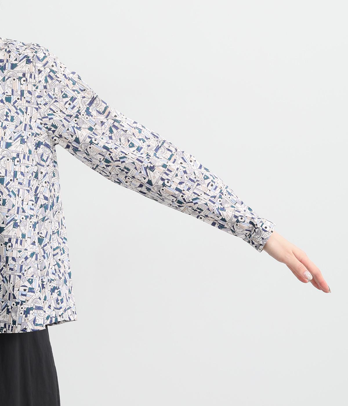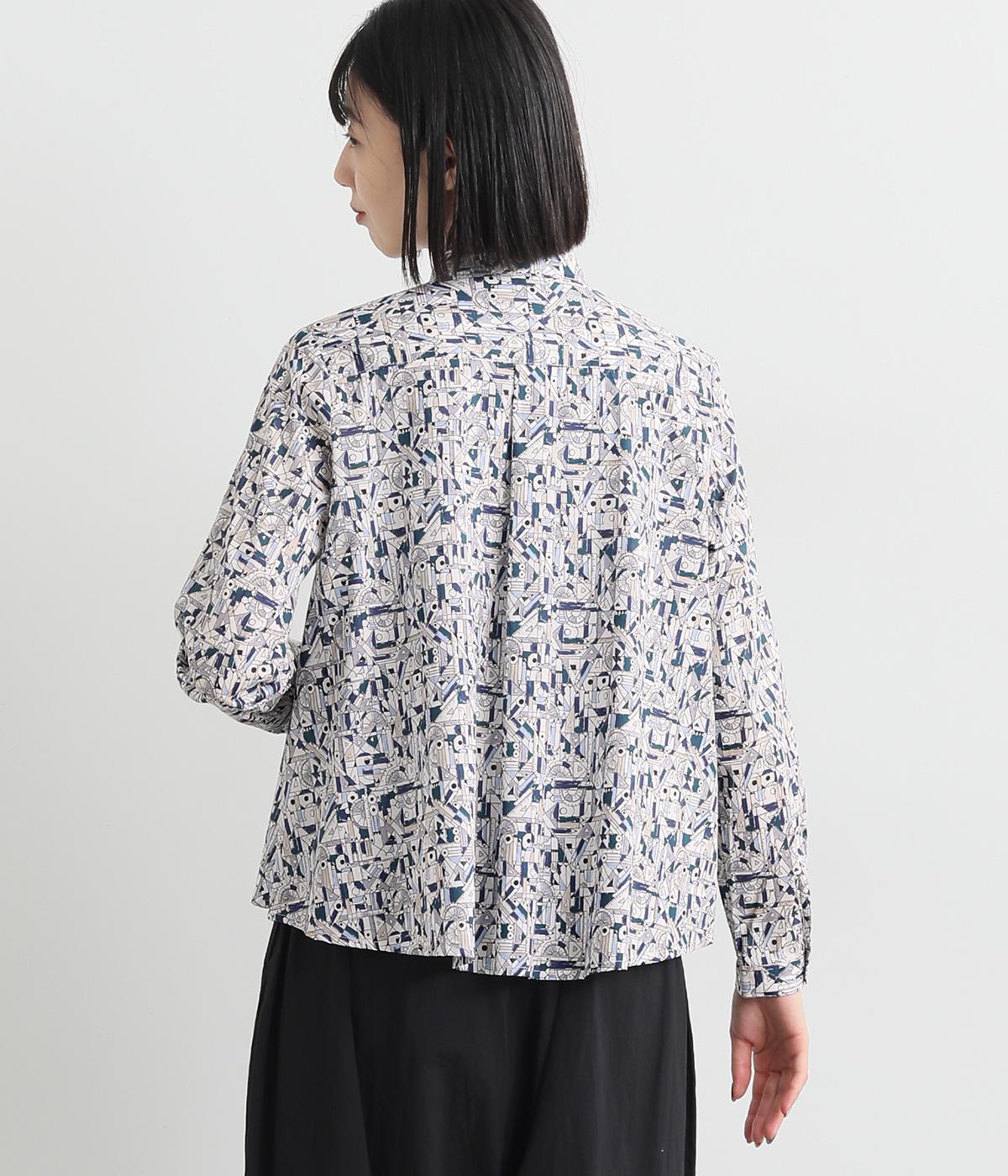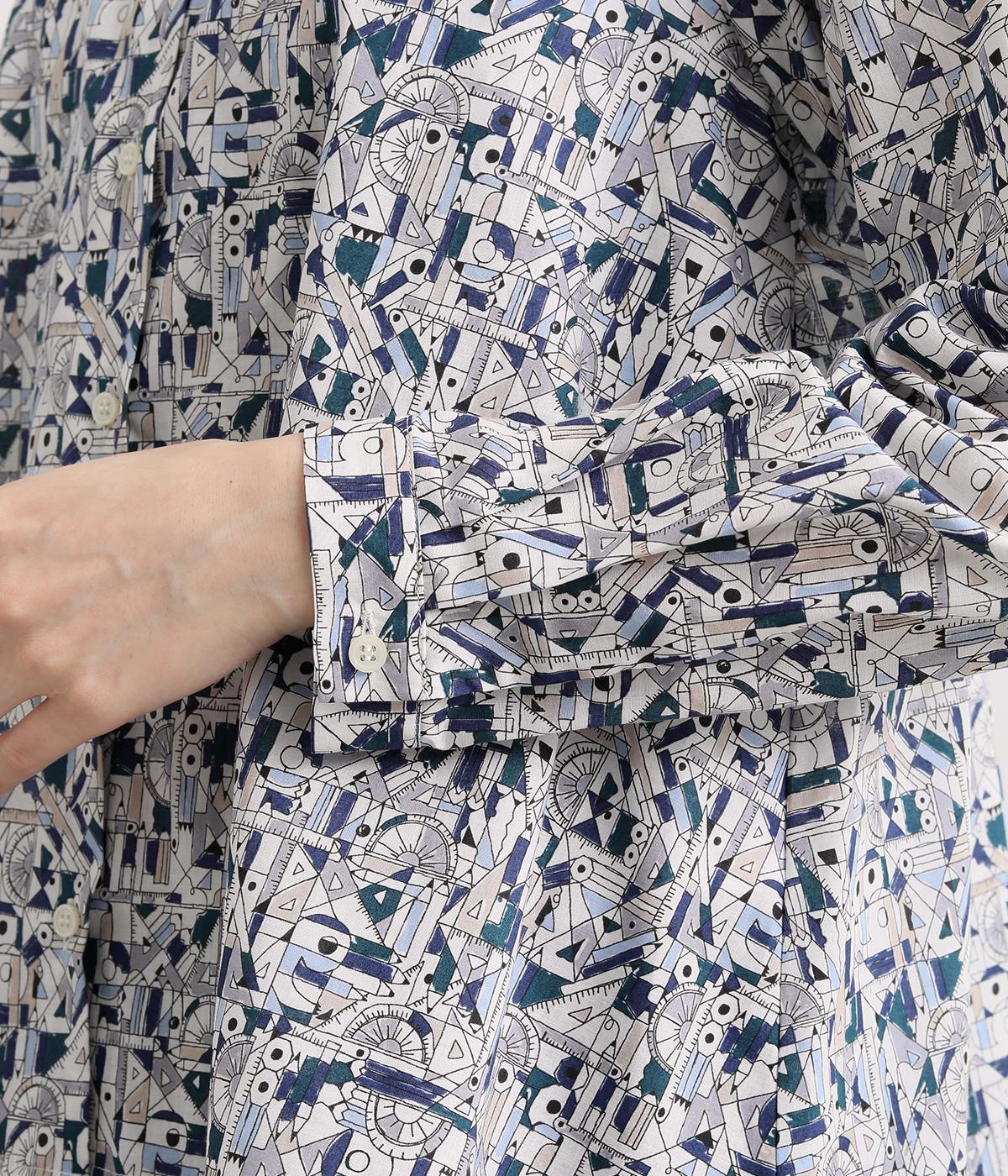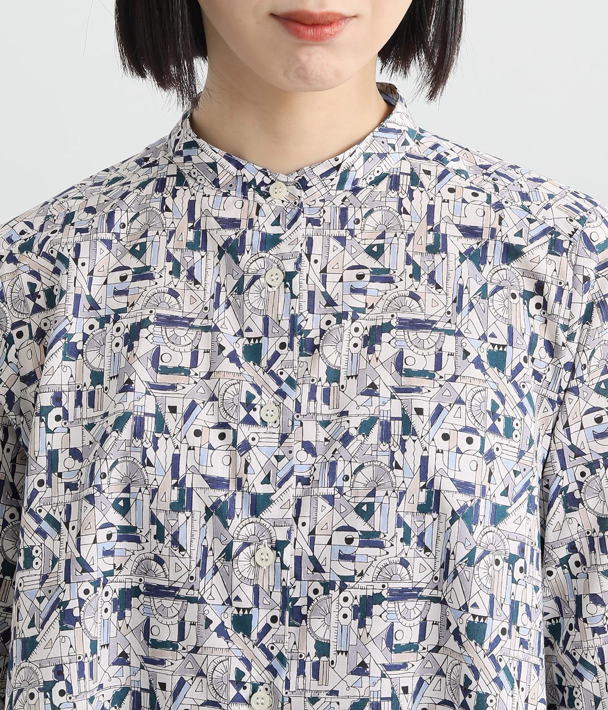 遠目だと幾何学柄にも見えますが、よく見ると文房具がたくさん詰まったユニークな総柄シャツ。Aラインにふわりと広がるシルエットが女性らしさを高めてくれます。小さく立ち上げた襟がきちんと感をプラス。コンパクトな着丈でさまざまなボトムスにバランスよく合わせやすい一枚です。