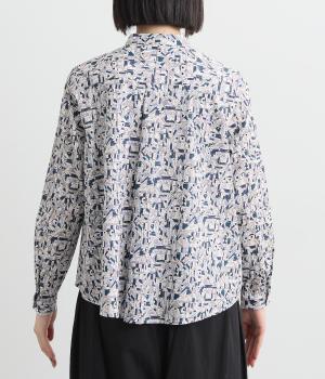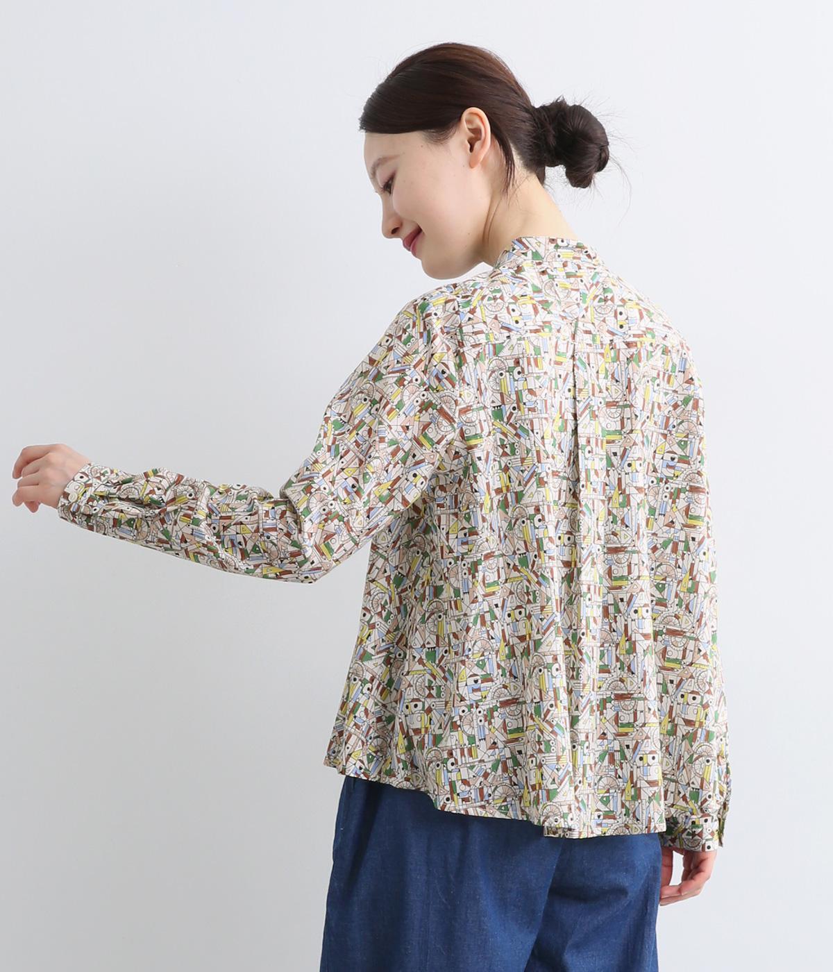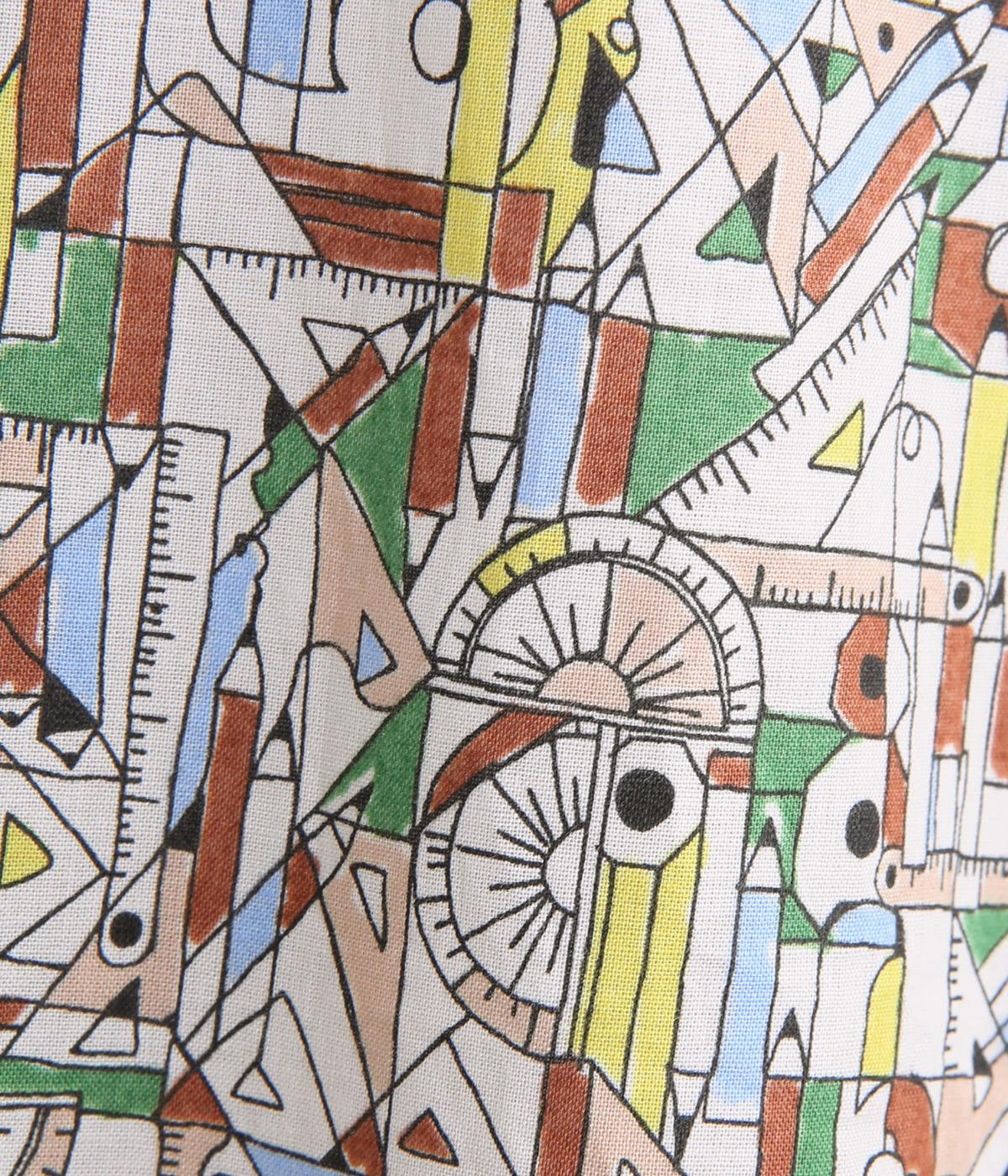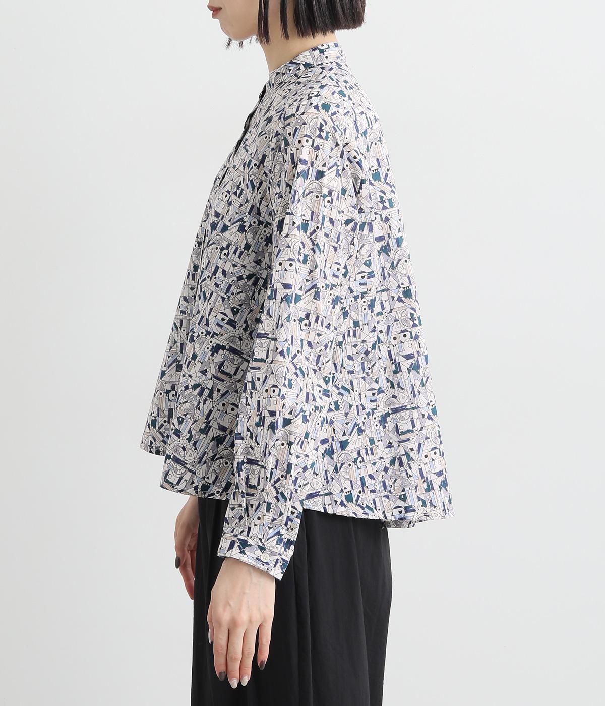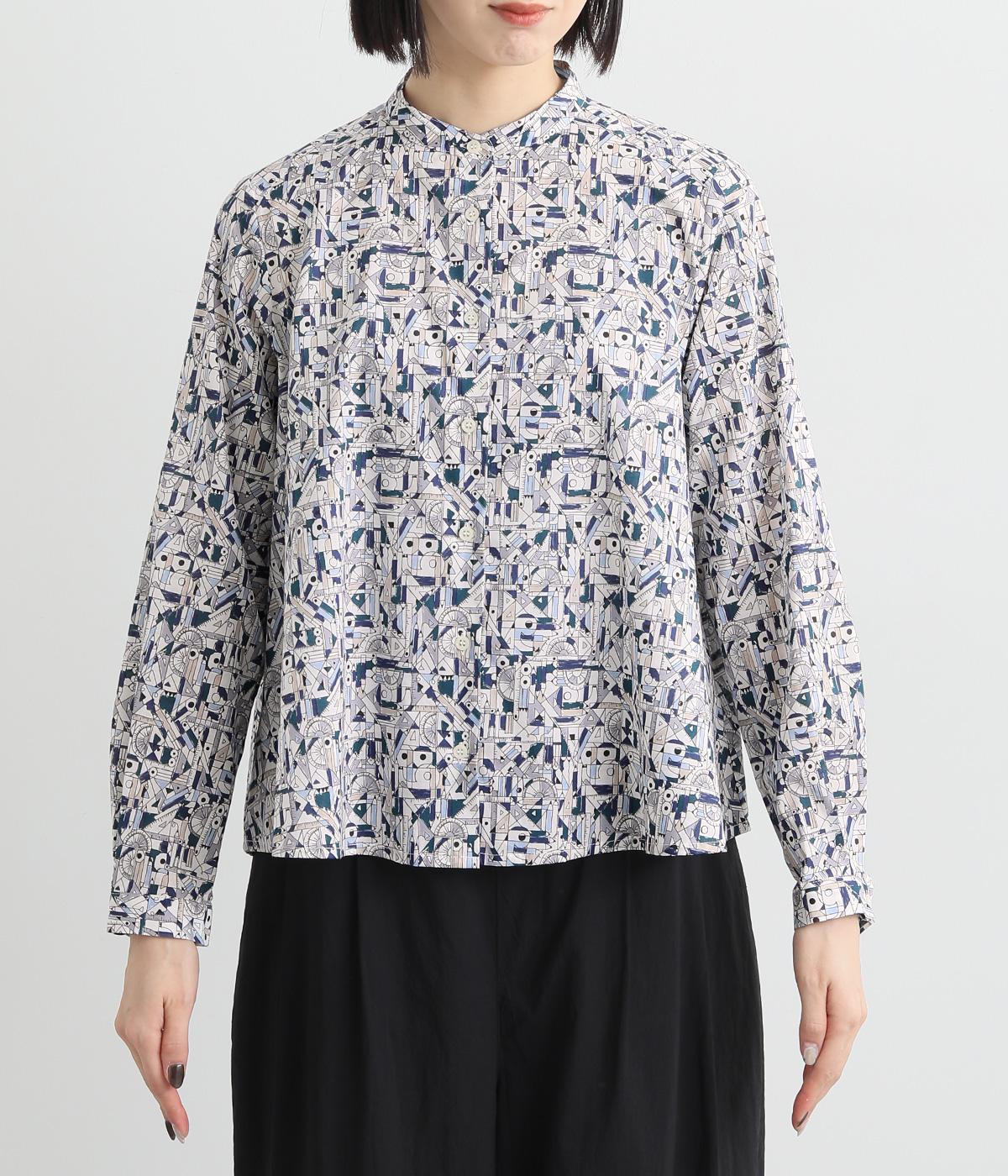 遠目だと幾何学柄にも見えますが、よく見ると文房具がたくさん詰まったユニークな総柄シャツ。Aラインにふわりと広がるシルエットが女性らしさを高めてくれます。小さく立ち上げた襟がきちんと感をプラス。コンパクトな着丈でさまざまなボトムスにバランスよく合わせやすい一枚です。