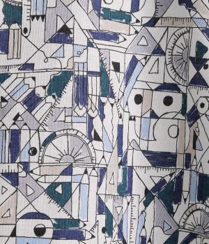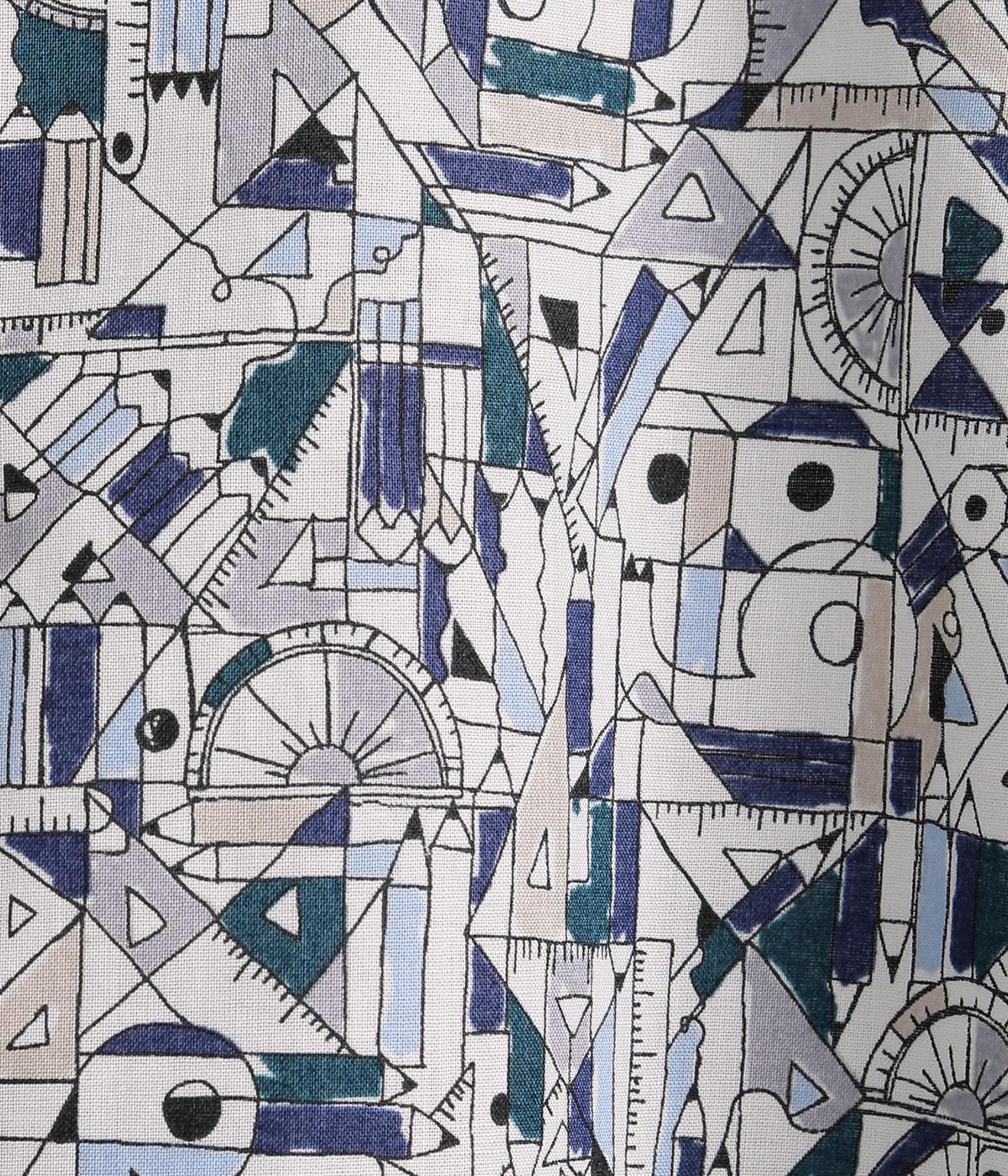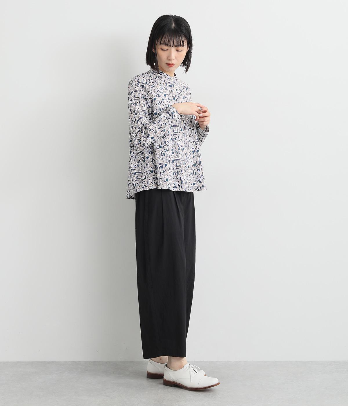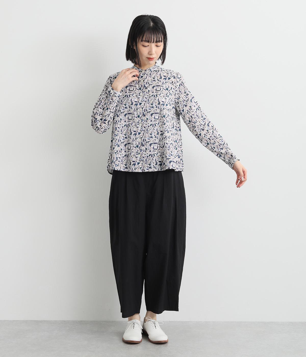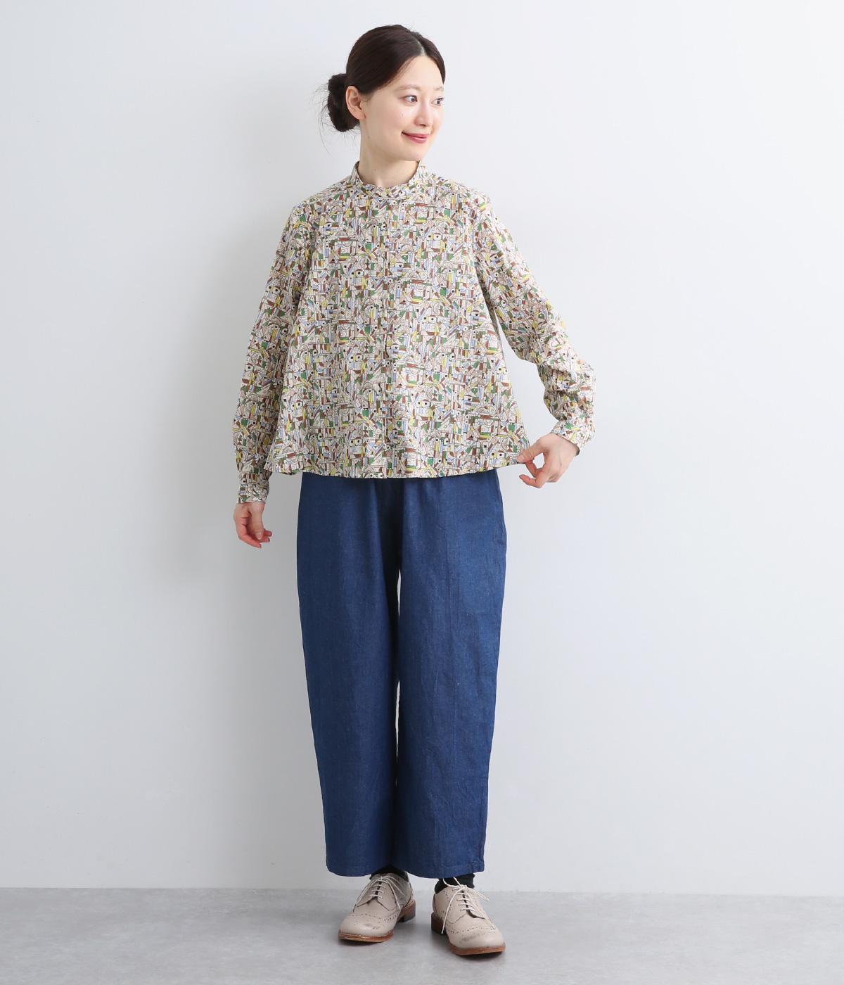 遠目だと幾何学柄にも見えますが、よく見ると文房具がたくさん詰まったユニークな総柄シャツ。Aラインにふわりと広がるシルエットが女性らしさを高めてくれます。小さく立ち上げた襟がきちんと感をプラス。コンパクトな着丈でさまざまなボトムスにバランスよく合わせやすい一枚です。