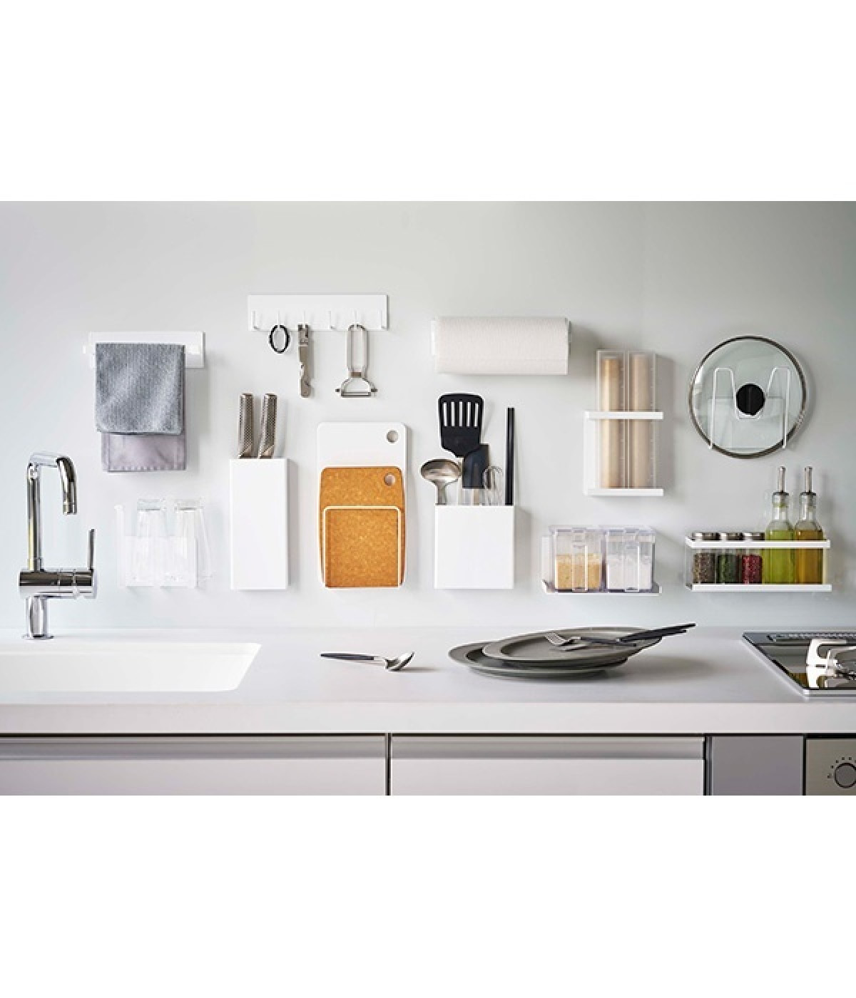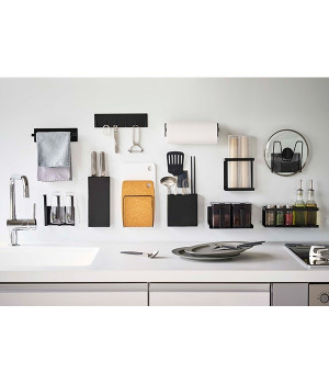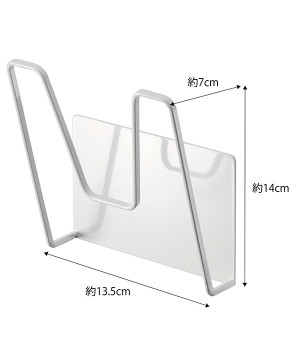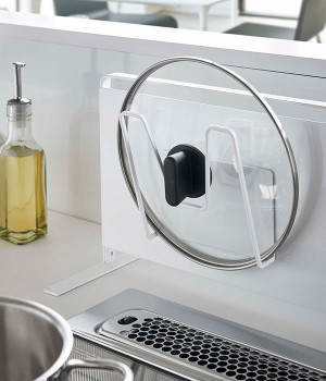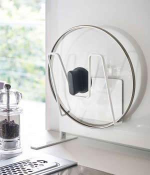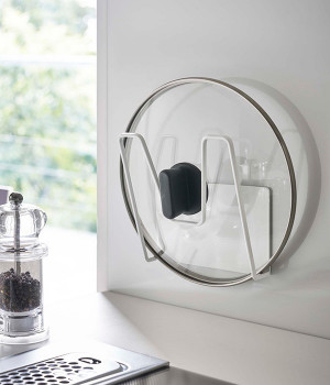 冷蔵庫やスチール壁面にピタッと取り付けられる、裏面に磁力の強いラバーマグネットが付いた鍋蓋ホルダー。直径約14cm以上の鍋蓋に対応しており、コンロ近くに設置すれば調理中に蓋を一時置く際に使えますし、シンク回りに設置すれば洗い終わったあとの水切りスペースとして役立ちます。耐荷重は約1kg。鍋蓋につまみがあっても収納しやすいよう、M字型のフレームになっているのもポイントです。