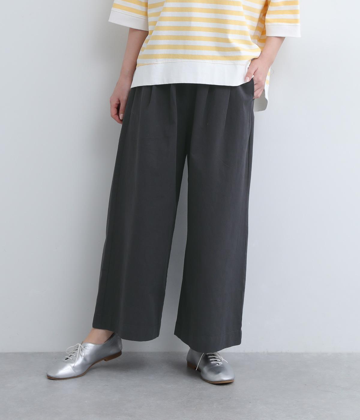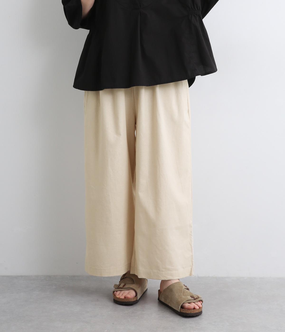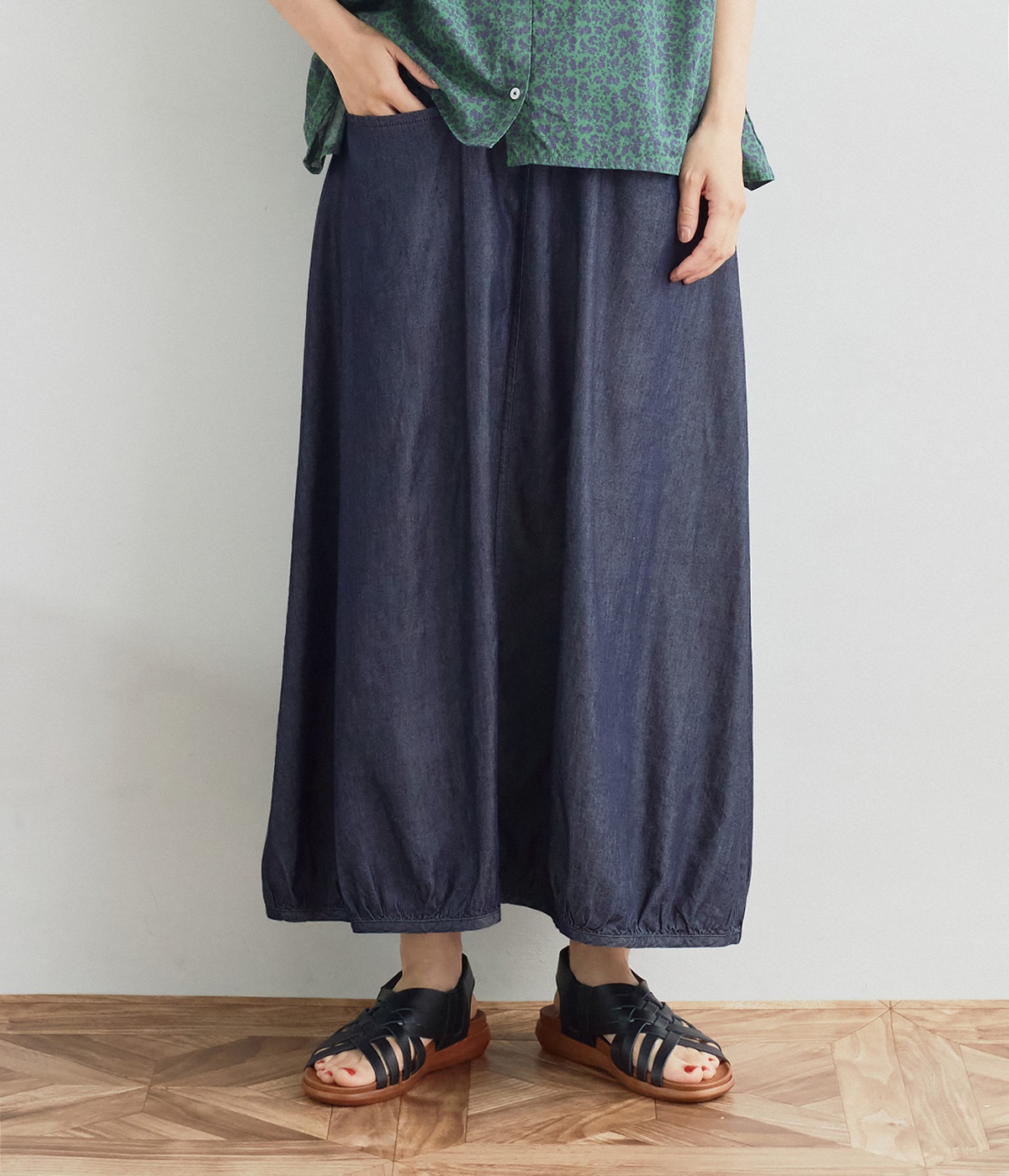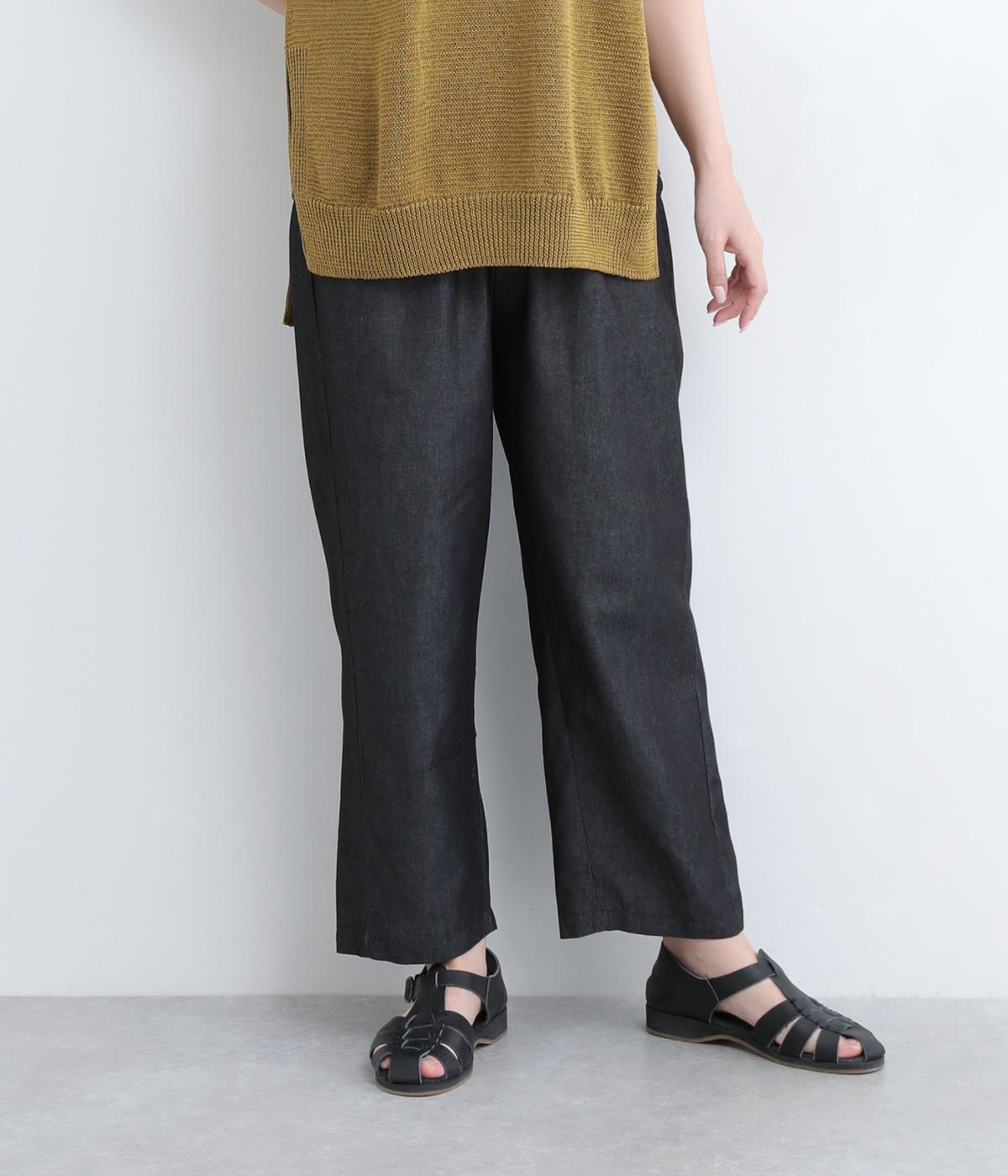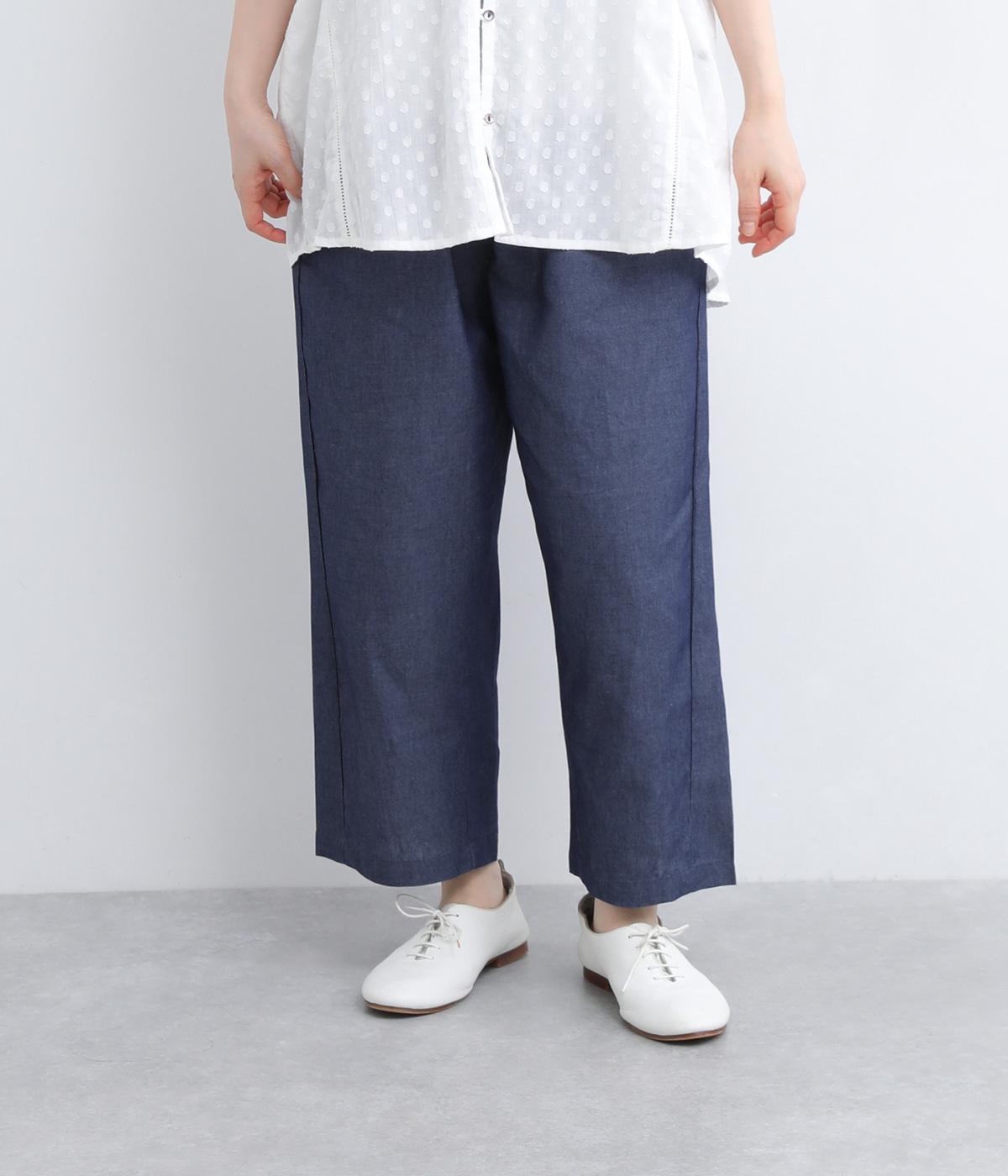 リネンコットンデニム裾ギャザーパンツインディゴ