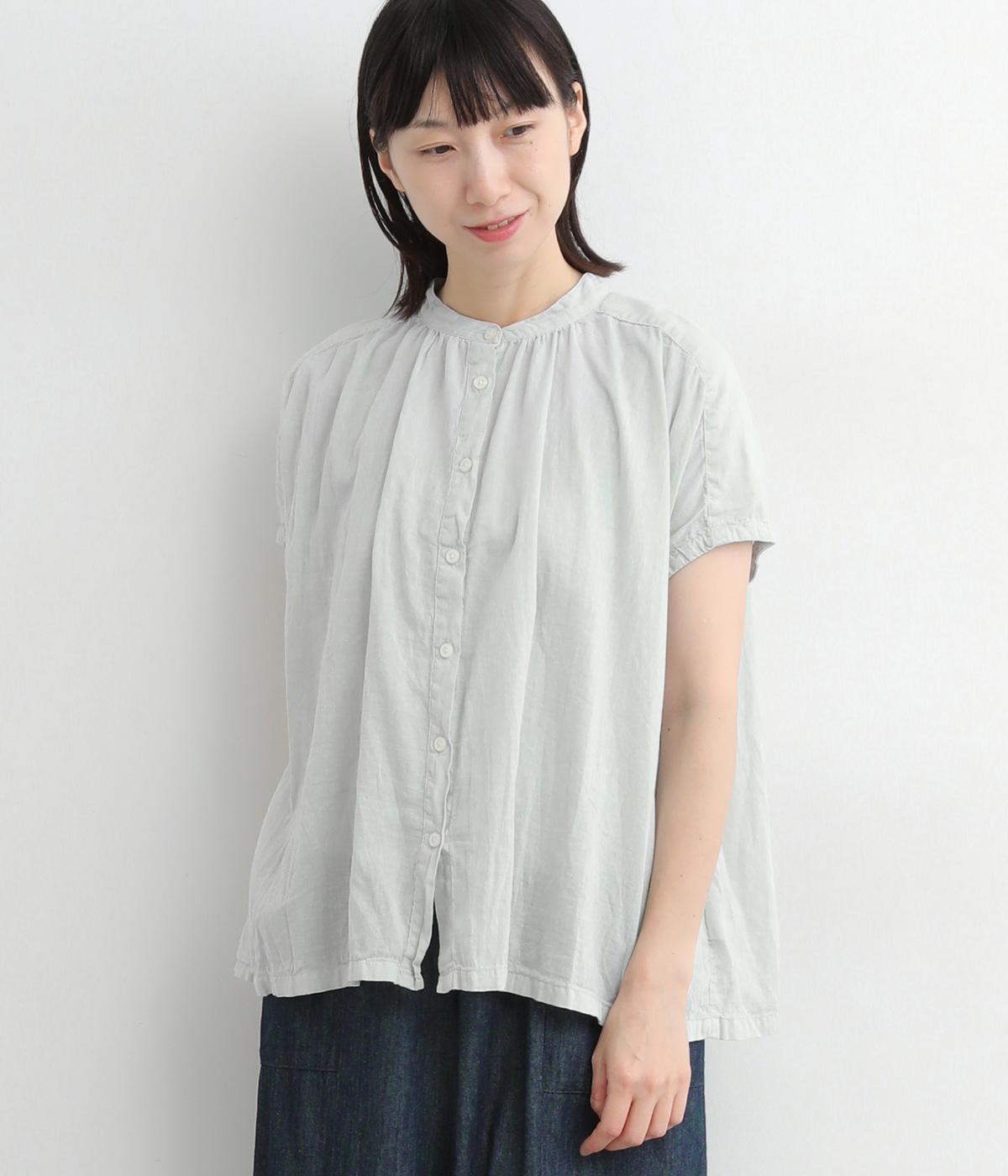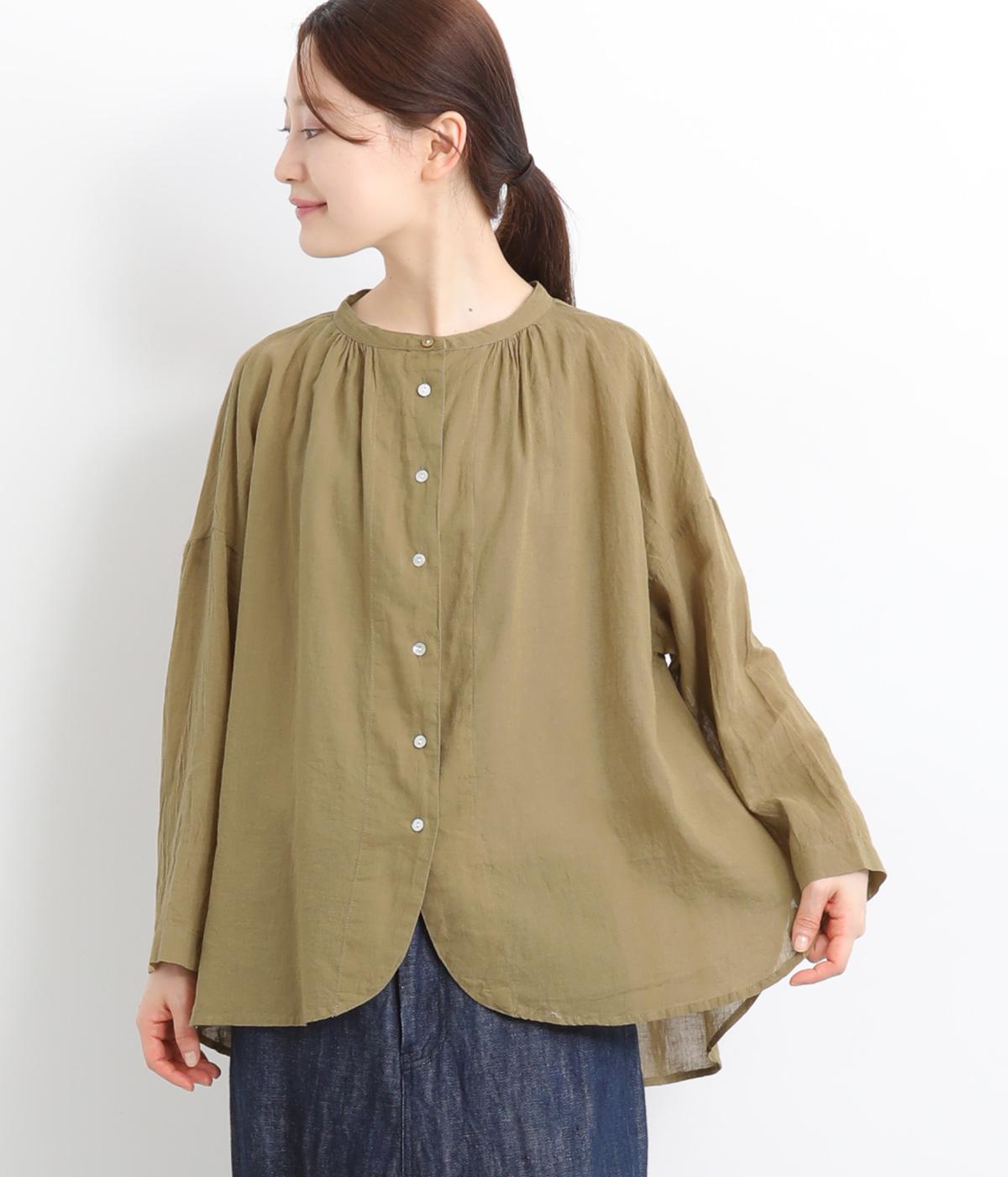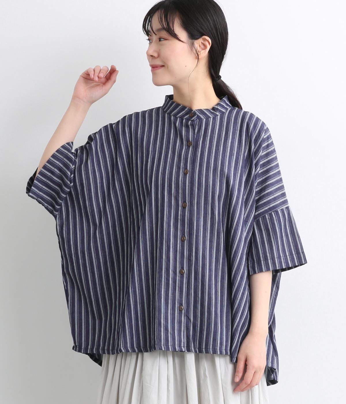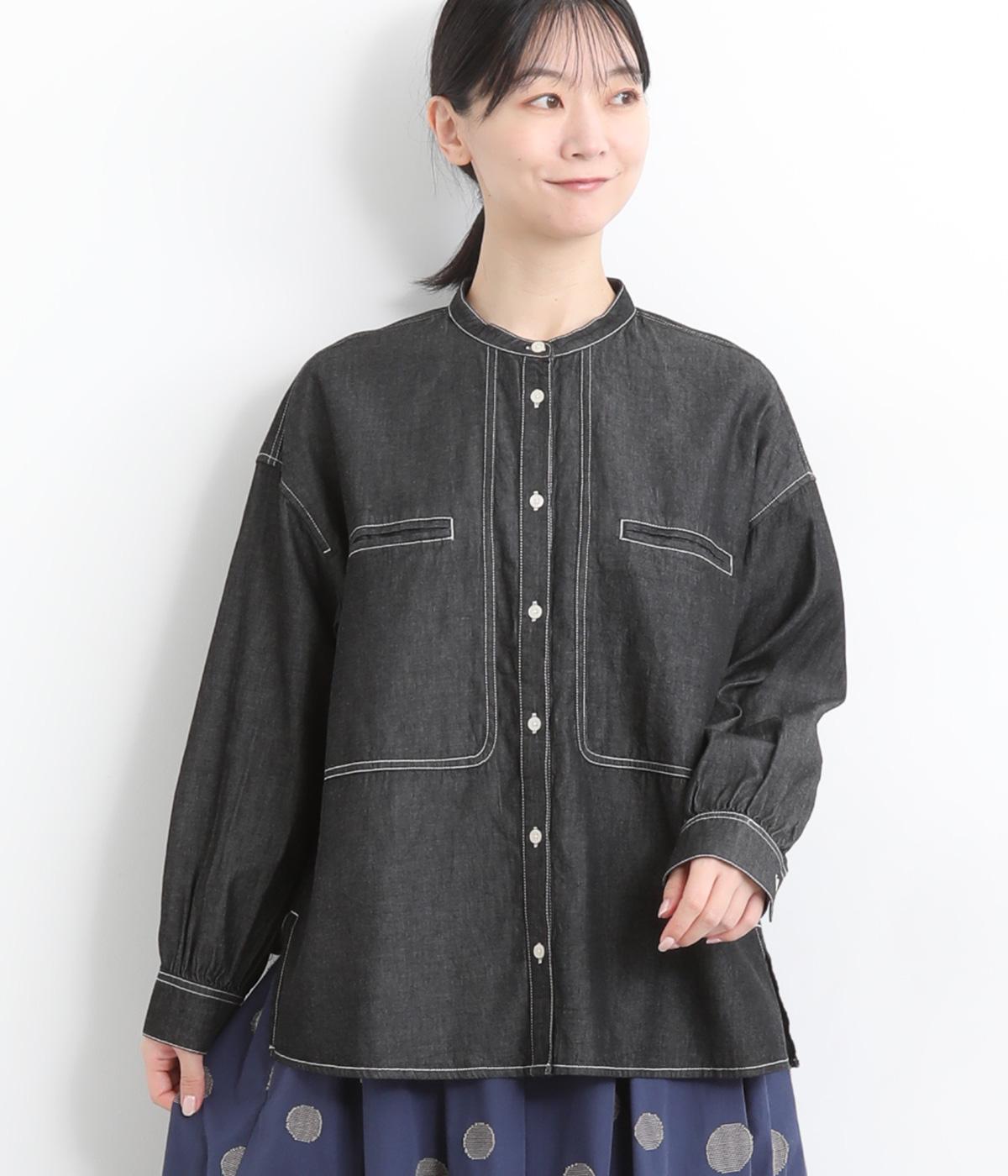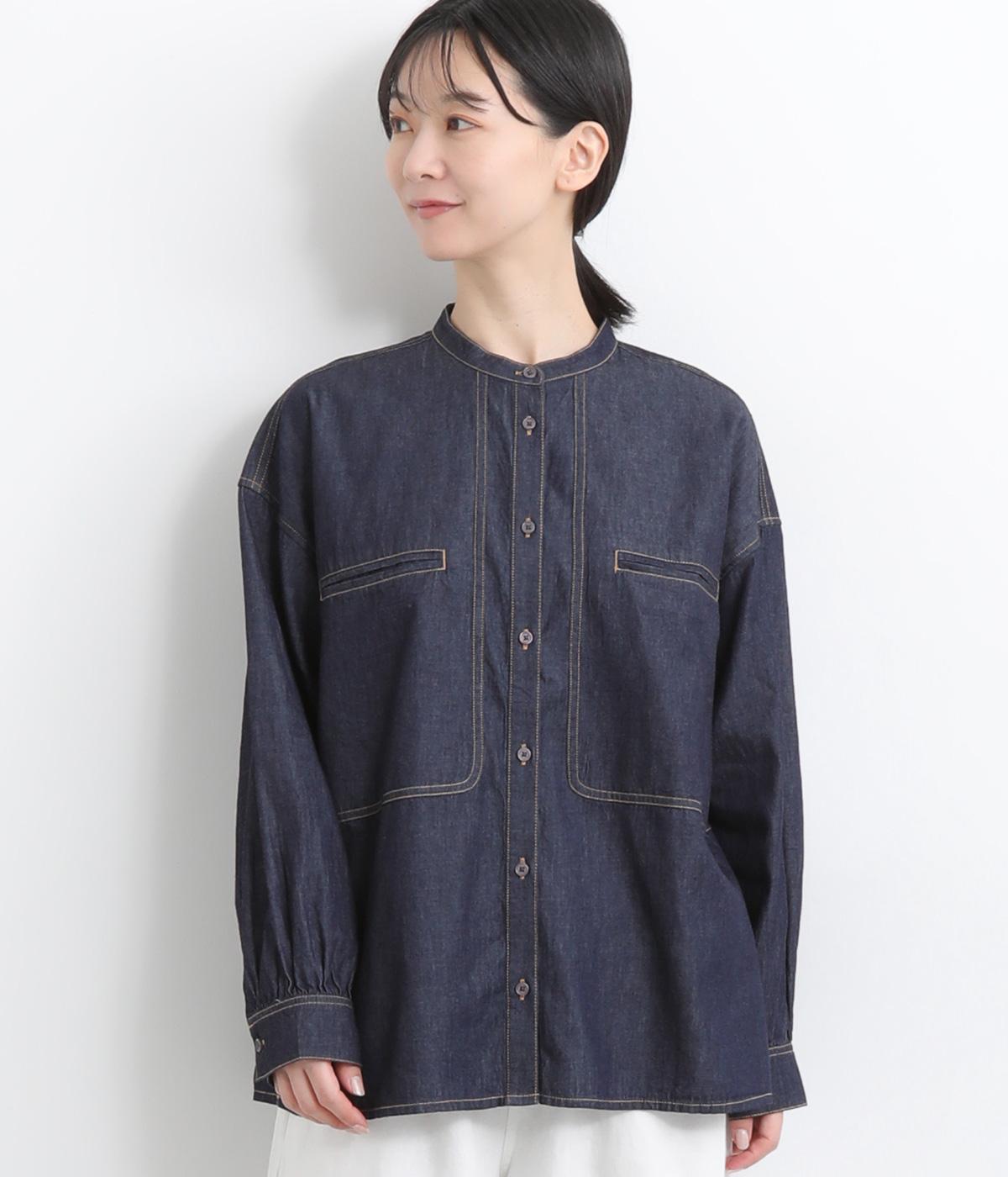 リネンコットンデニムバンド襟シャツブラウスインディゴ