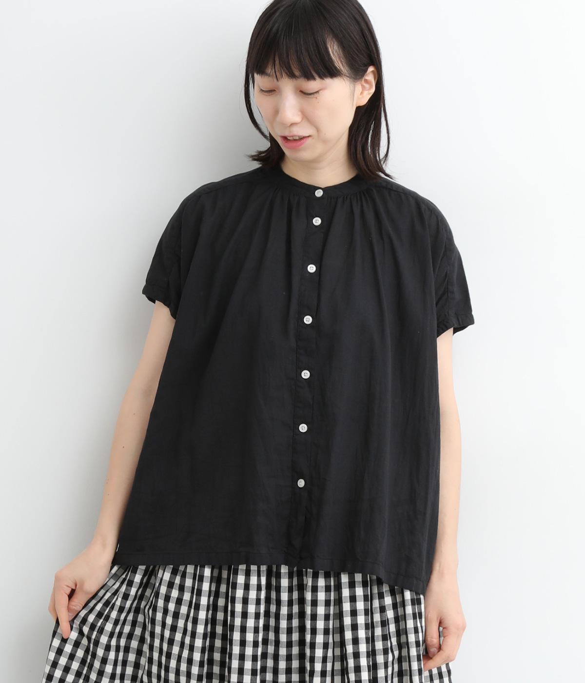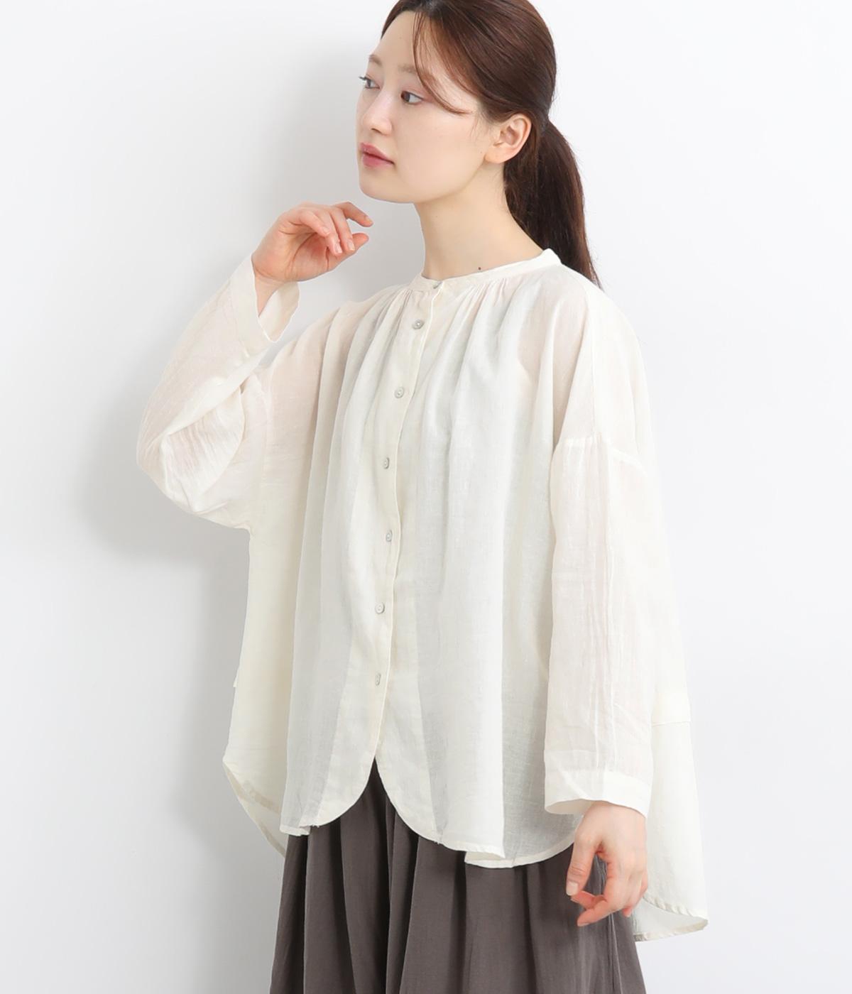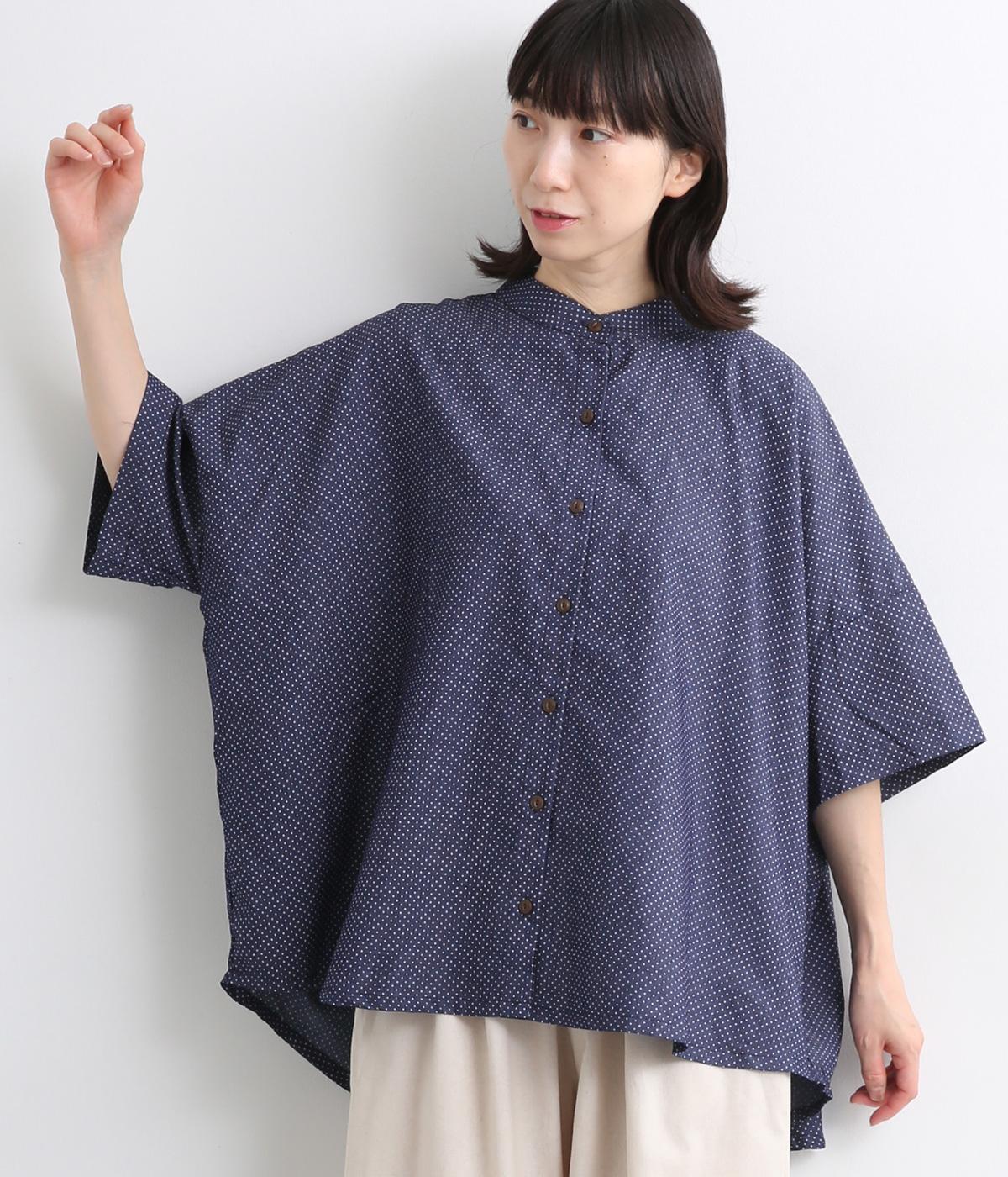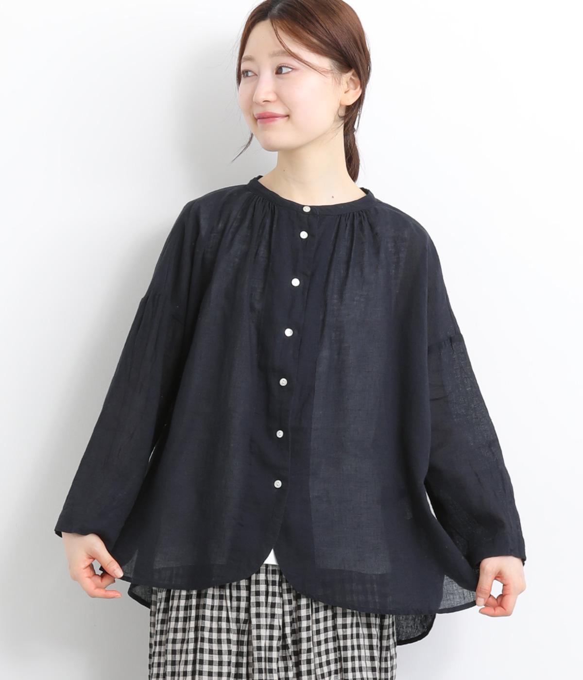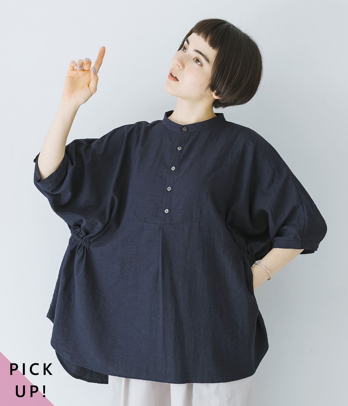 リネンコットンデニムバンド襟シャツブラウスインディゴ
