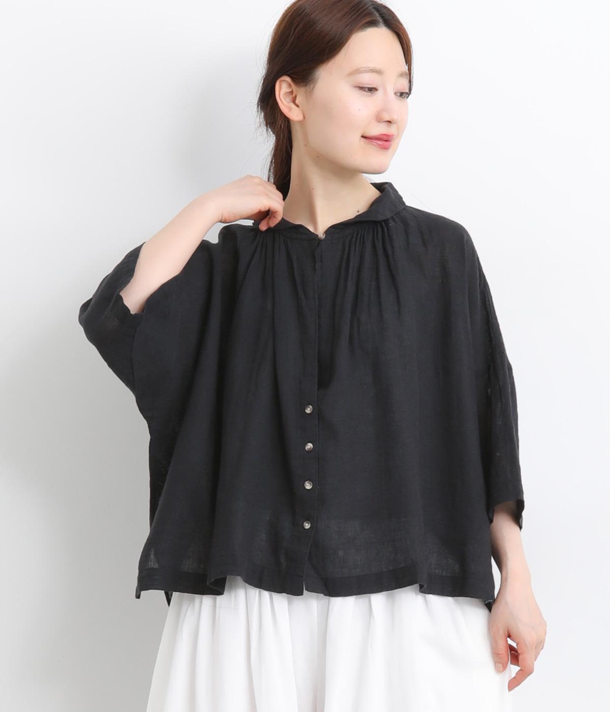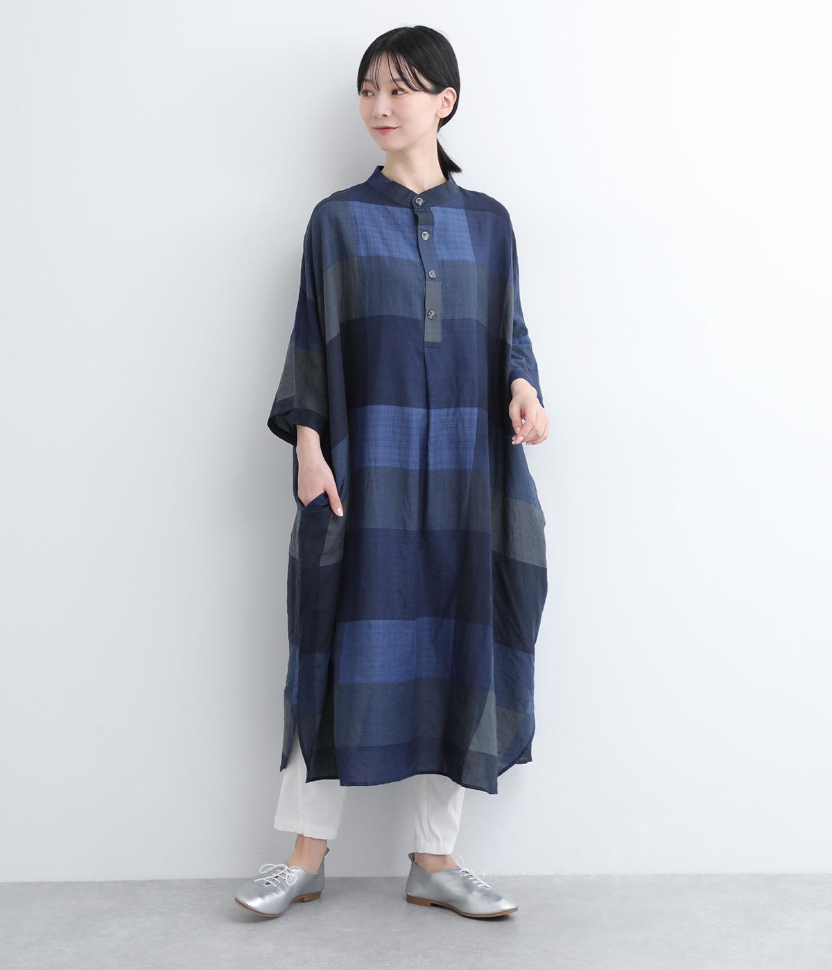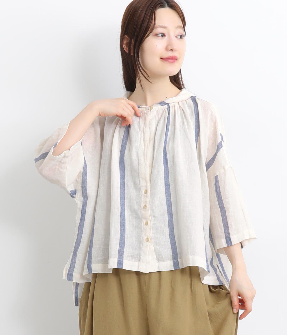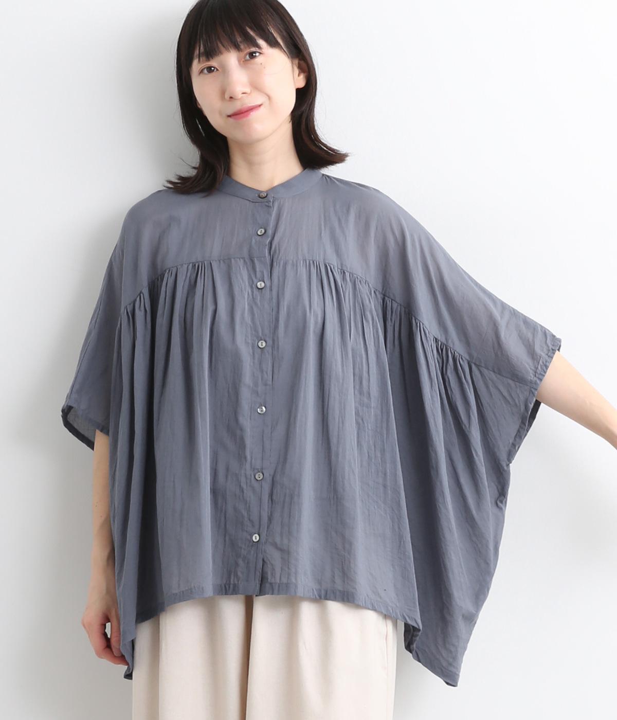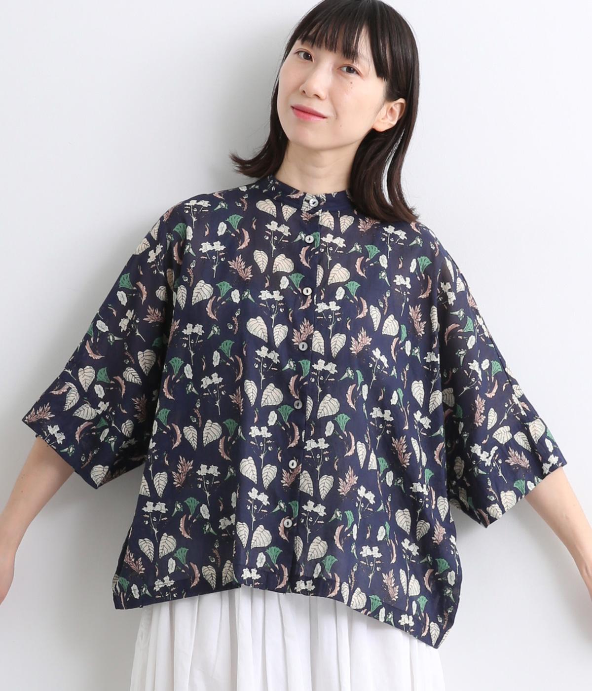 リネンコットンデニムバンド襟シャツブラウスインディゴ