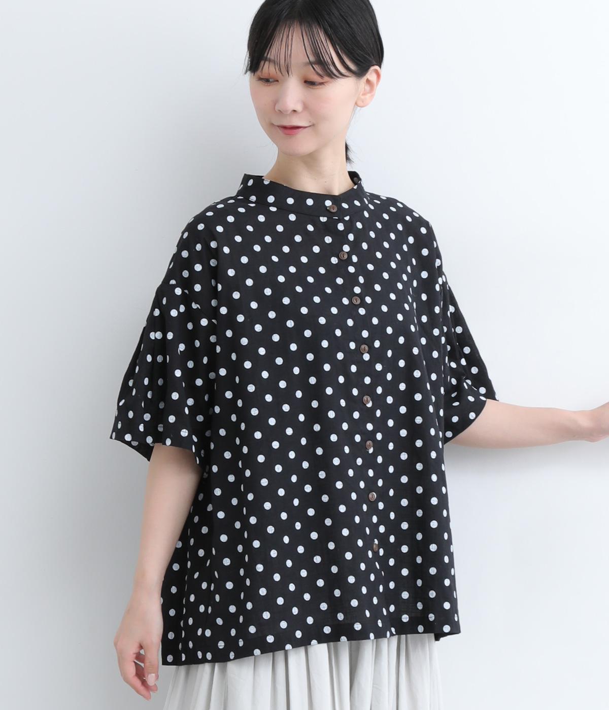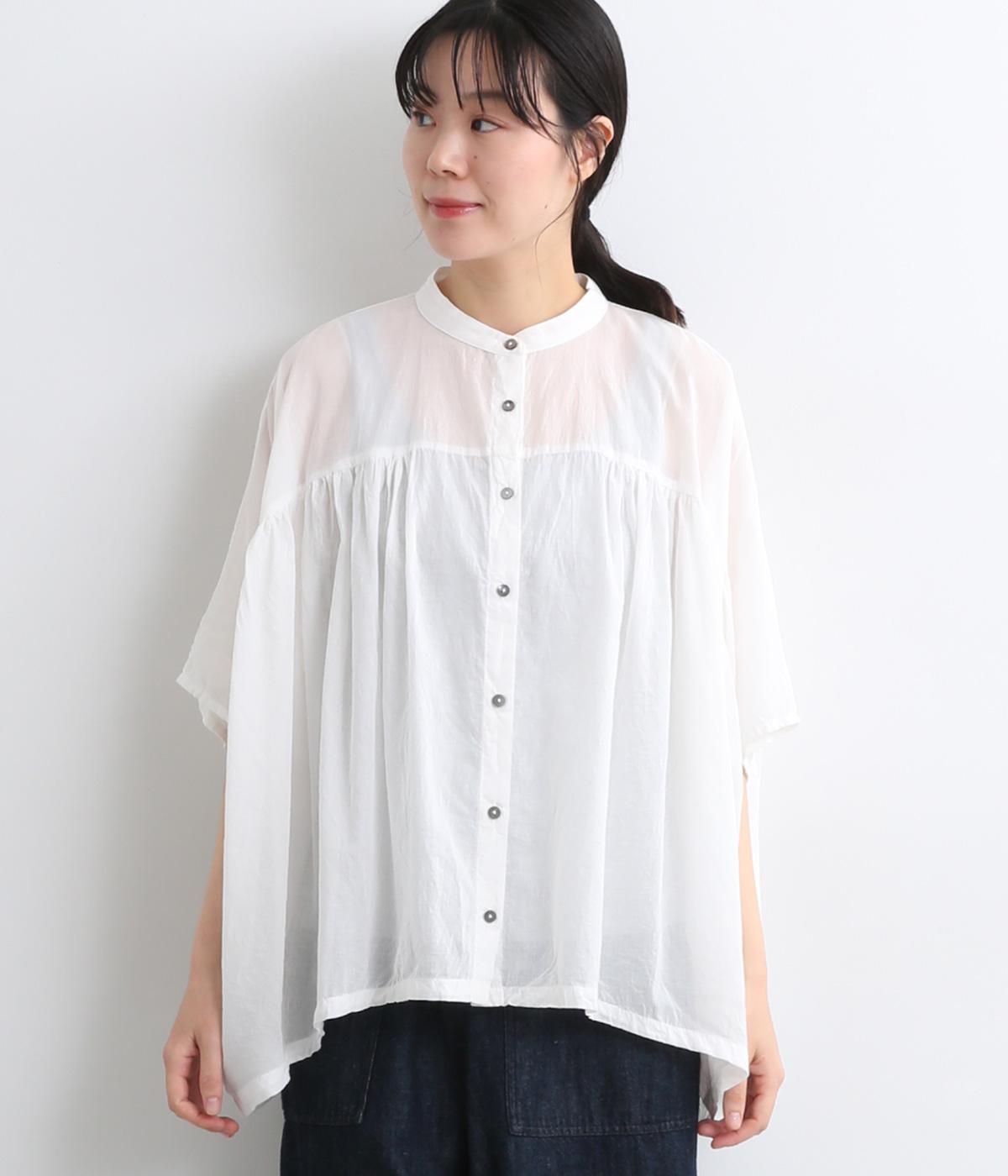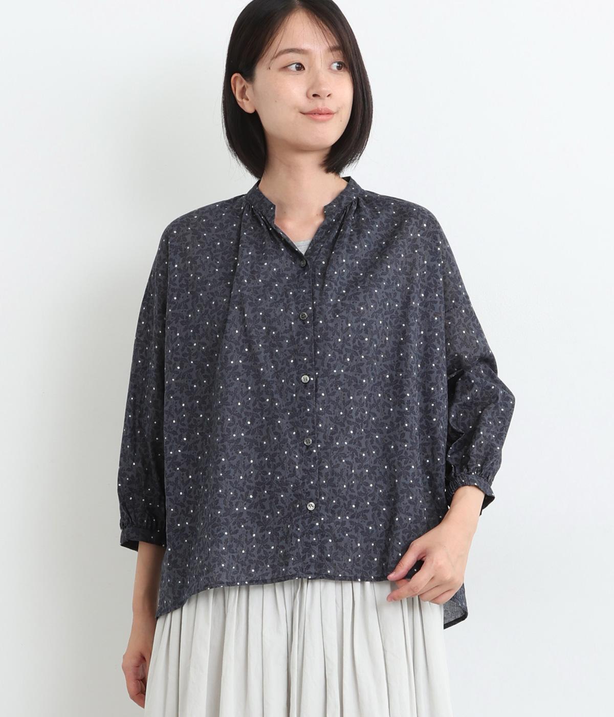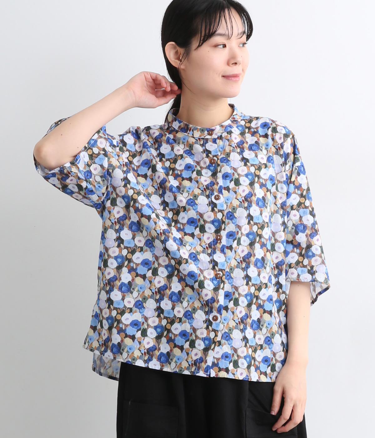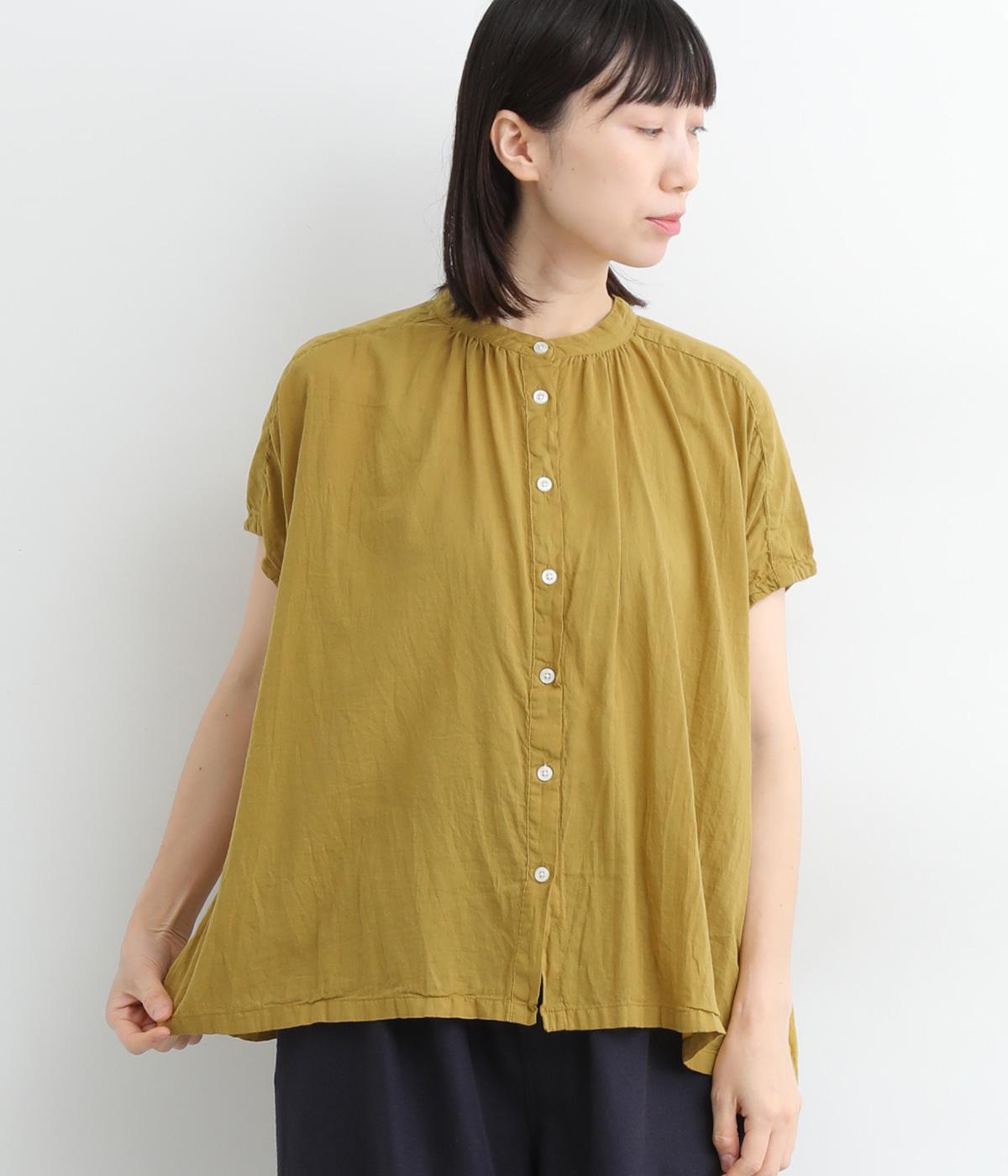 リネンコットンデニムバンド襟シャツブラウスインディゴ