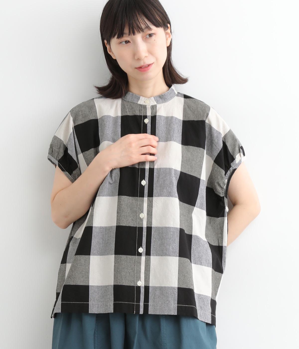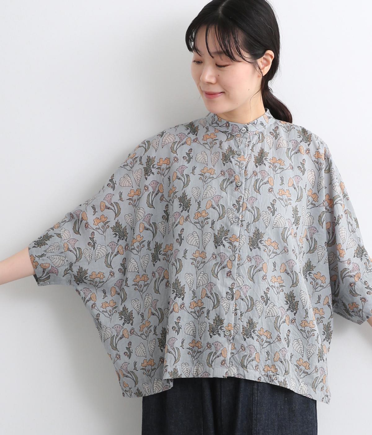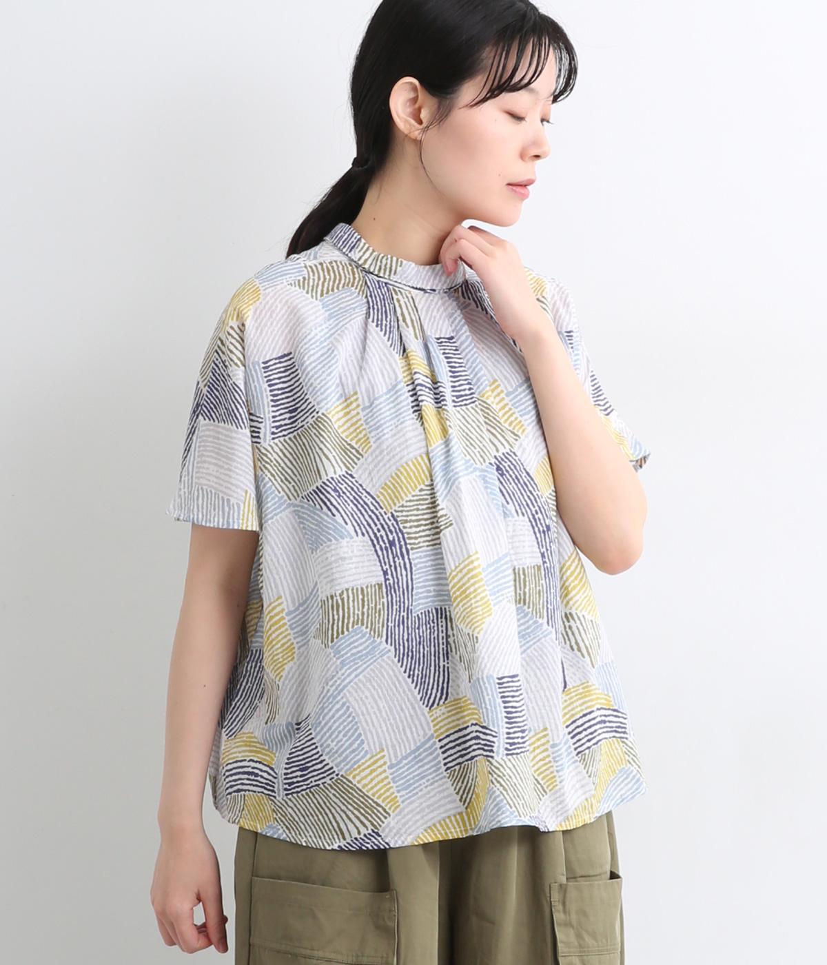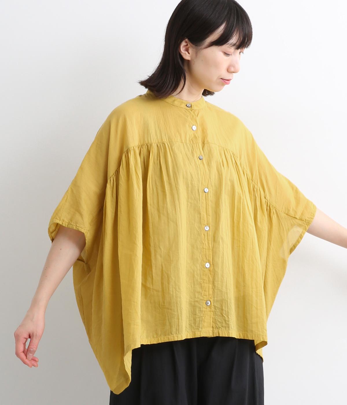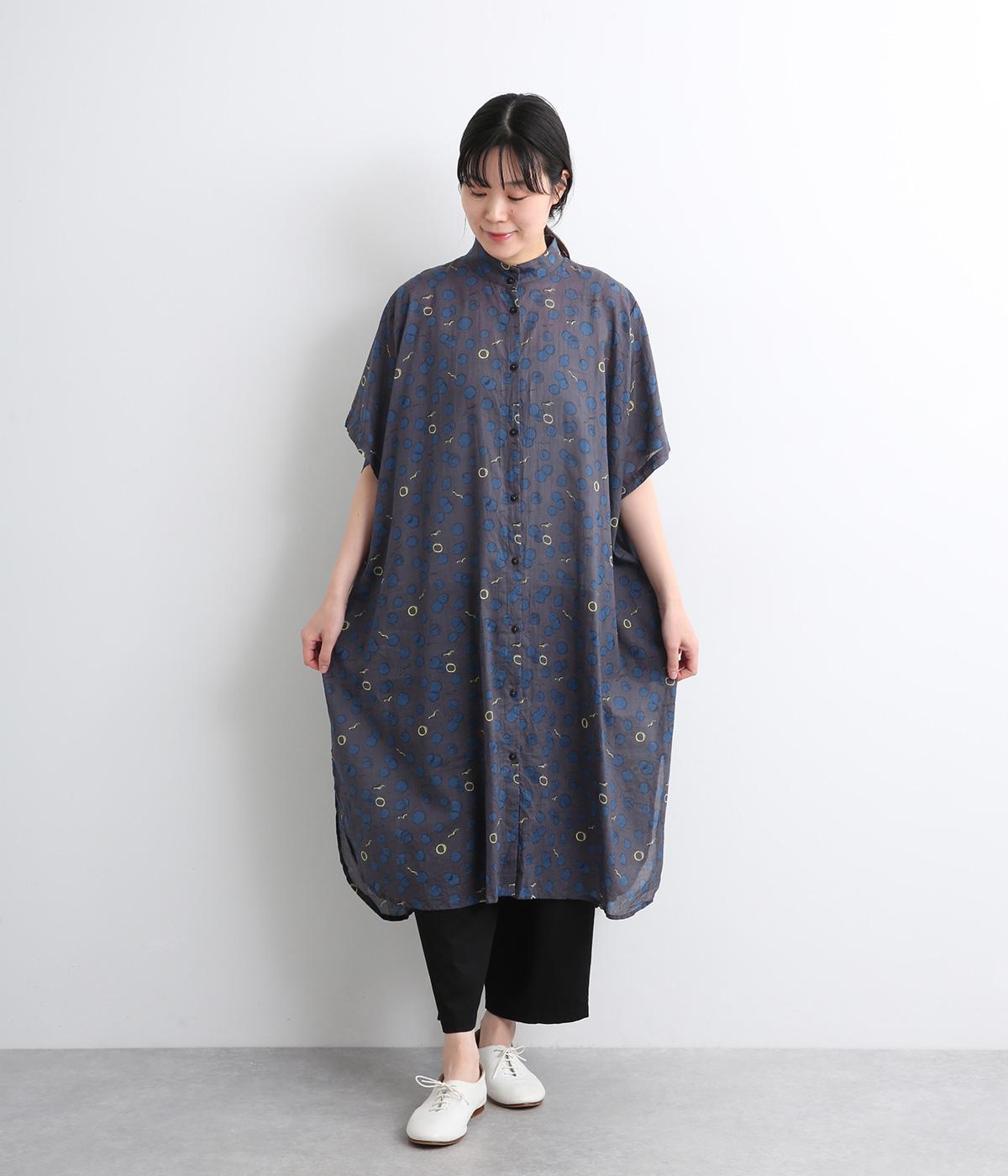 リネンコットンデニムバンド襟シャツブラウスインディゴ