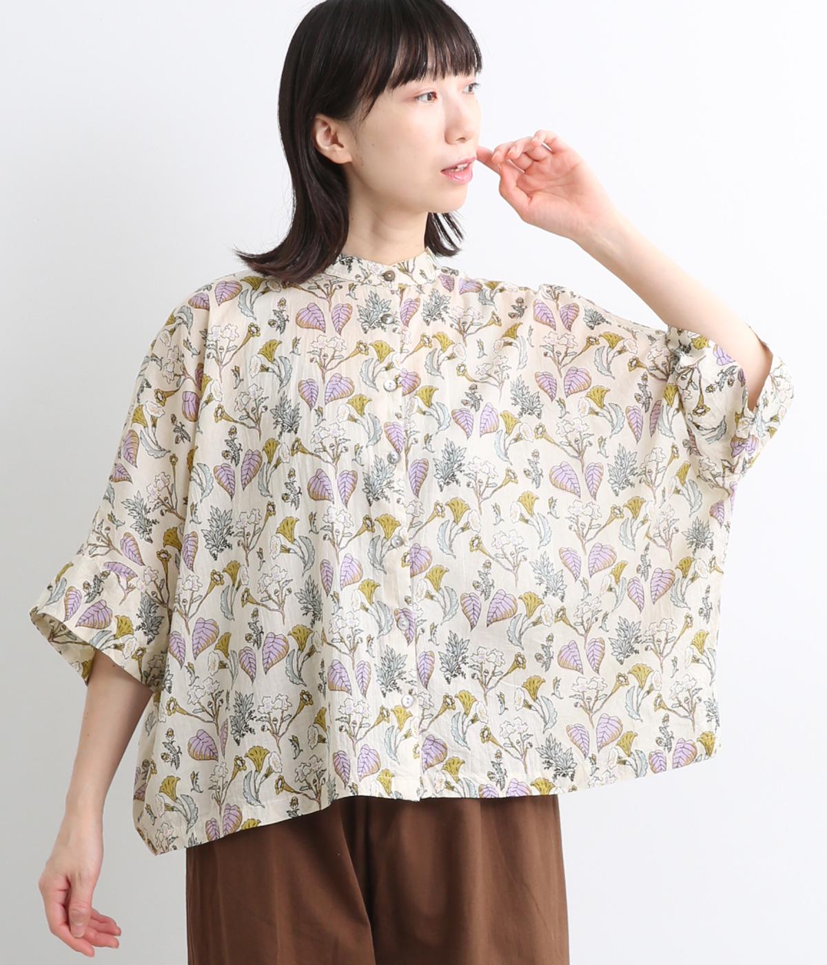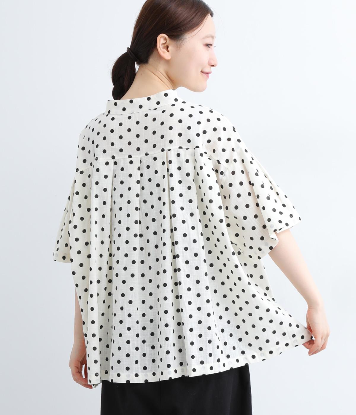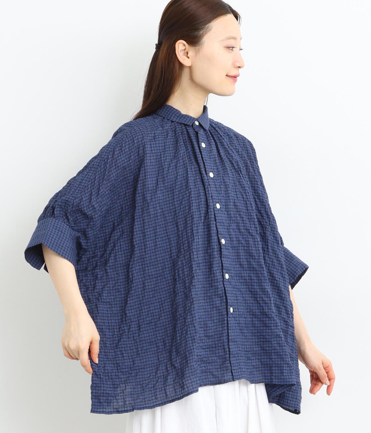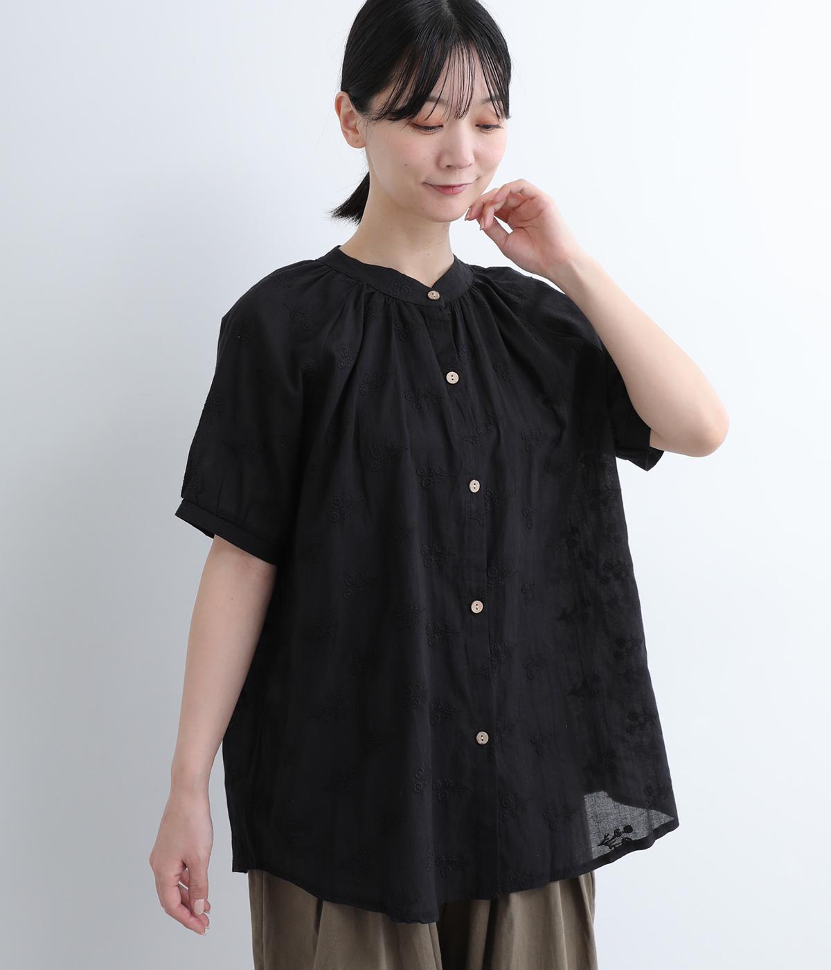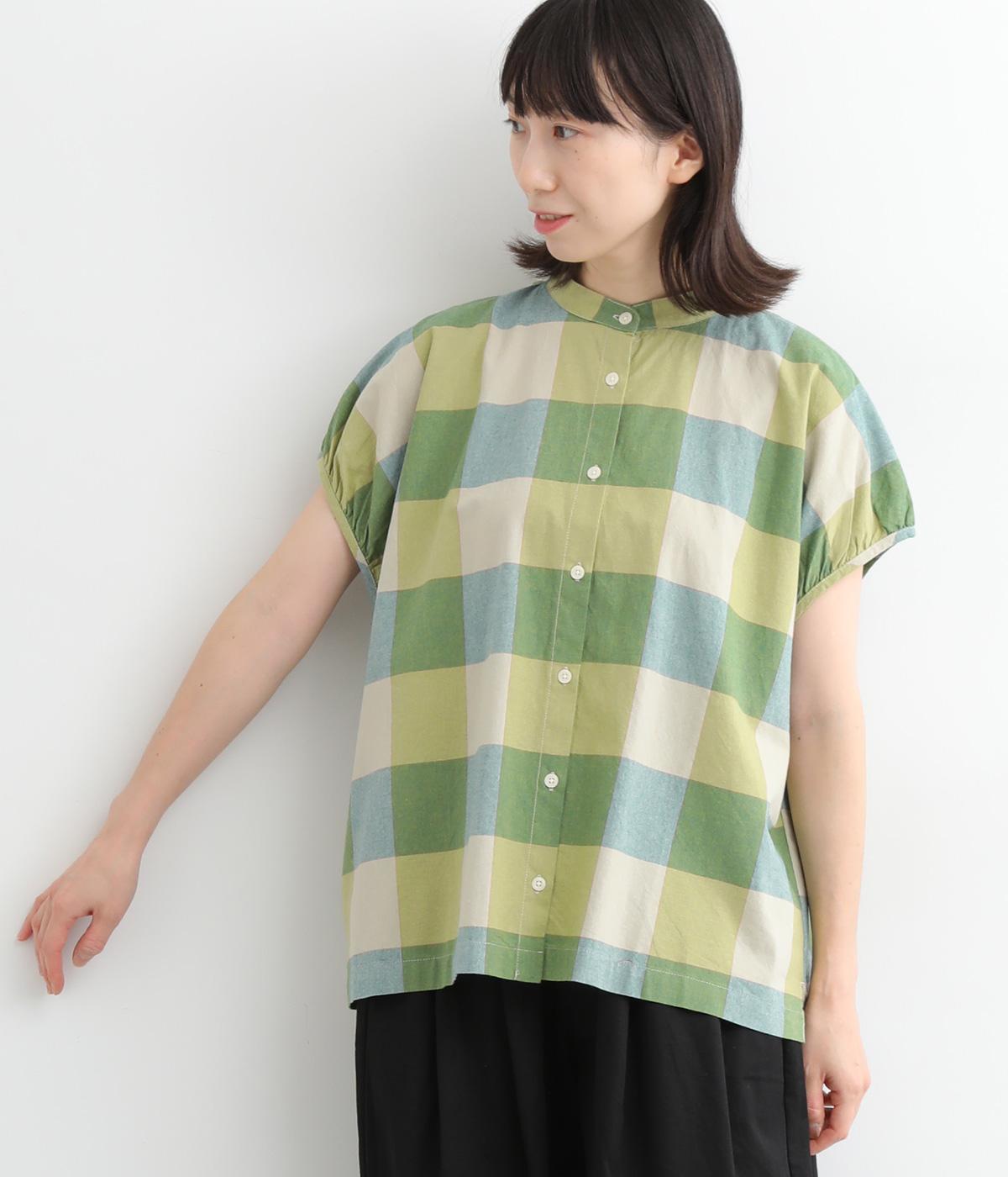 リネンコットンデニムバンド襟シャツブラウスインディゴ