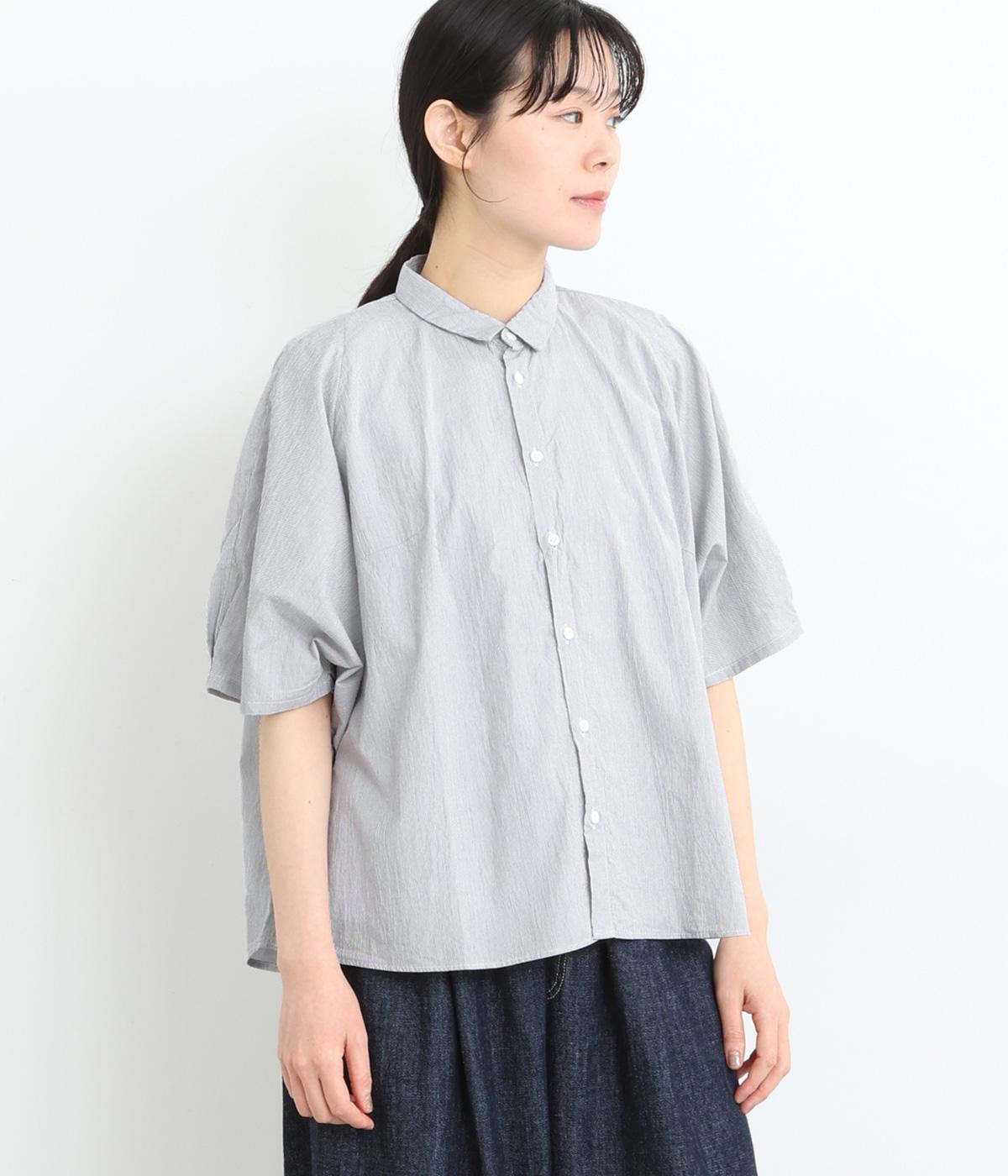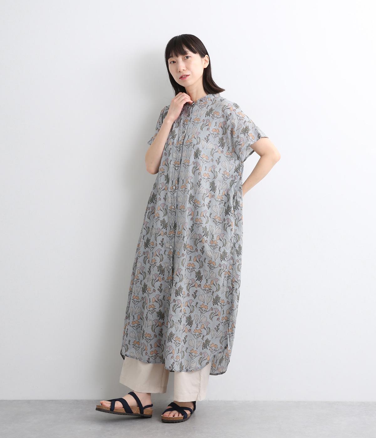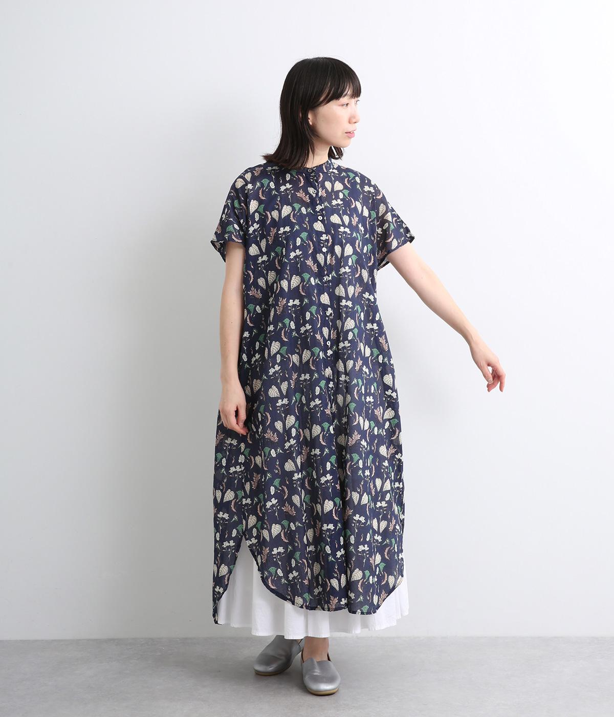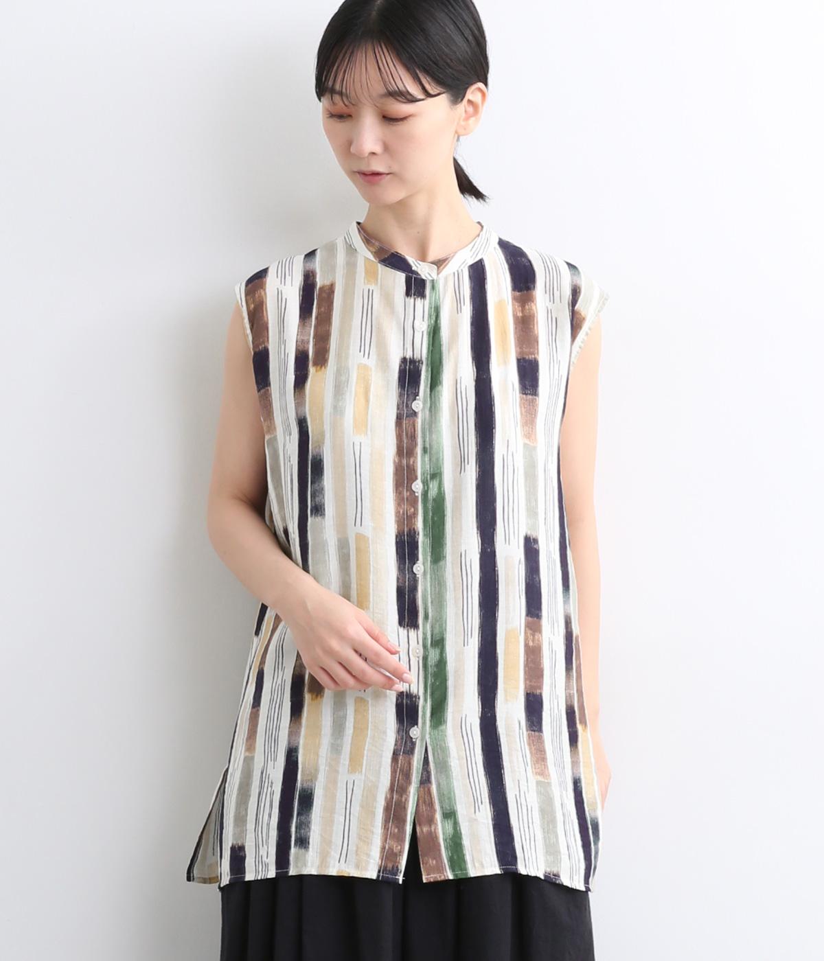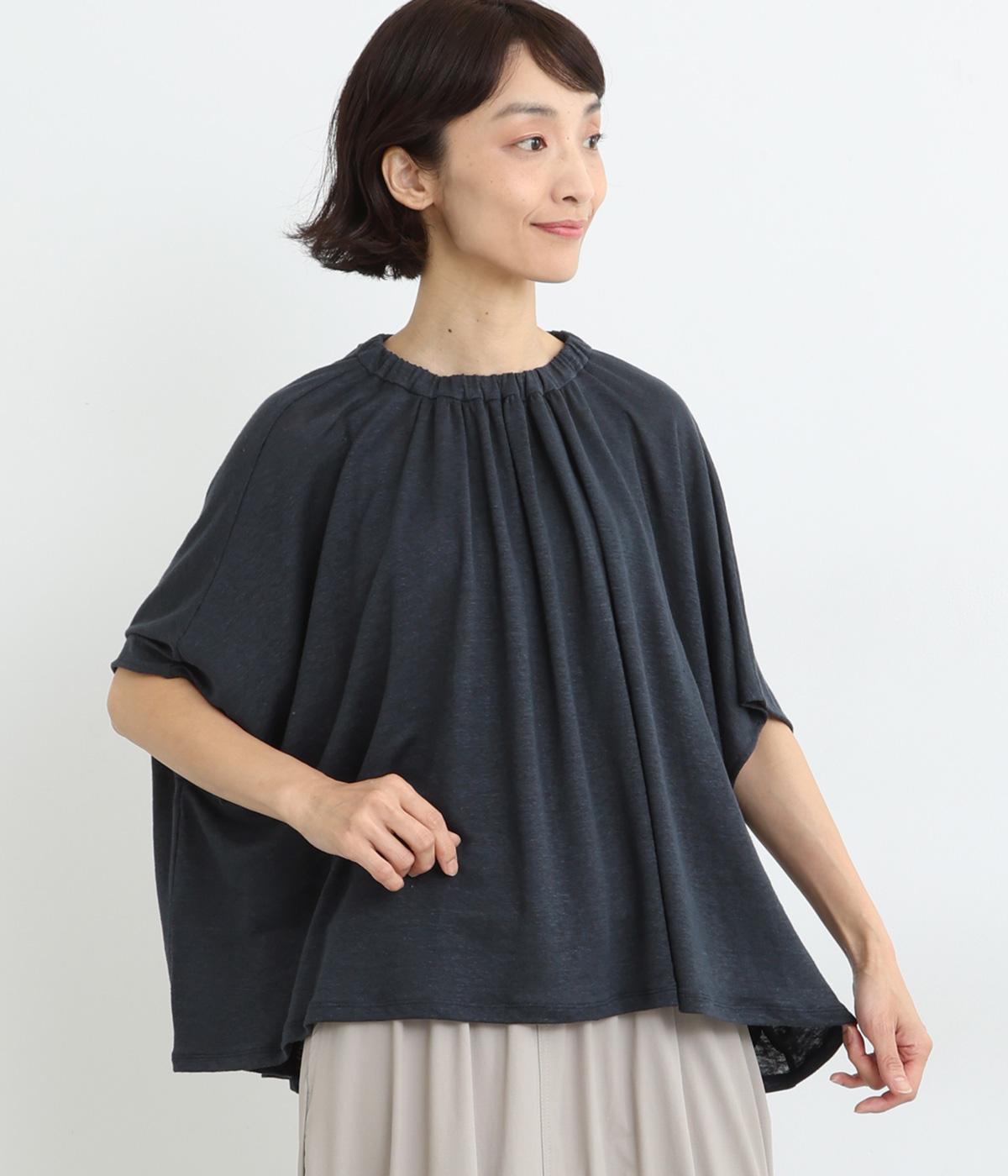 リネンコットンデニムバンド襟シャツブラウスインディゴ