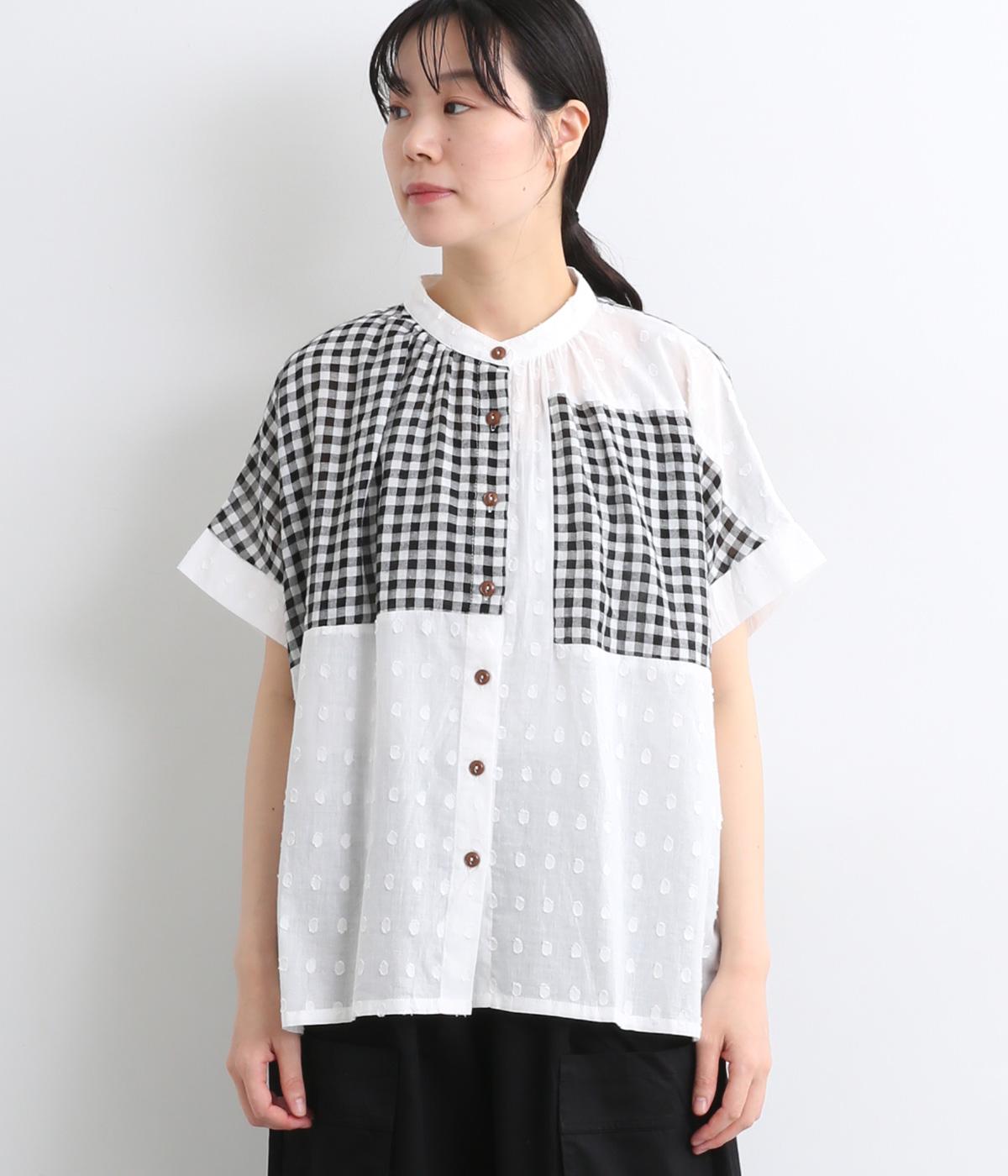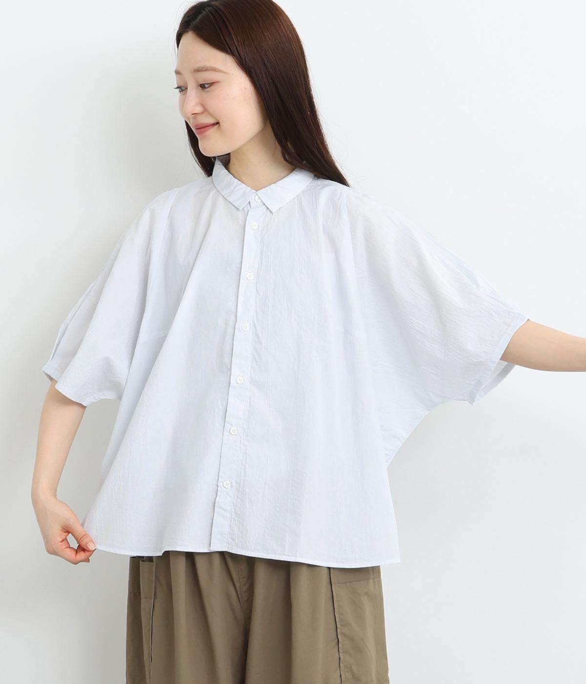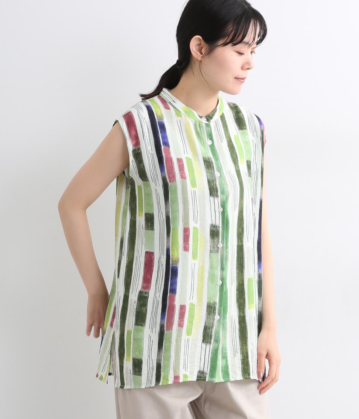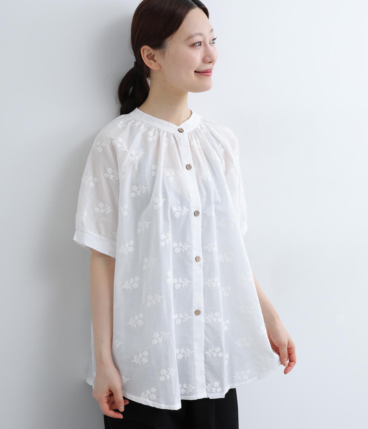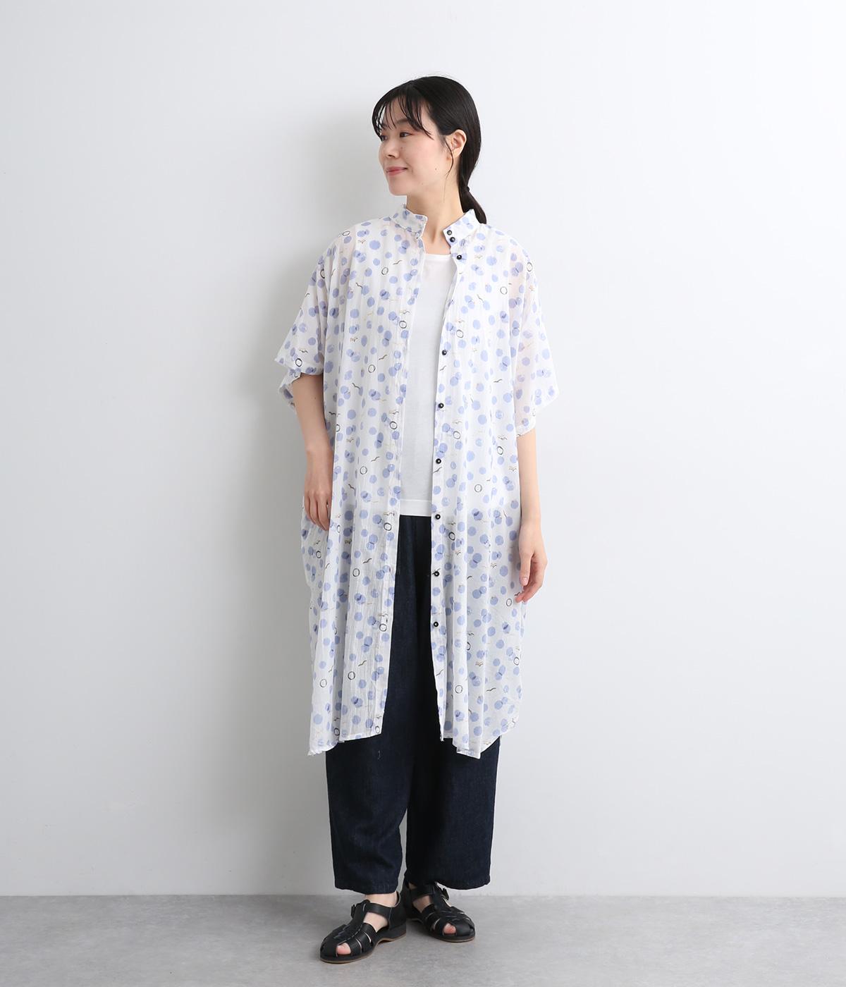 リネンコットンデニムバンド襟シャツブラウスインディゴ