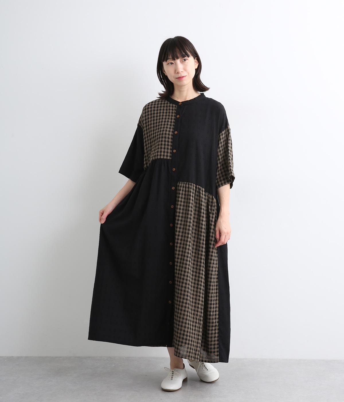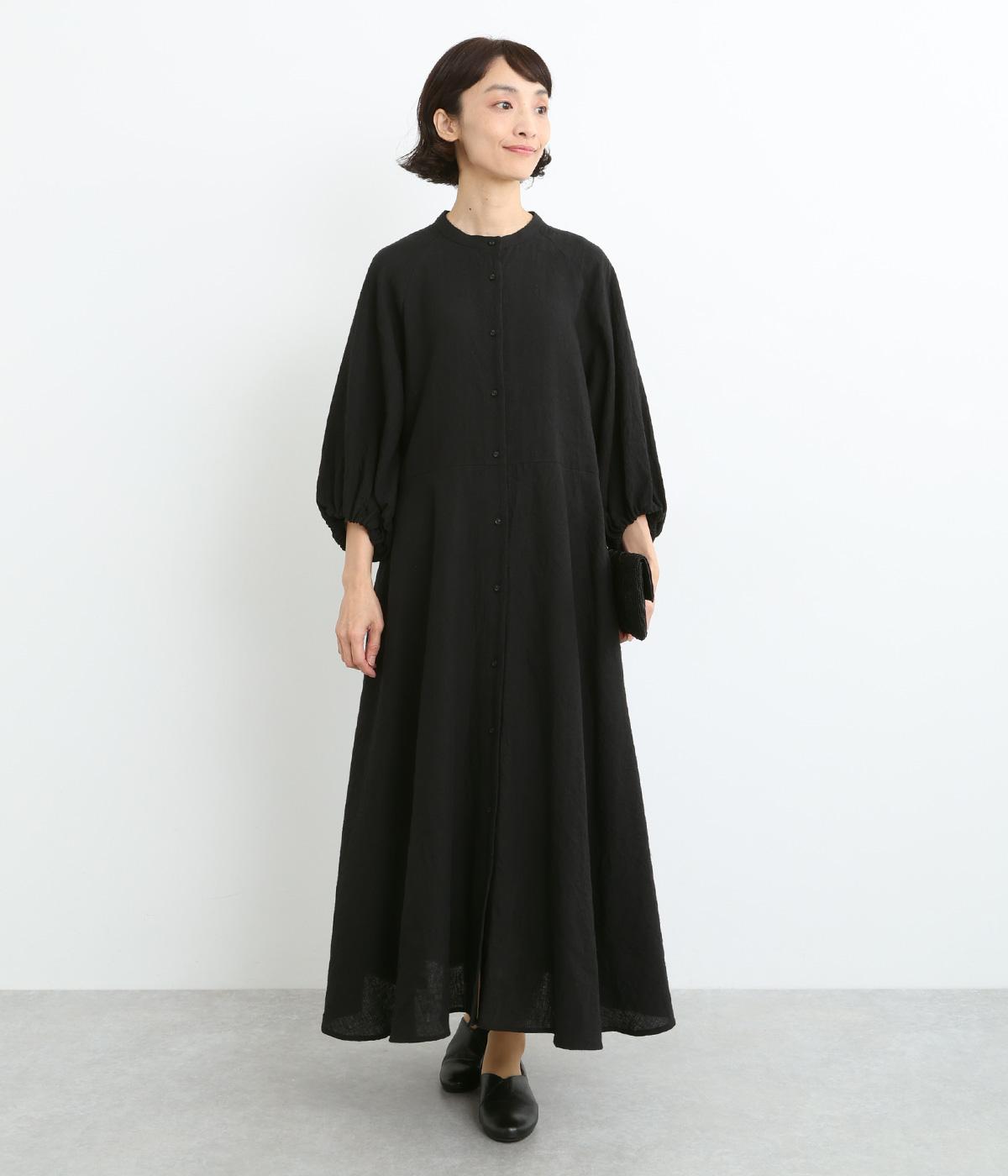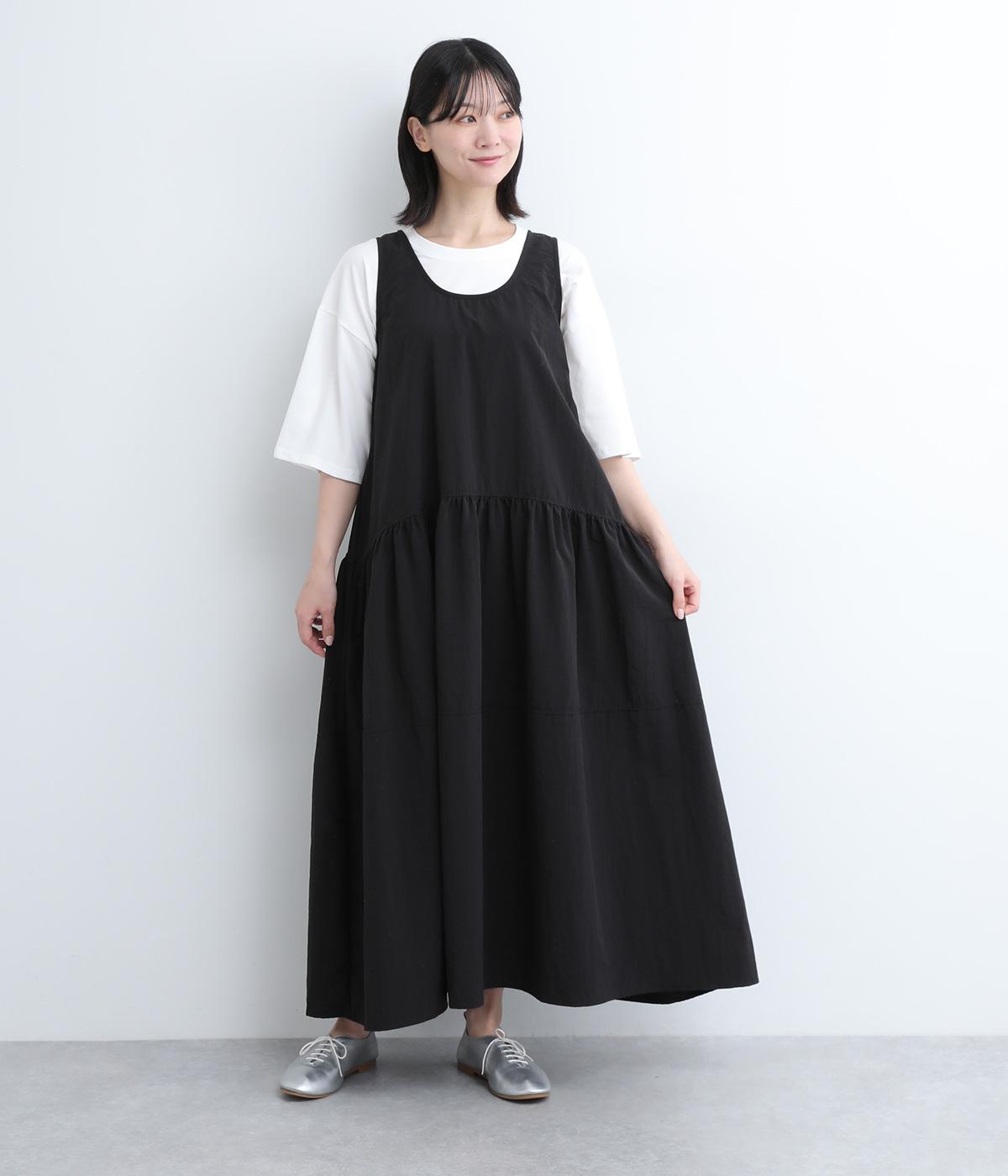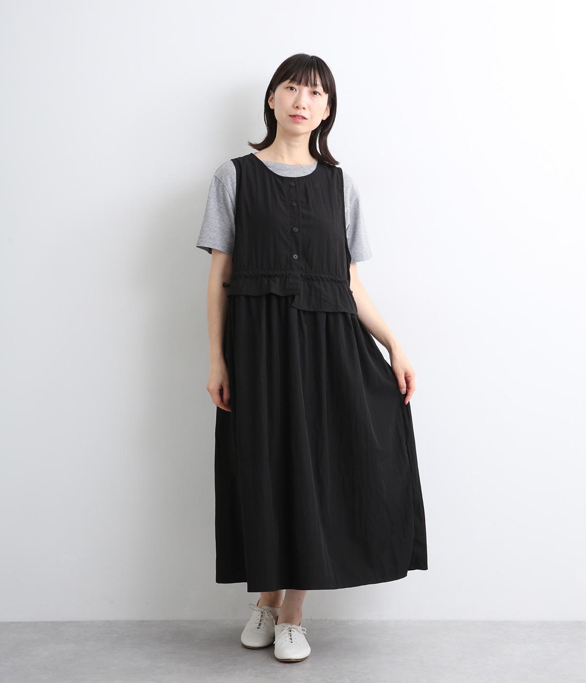 コットン細コール襟フリル切替ギャザーワンピースブラック