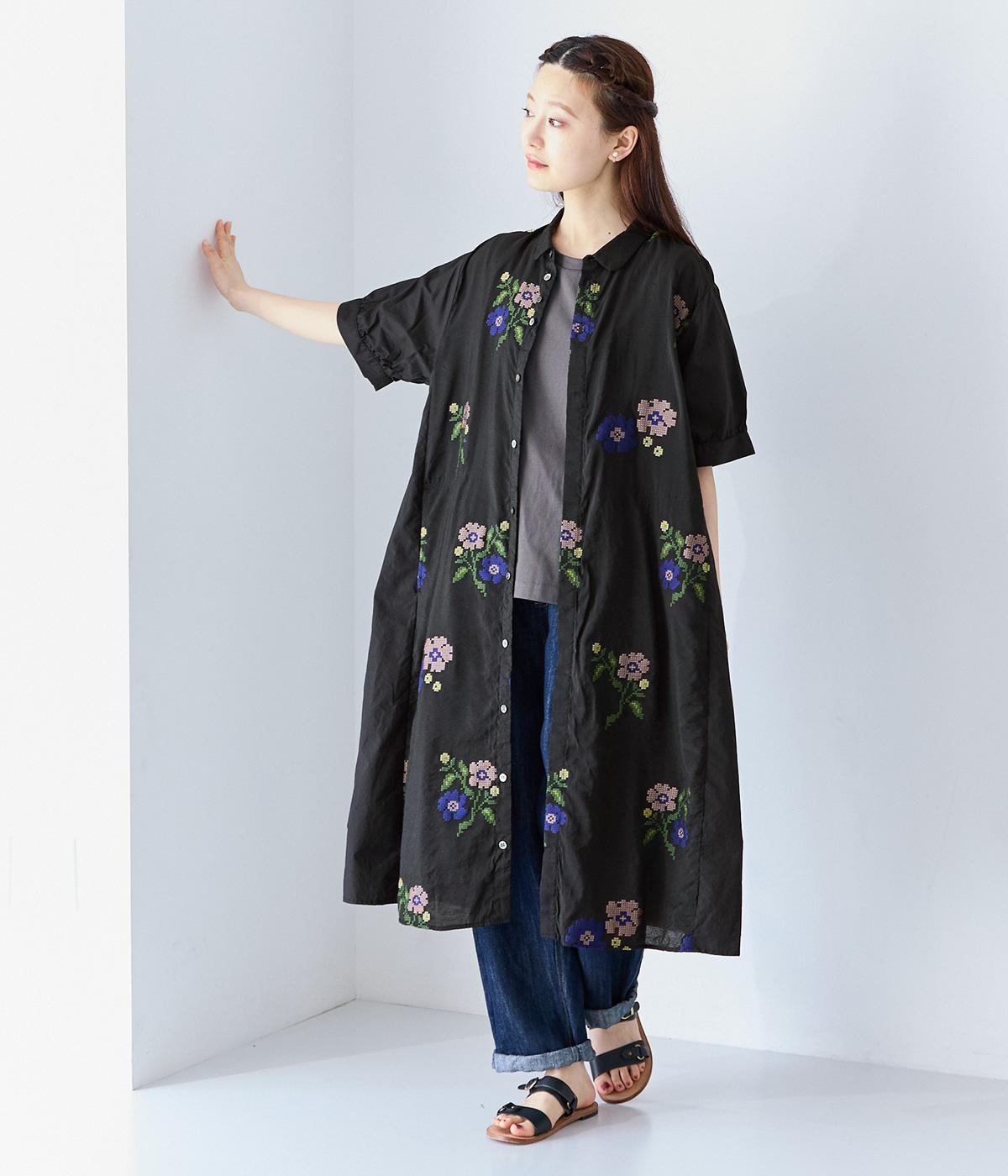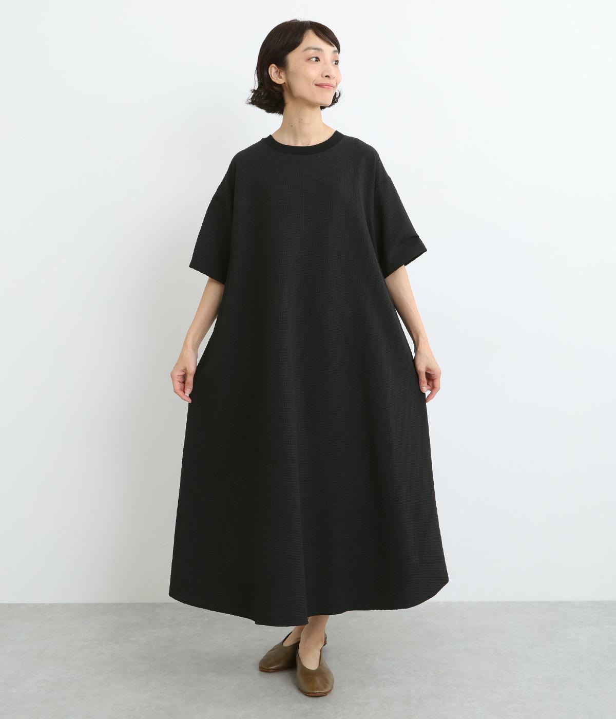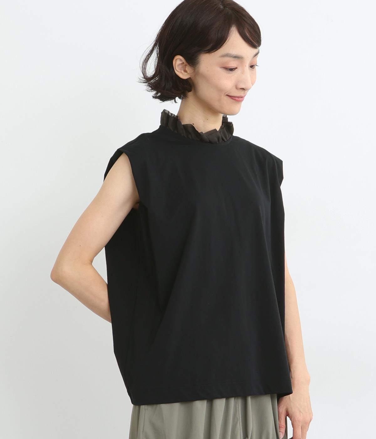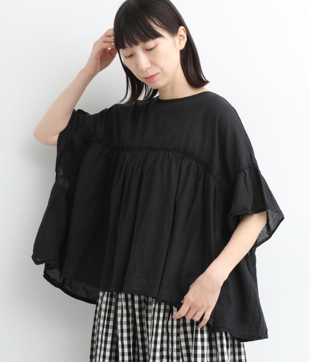 コットン細コール襟フリル切替ギャザーワンピースブラック